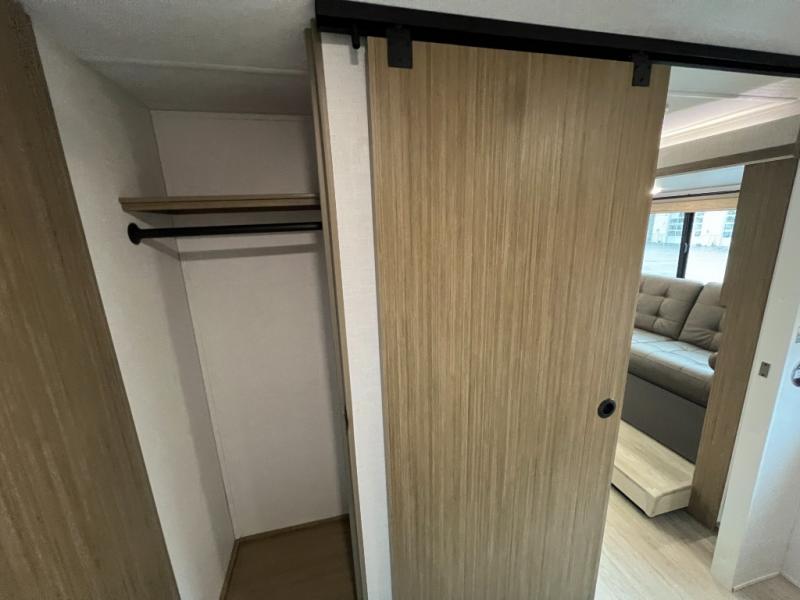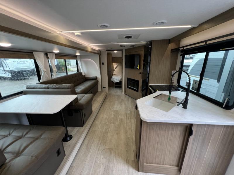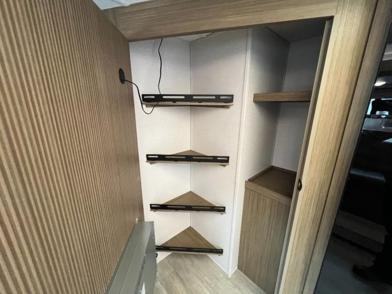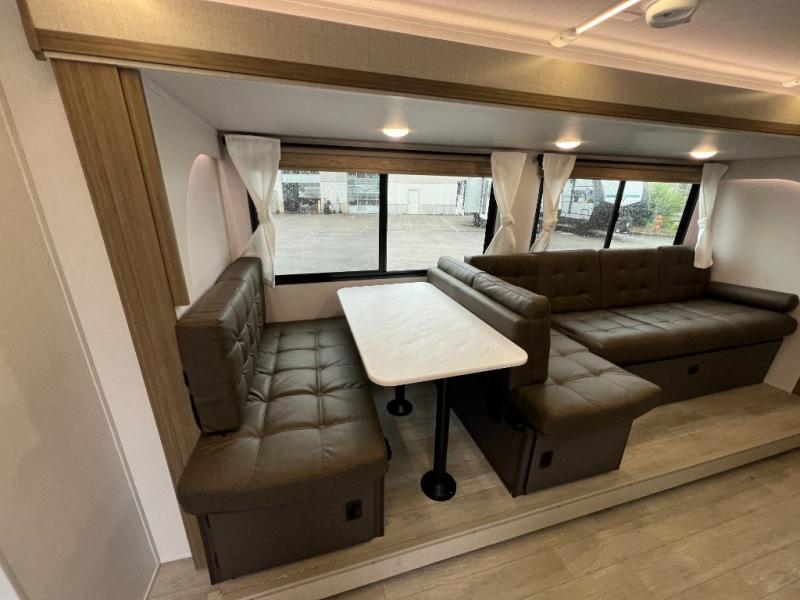 You're sure to make camping memories in this spacious travel trailer! You can sleep four to five people each night thanks to the the custom king bed with Versa Tilt in the front bedroom plus the Versa-Lounge and booth dinette within the large slide out! The full kitchen will let you make meals each day, and you'll appreciate the hidden pantry with shelves behind the fireplace. And don't overlook the full rear bath, complete with a tub/shower and ample counter space for your things.