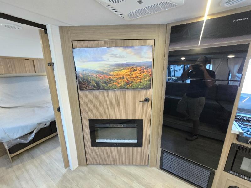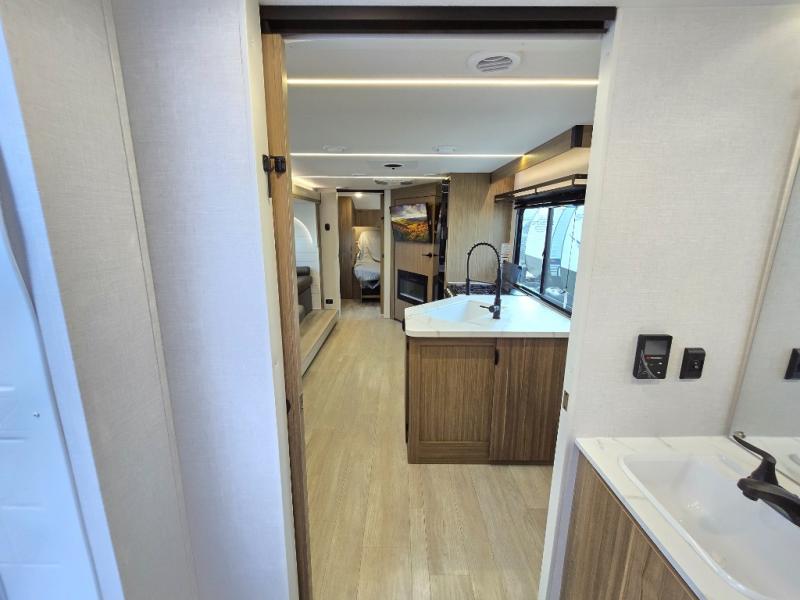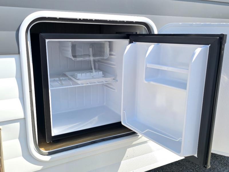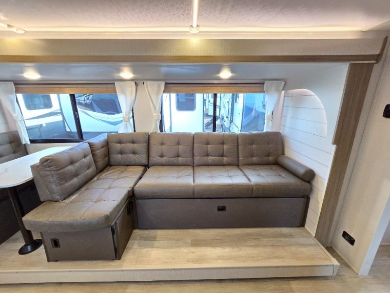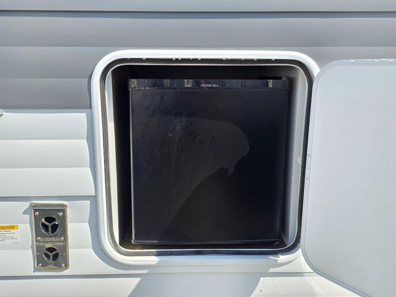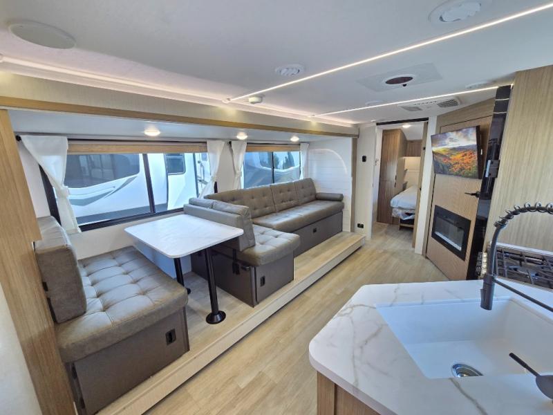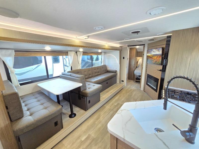 You're sure to make camping memories in this spacious travel trailer! You can sleep four to five people each night thanks to the the custom king bed with Versa Tilt in the front bedroom plus the Versa-Lounge and booth dinette within the large slide out! The full kitchen will let you make meals each day, and you'll appreciate the hidden pantry with shelves behind the fireplace. And don't overlook the full rear bath, complete with a tub/shower and ample counter space for your things.