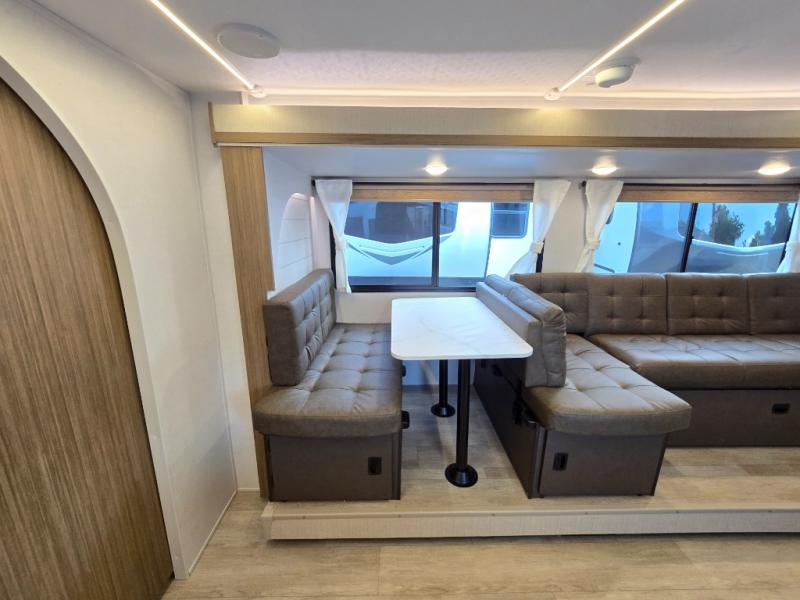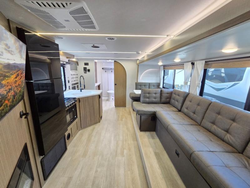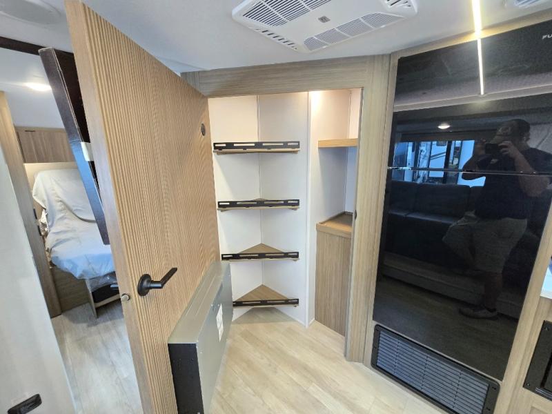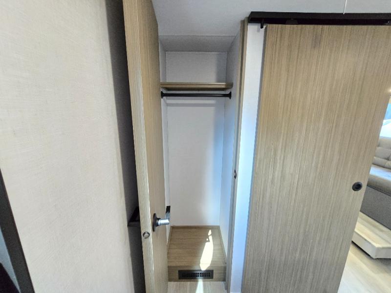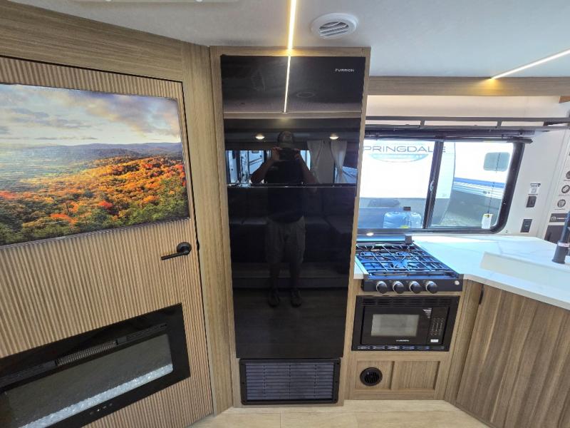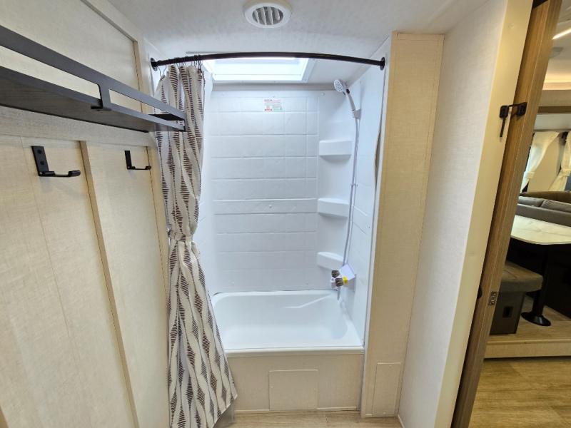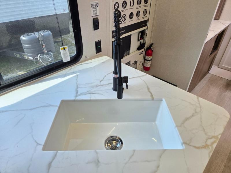 You're sure to make camping memories in this spacious travel trailer! You can sleep four to five people each night thanks to the the custom king bed with Versa Tilt in the front bedroom plus the Versa-Lounge and booth dinette within the large slide out! The full kitchen will let you make meals each day, and you'll appreciate the hidden pantry with shelves behind the fireplace. And don't overlook the full rear bath, complete with a tub/shower and ample counter space for your things.