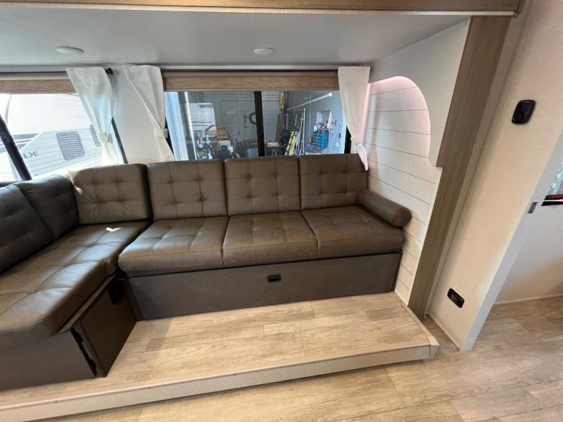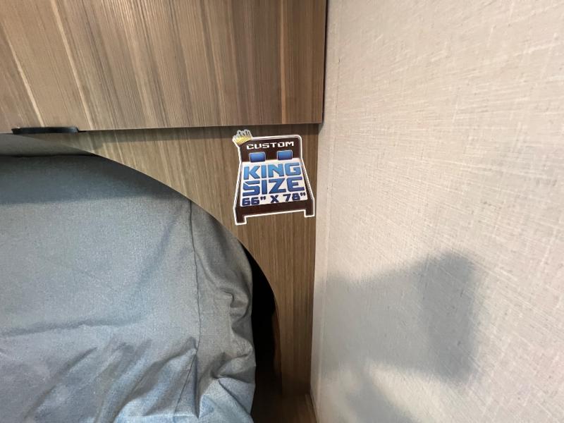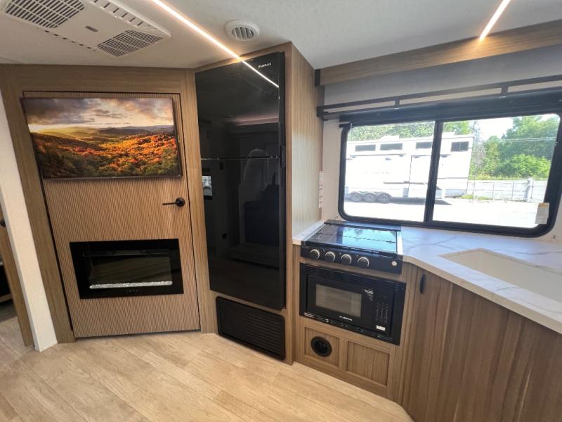 You're sure to make camping memories in this spacious travel trailer! You can sleep four to five people each night thanks to the the custom king bed with Versa Tilt in the front bedroom plus the Versa-Lounge and booth dinette within the large slide out! The full kitchen will let you make meals each day, and you'll appreciate the hidden pantry with shelves behind the fireplace. And don't overlook the full rear bath, complete with a tub/shower and ample counter space for your things.