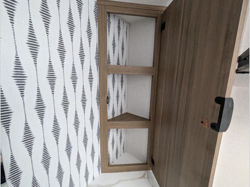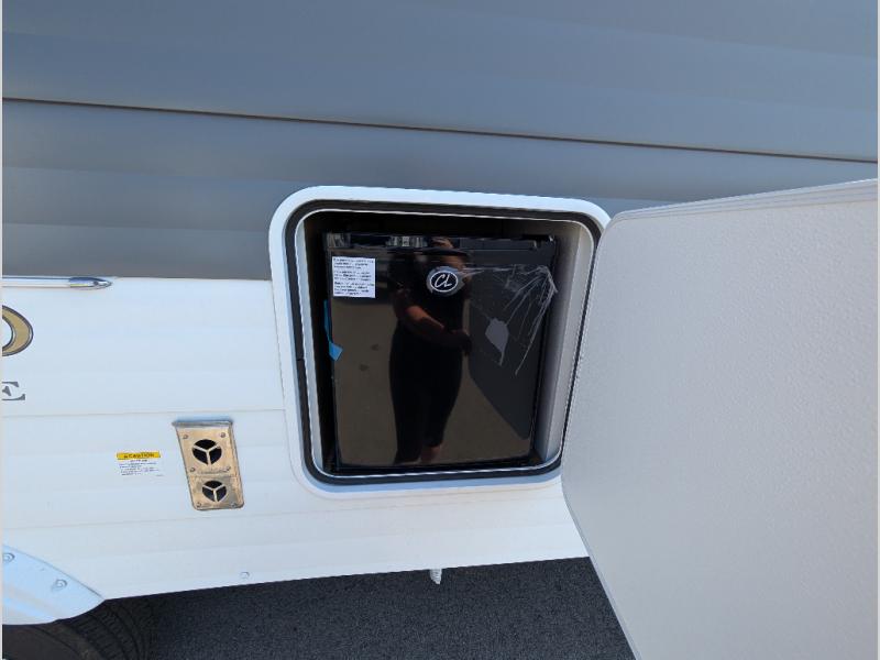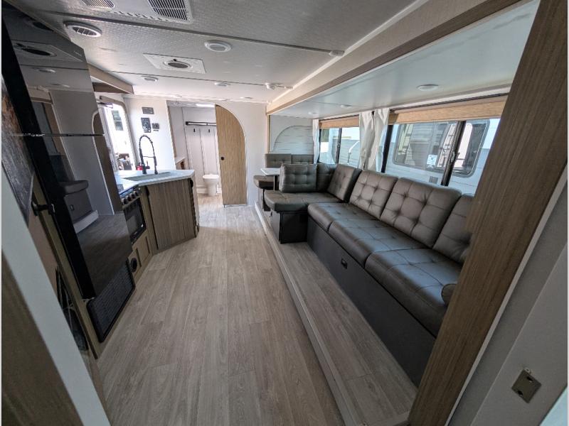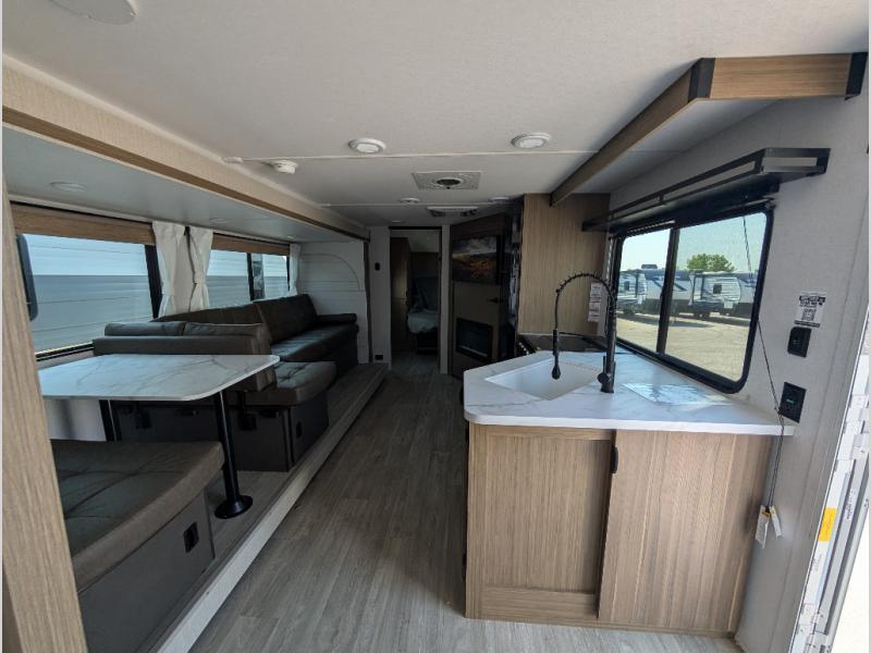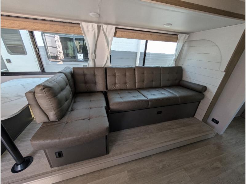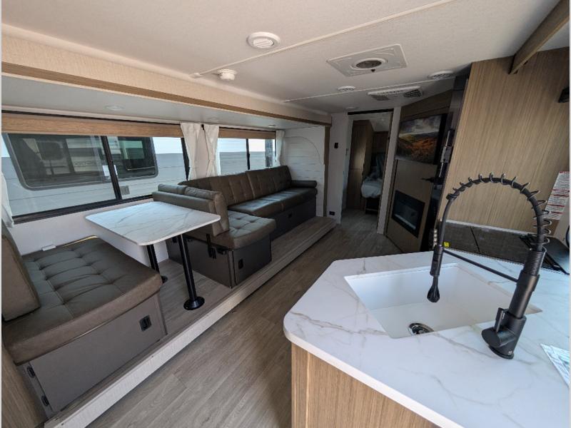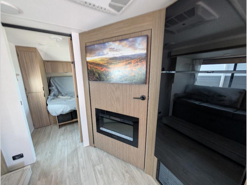 You're sure to make camping memories in this spacious travel trailer! You can sleep four to five people each night thanks to the the custom king bed with Versa Tilt in the front bedroom plus the Versa-Lounge and booth dinette within the large slide out! The full kitchen will let you make meals each day, and you'll appreciate the hidden pantry with shelves behind the fireplace. And don't overlook the full rear bath, complete with a tub/shower and ample counter space for your things.
