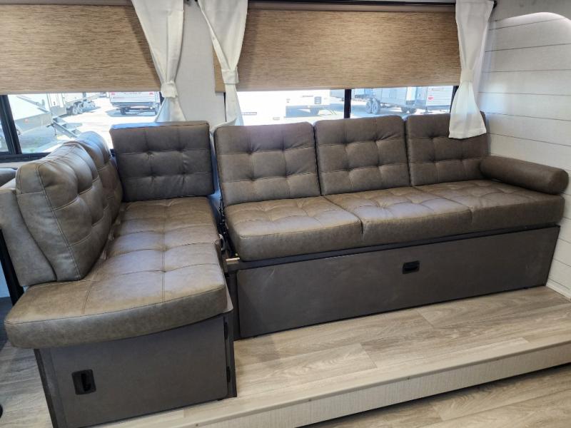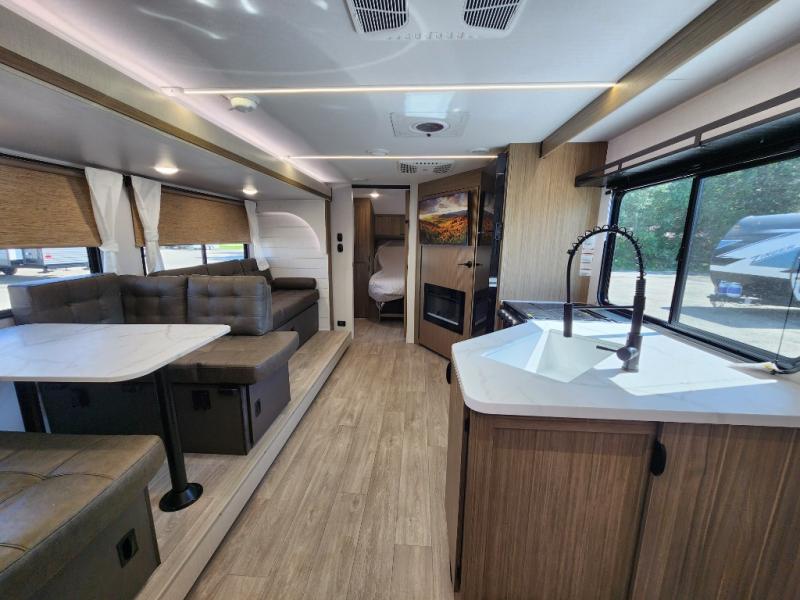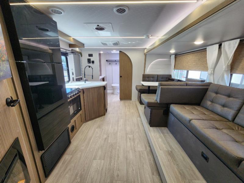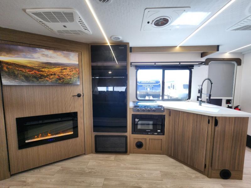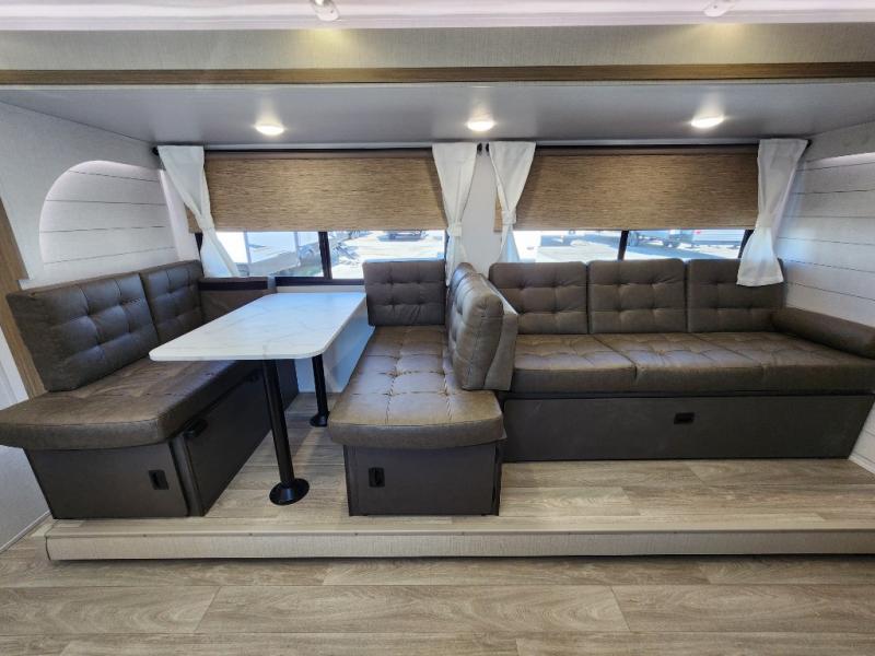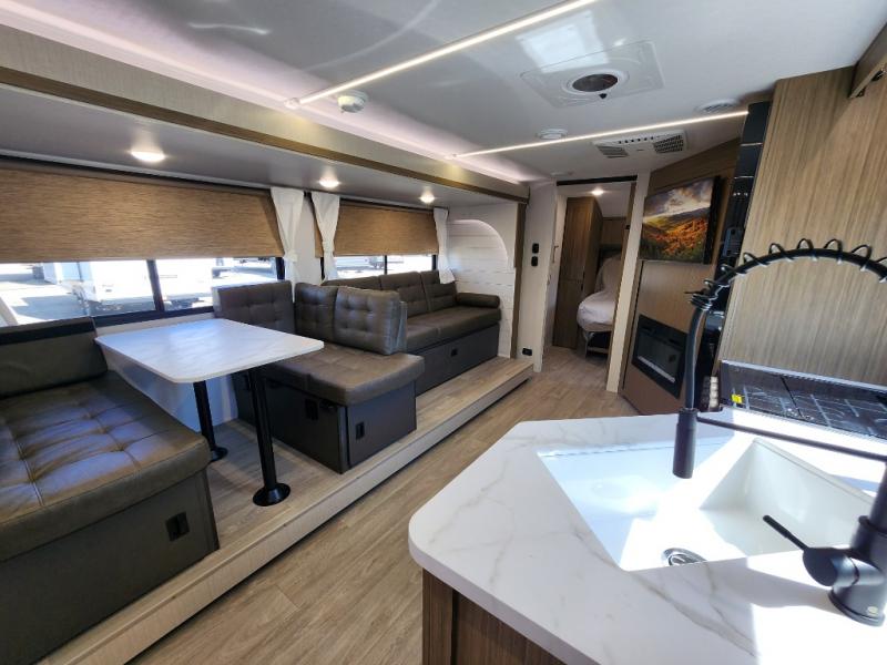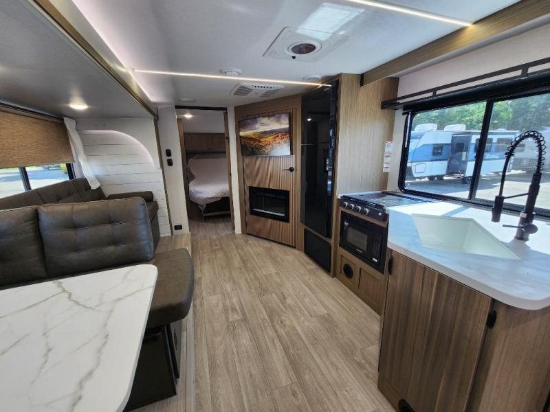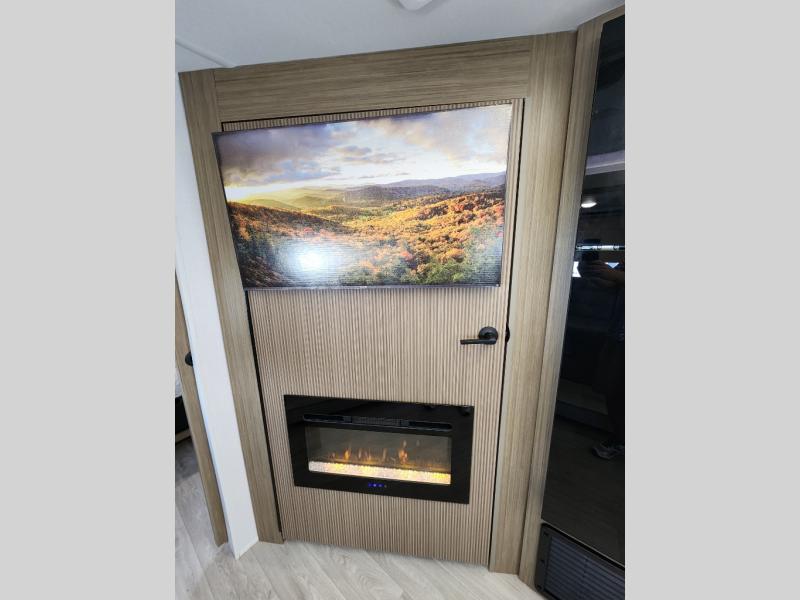 You're sure to make camping memories in this spacious travel trailer! You can sleep four to five people each night thanks to the the custom king bed with Versa Tilt in the front bedroom plus the Versa-Lounge and booth dinette within the large slide out! The full kitchen will let you make meals each day, and you'll appreciate the hidden pantry with shelves behind the fireplace. And don't overlook the full rear bath, complete with a tub/shower and ample counter space for your things.