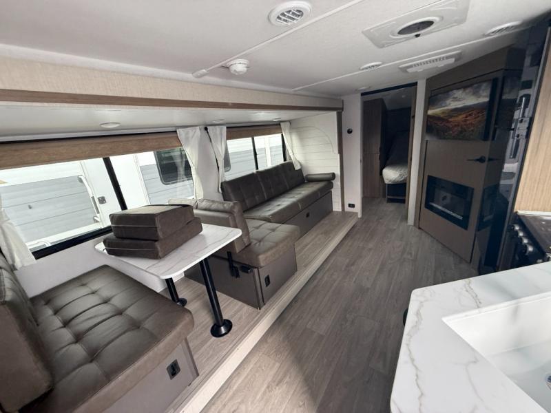 You're sure to make camping memories in this spacious travel trailer! You can sleep four to five people each night thanks to the the custom king bed with Versa Tilt in the front bedroom plus the Versa-Lounge and booth dinette within the large slide out! The full kitchen will let you make meals each day, and you'll appreciate the hidden pantry with shelves behind the fireplace. And don't overlook the full rear bath, complete with a tub/shower and ample counter space for your things.