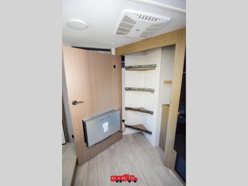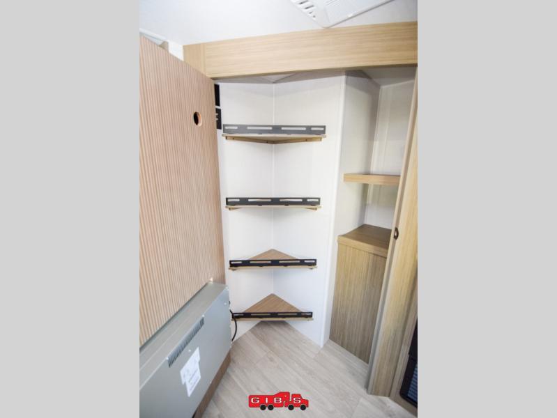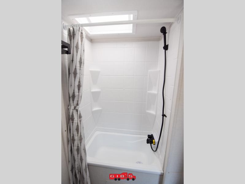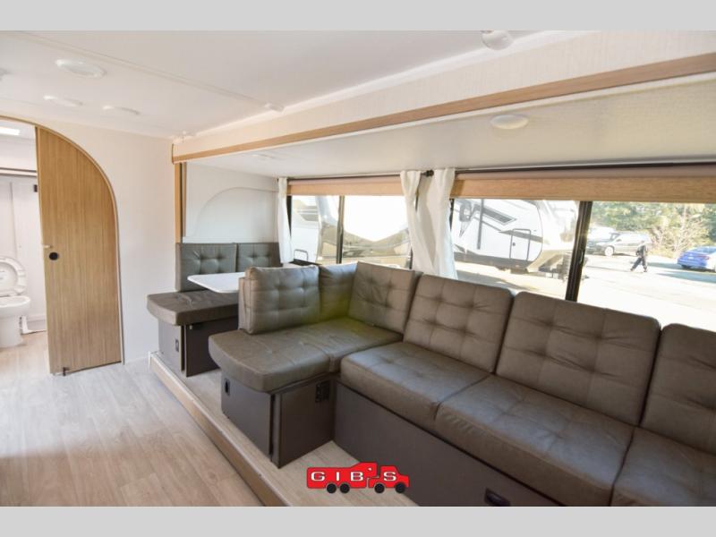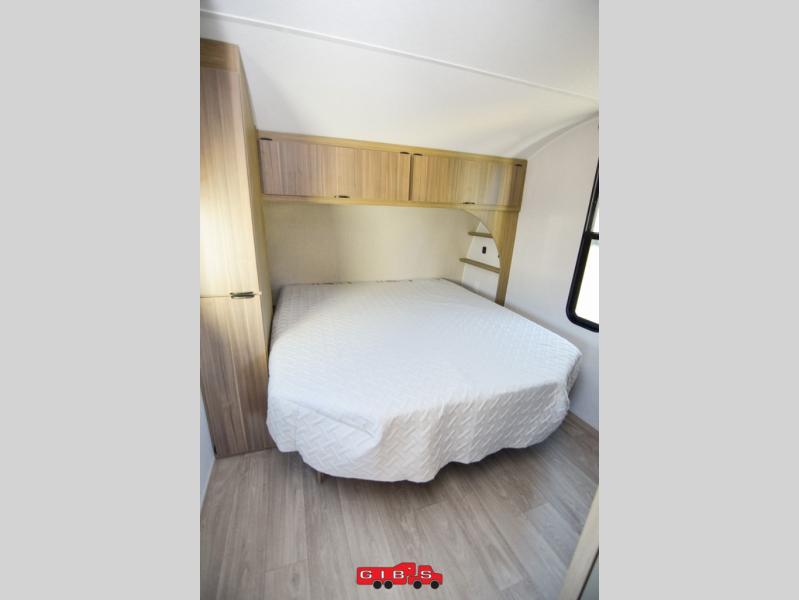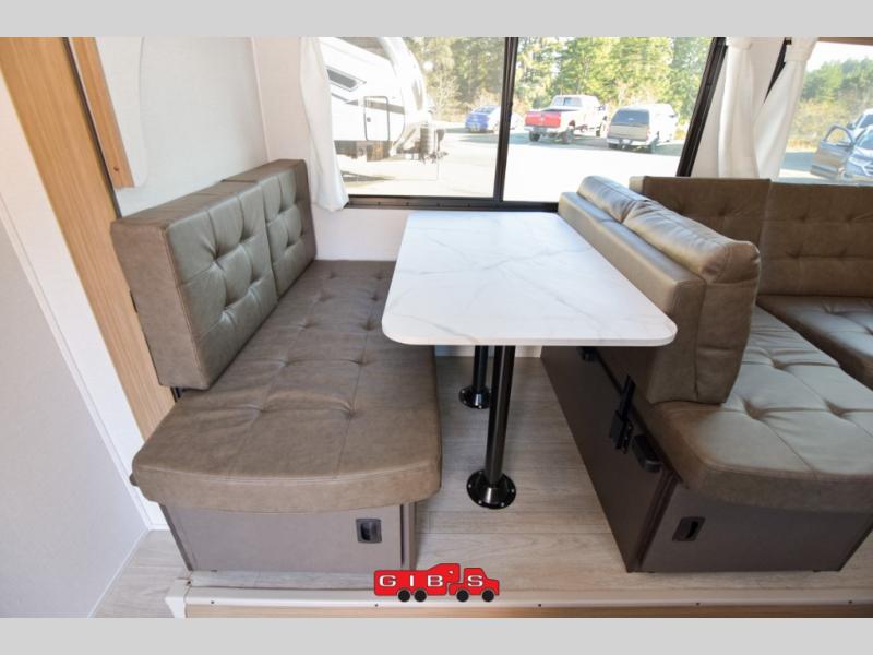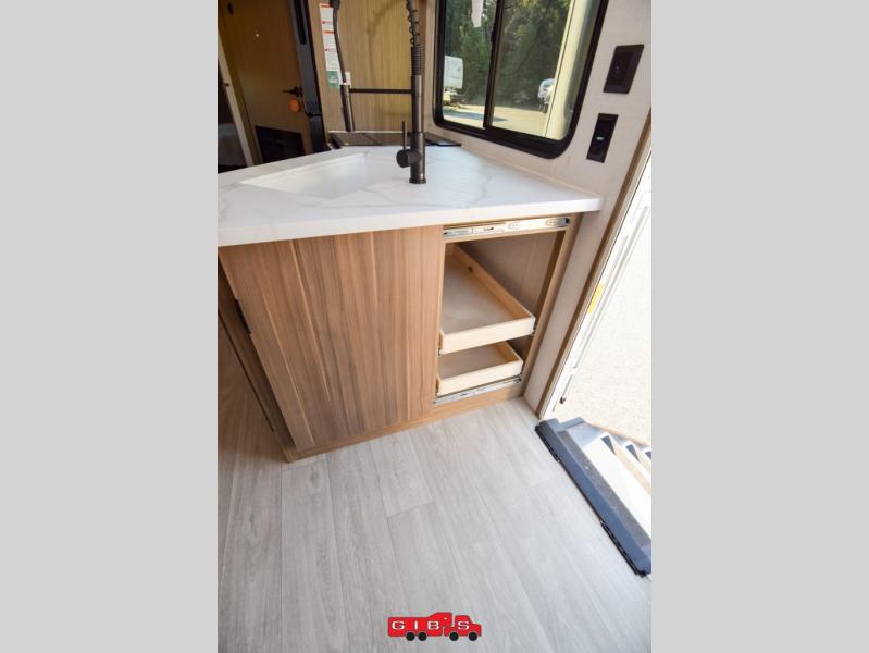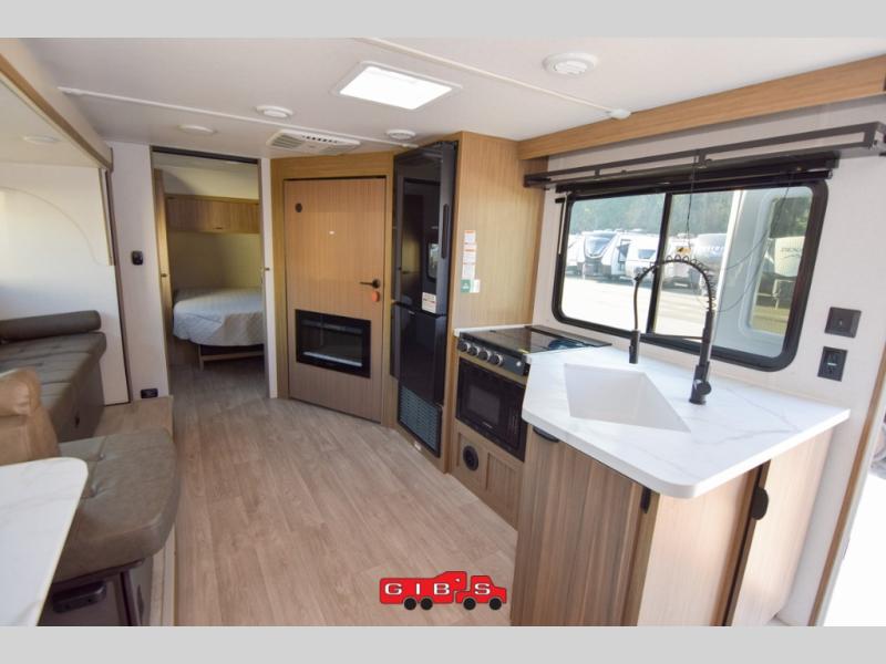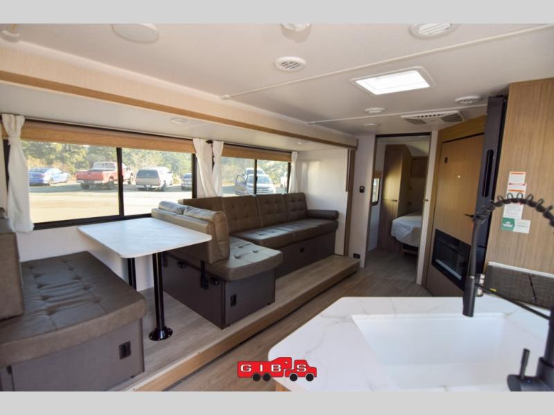 You're sure to make camping memories in this spacious travel trailer! You can sleep four to five people each night thanks to the the custom king bed with Versa Tilt in the front bedroom plus the Versa-Lounge and booth dinette within the large slide out! The full kitchen will let you make meals each day, and you'll appreciate the hidden pantry with shelves behind the fireplace. And don't overlook the full rear bath, complete with a tub/shower and ample counter space for your things.