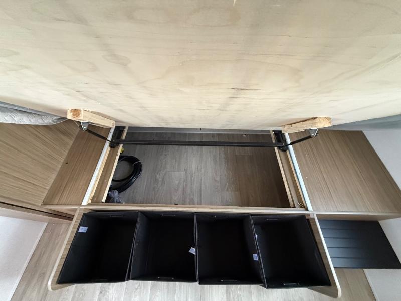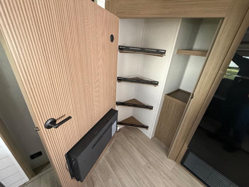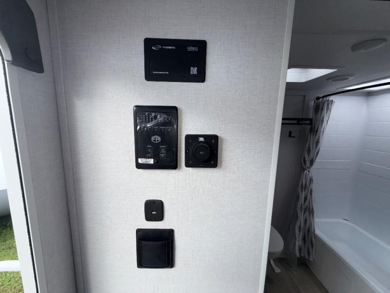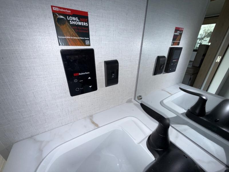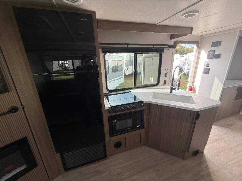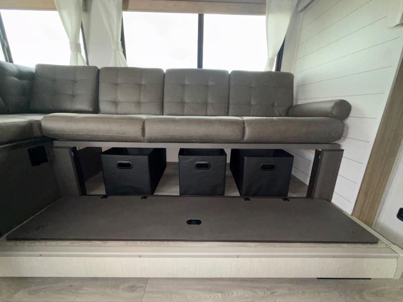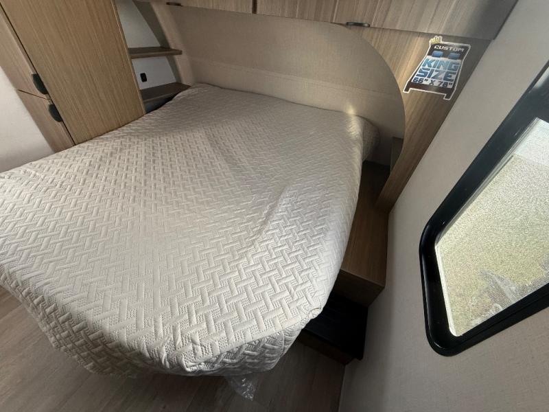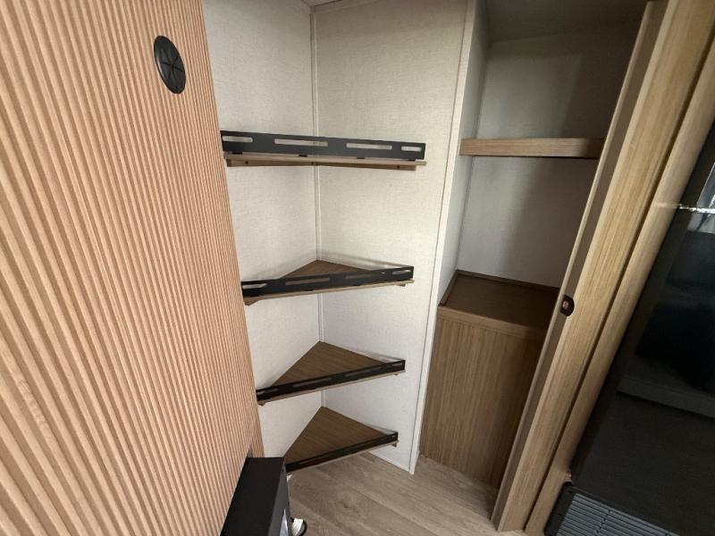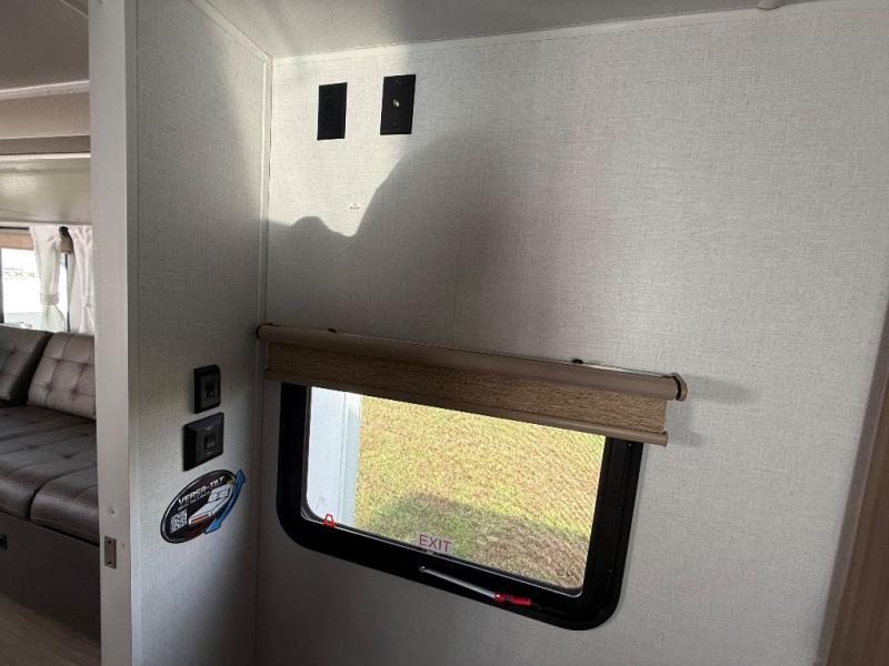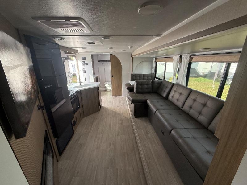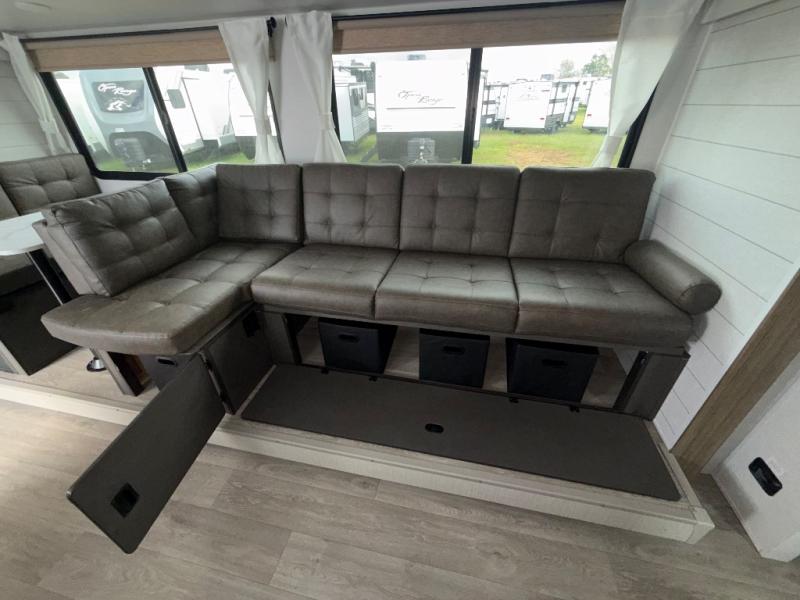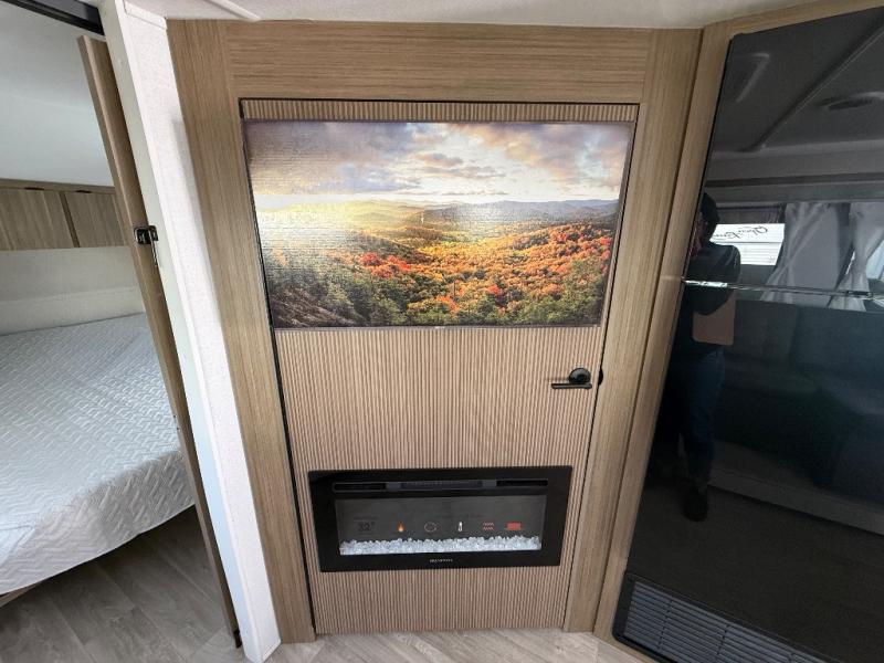 You're sure to make camping memories in this spacious travel trailer! You can sleep four to five people each night thanks to the the custom king bed with Versa Tilt in the front bedroom plus the Versa-Lounge and booth dinette within the large slide out! The full kitchen will let you make meals each day, and you'll appreciate the hidden pantry with shelves behind the fireplace. And don't overlook the full rear bath, complete with a tub/shower and ample counter space for your things.