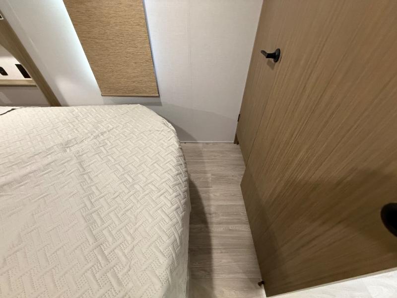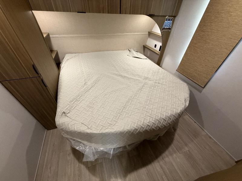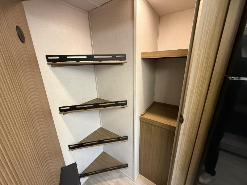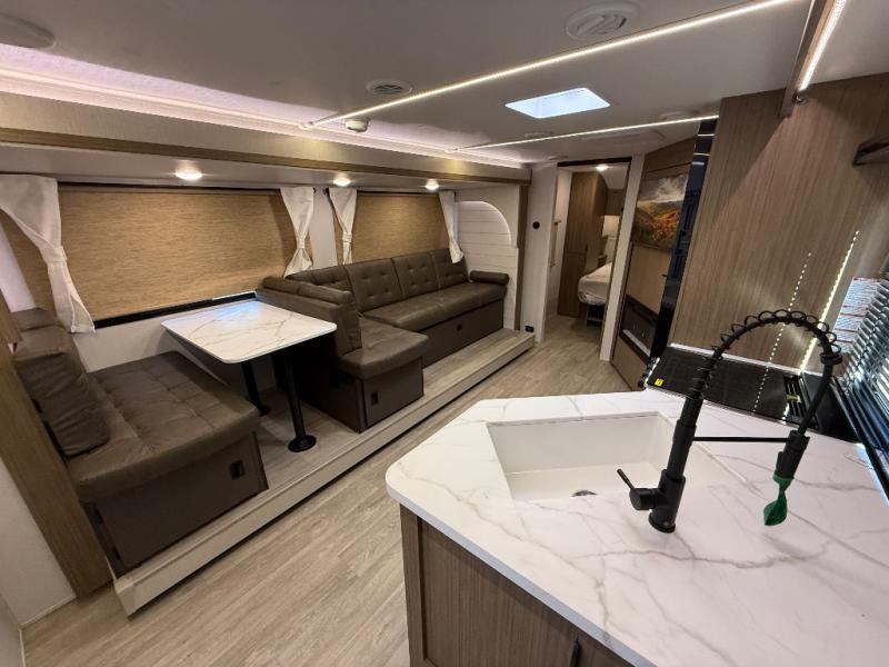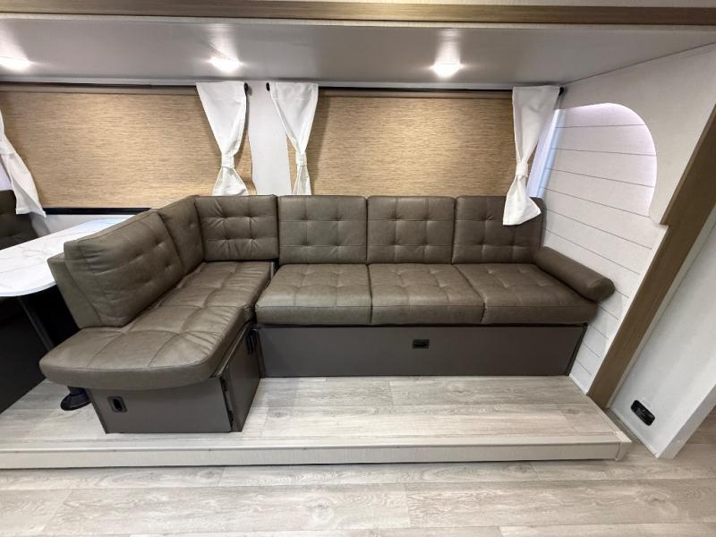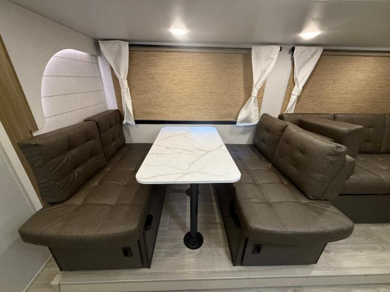 You're sure to make camping memories in this spacious travel trailer! You can sleep four to five people each night thanks to the the custom king bed with Versa Tilt in the front bedroom plus the Versa-Lounge and booth dinette within the large slide out! The full kitchen will let you make meals each day, and you'll appreciate the hidden pantry with shelves behind the fireplace. And don't overlook the full rear bath, complete with a tub/shower and ample counter space for your things.
