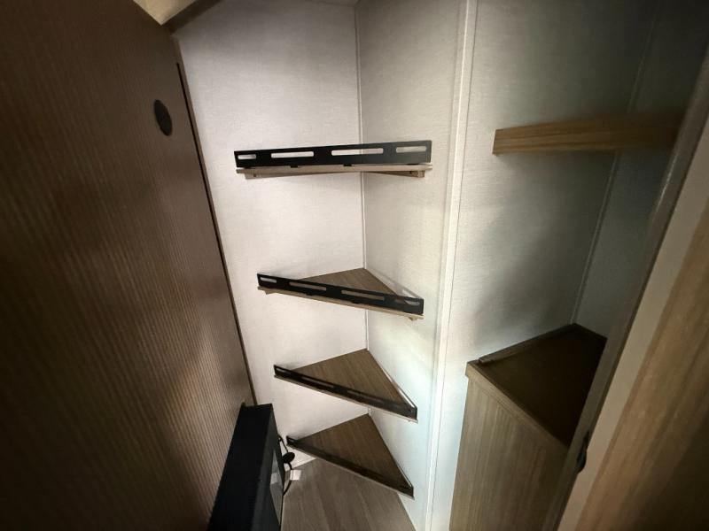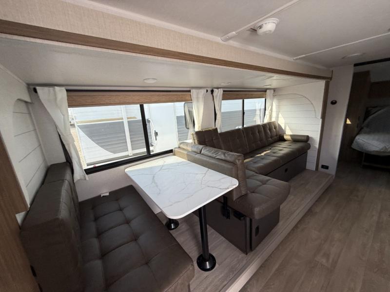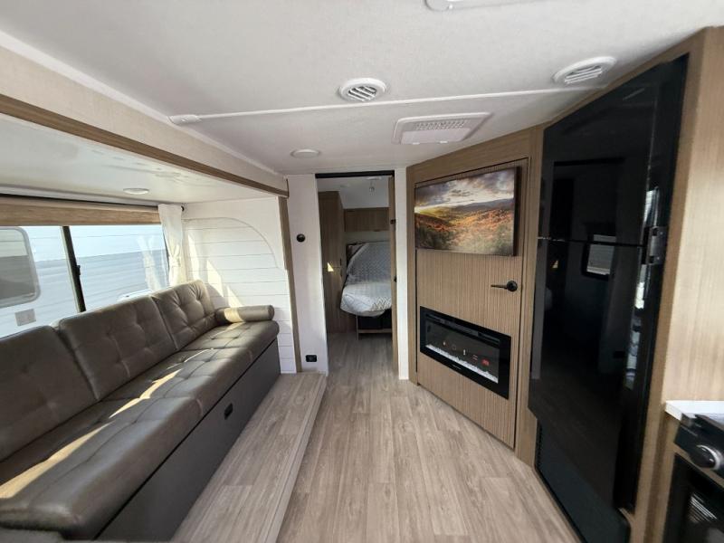 You're sure to make camping memories in this spacious travel trailer! You can sleep four to five people each night thanks to the the custom king bed with Versa Tilt in the front bedroom plus the Versa-Lounge and booth dinette within the large slide out! The full kitchen will let you make meals each day, and you'll appreciate the hidden pantry with shelves behind the fireplace. And don't overlook the full rear bath, complete with a tub/shower and ample counter space for your things.