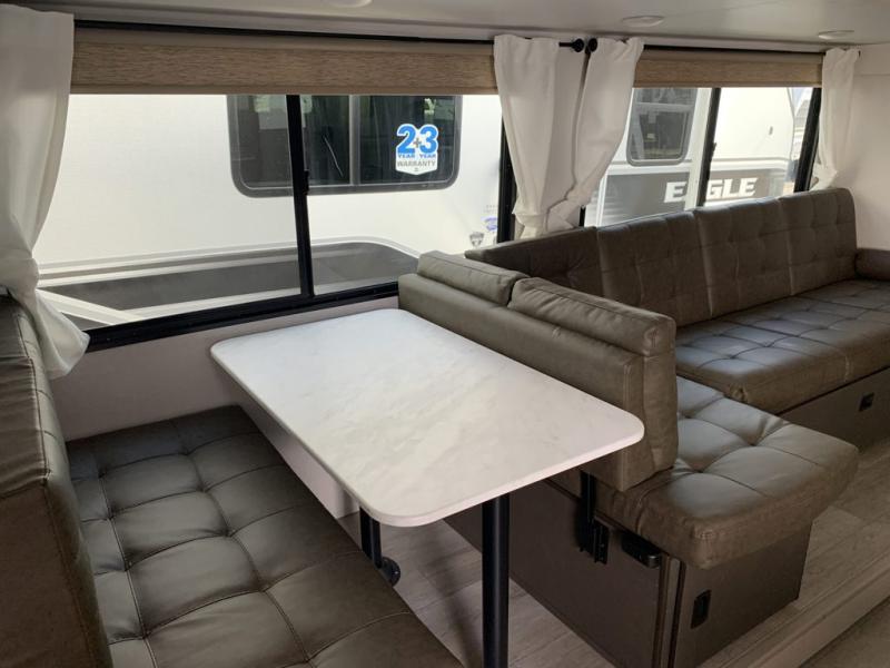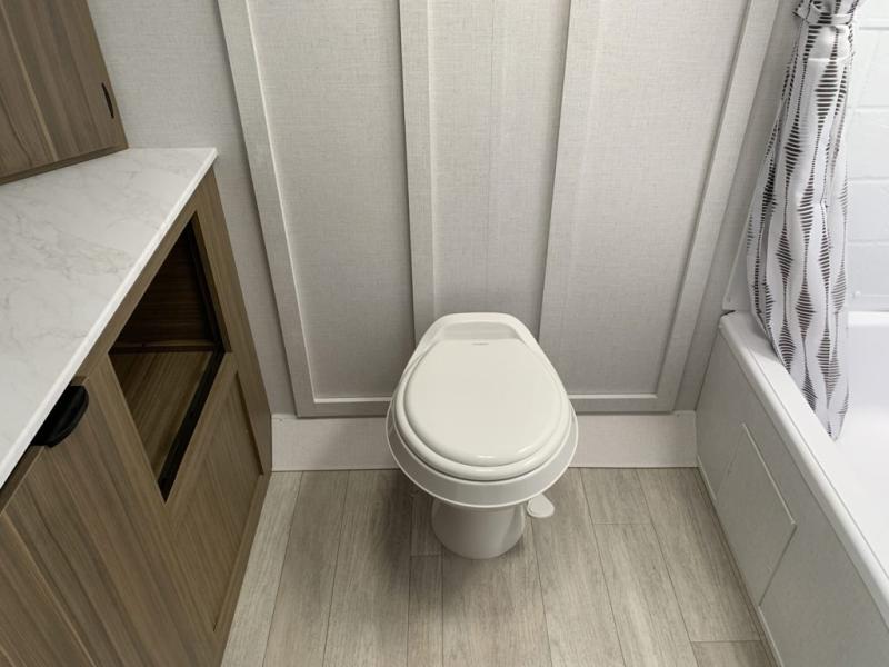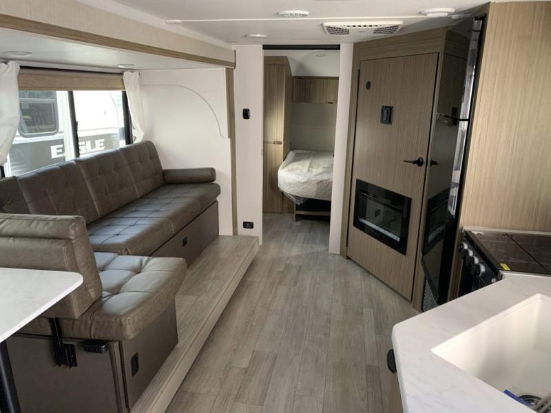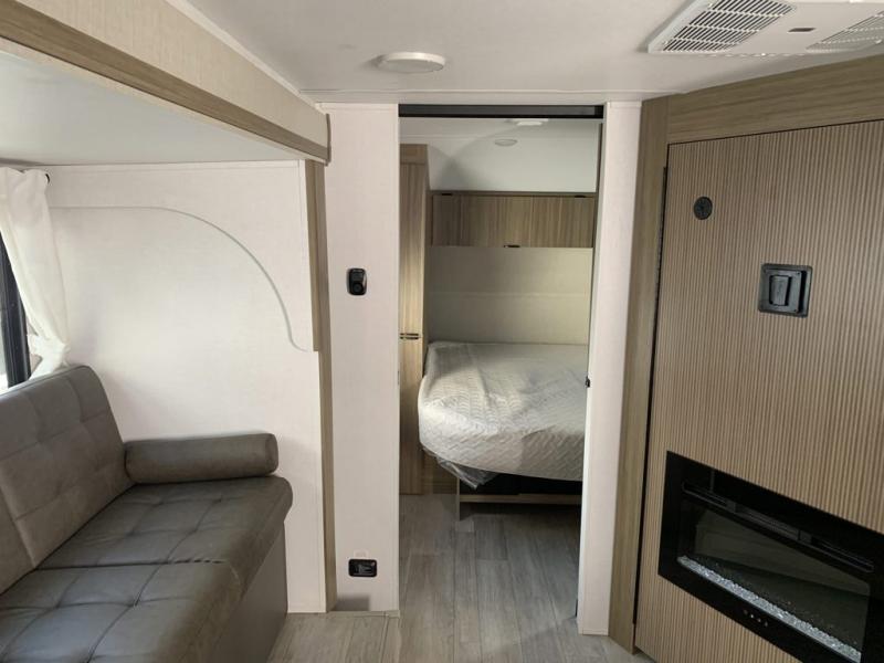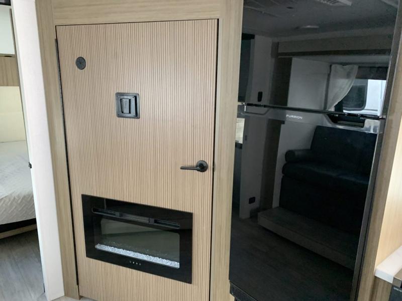 You're sure to make camping memories in this spacious travel trailer! You can sleep four to five people each night thanks to the custom king bed with Versa Tilt in the front bedroom plus the Versa-Lounge and booth dinette within the large slide out! The full kitchen will let you make meals each day, and you'll appreciate the hidden pantry with shelves behind the fireplace. And don't overlook the full rear bath, complete with a tub/shower and ample counter space for your things.