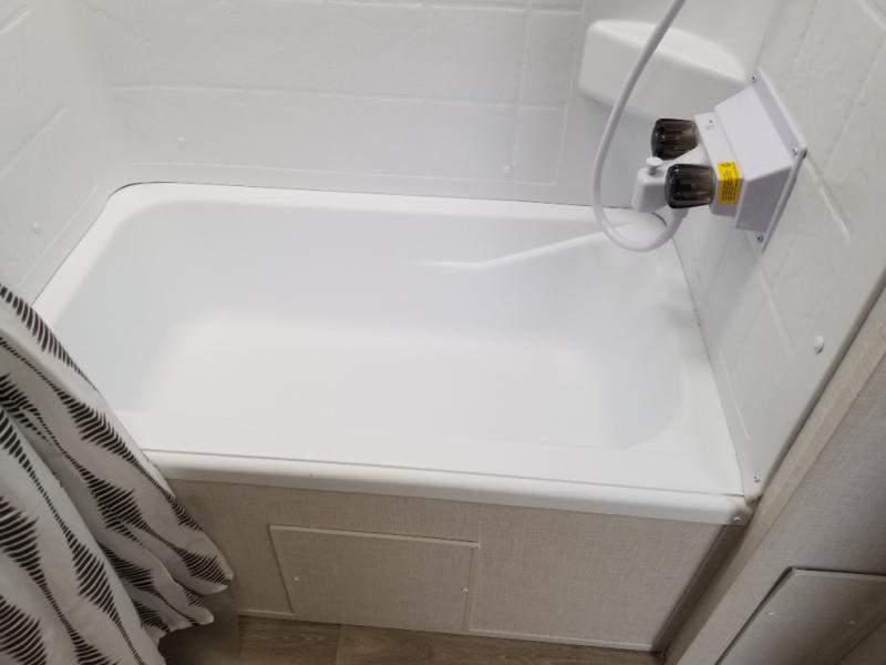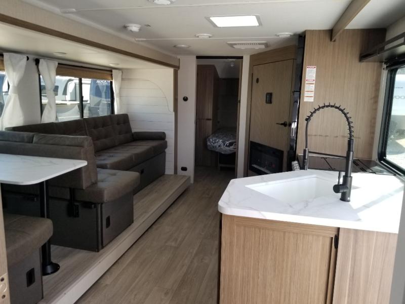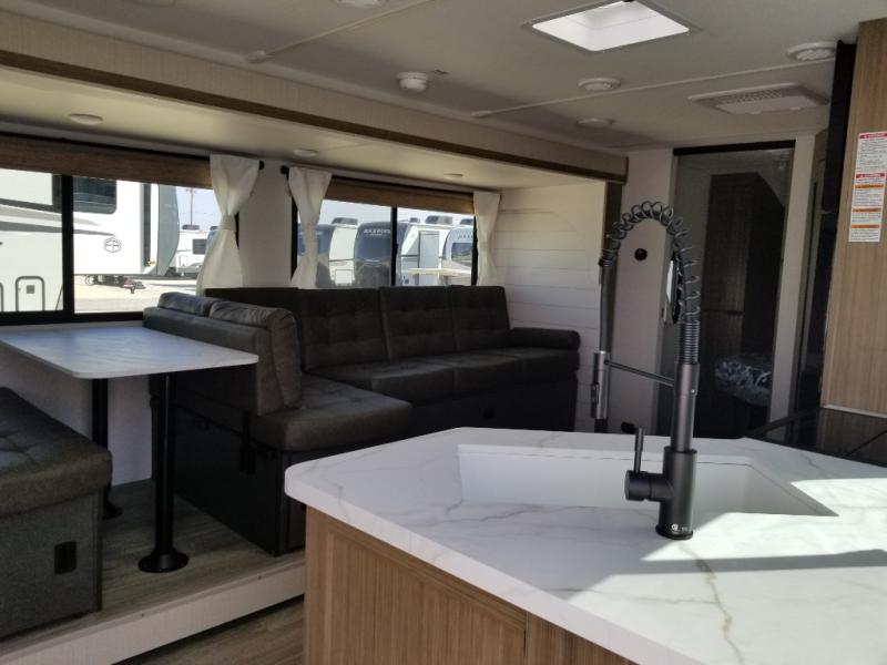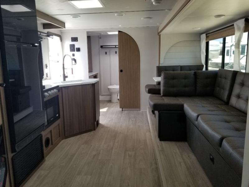 You're sure to make camping memories in this spacious travel trailer! You can sleep four to five people each night thanks to the custom king bed with Versa Tilt in the front bedroom plus the Versa-Lounge and booth dinette within the large slide out! The full kitchen will let you make meals each day, and you'll appreciate the hidden pantry with shelves behind the fireplace. And don't overlook the full rear bath, complete with a tub/shower and ample counter space for your things.