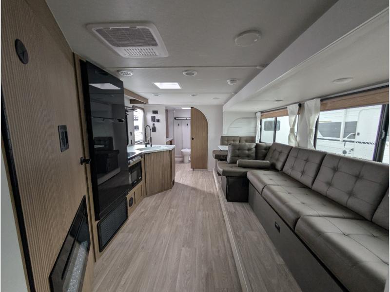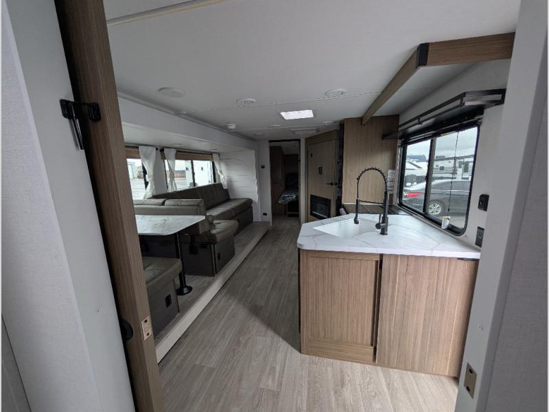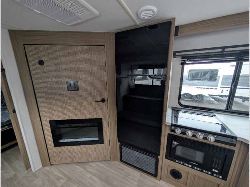 You're sure to make camping memories in this spacious travel trailer! You can sleep four to five people each night thanks to the custom king bed with Versa Tilt in the front bedroom plus the Versa-Lounge and booth dinette within the large slide out! The full kitchen will let you make meals each day, and you'll appreciate the hidden pantry with shelves behind the fireplace. And don't overlook the full rear bath, complete with a tub/shower and ample counter space for your things.
