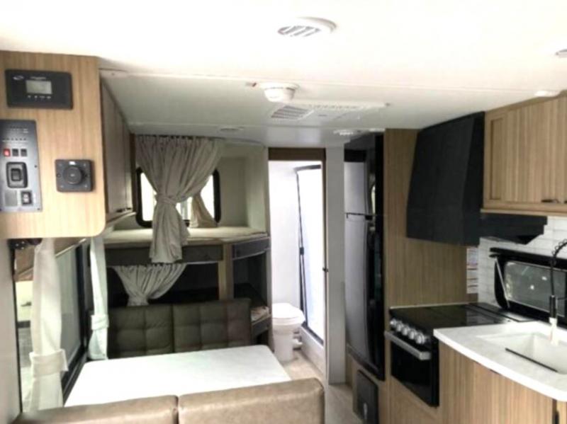 This Wildwood X-Lite travel trailer is packed with features! There is a walk-around custom king bed with Versa-Tilt up at the front that can be sectioned off from the rest of the trailer with a privacy curtain, and the double-size bunks in the back of this trailer will provide you with a compact sleeping space for your little ones. The booth dinette is going to be a great place to sit down together and have a meal when the bugs are too bad outside to sit at the picnic table, and there is also a sofa for relaxation while inside. A full kitchen inside will let you create meals each day, and there is also an outside camp kitchen option for more choices when cooking for the family.