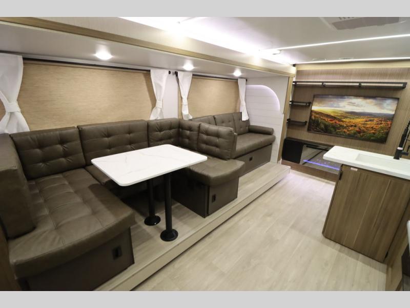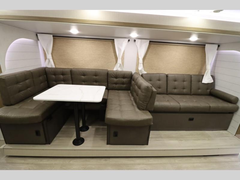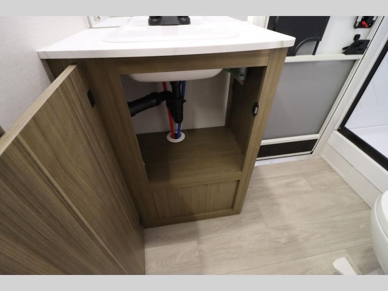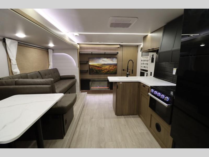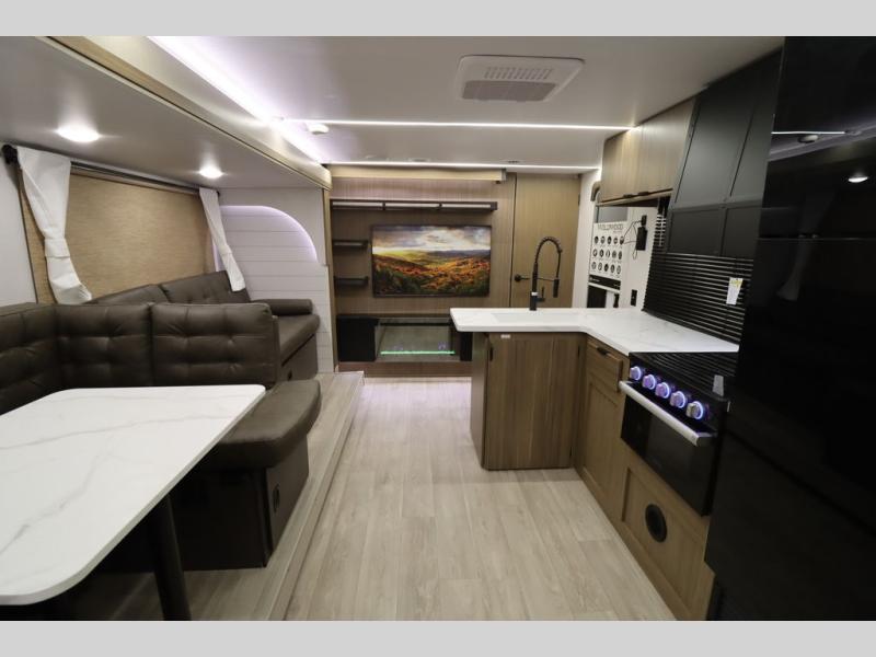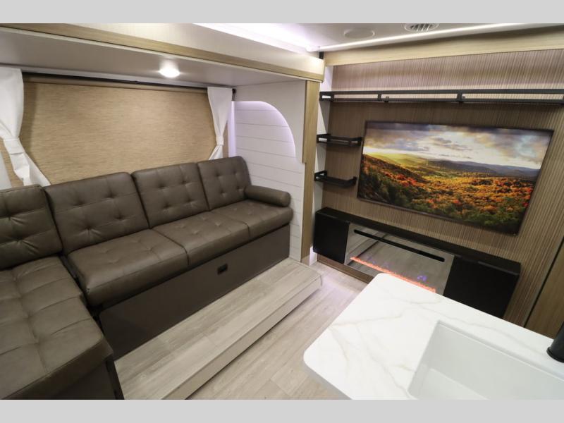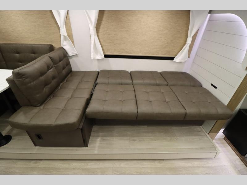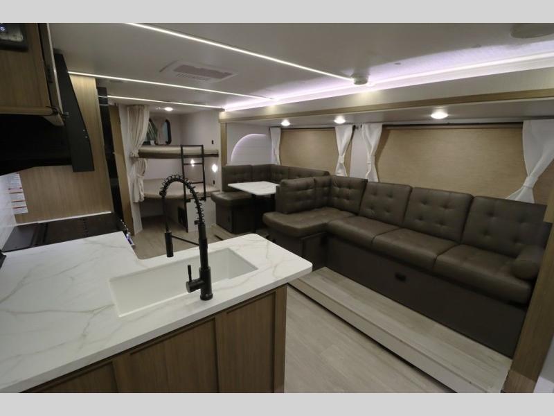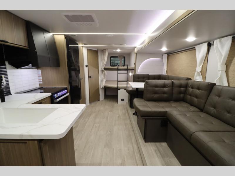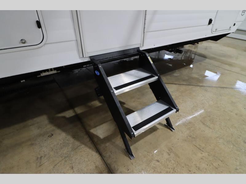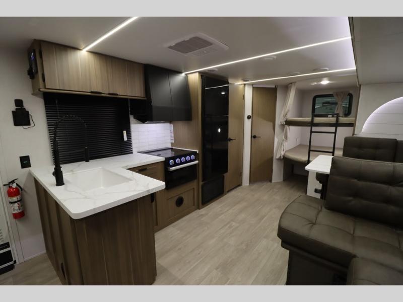 If you need a trailer that will enhance your family getaways, this Wildwood X-Lite travel trailer is it! Because of the double-size bunks in the back and the custom king bed with Versa-Tilt in the front private bedroom, your family can stretch out and sleep comfortably, and the Versa Lounge, which is made up of a U-shaped dinette and sofa, can also transform into extra sleeping space if needed. The whole family will enjoy how accessible the full bathroom is because it contains both an interior and exterior entry door, and the entertainment center with a fireplace is certainly going to enrich your time spent indoors. You will also enjoy the exterior camp kitchen with a griddle for breakfast outdoors!