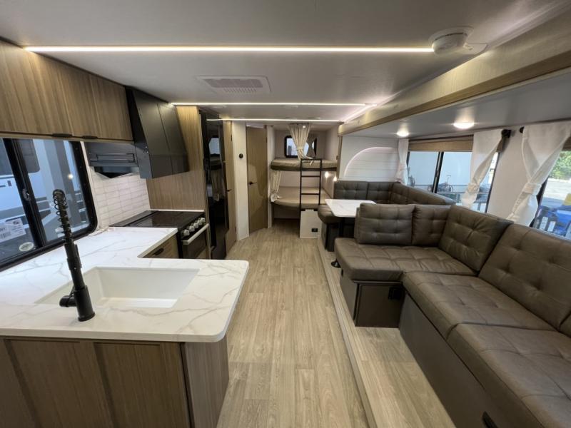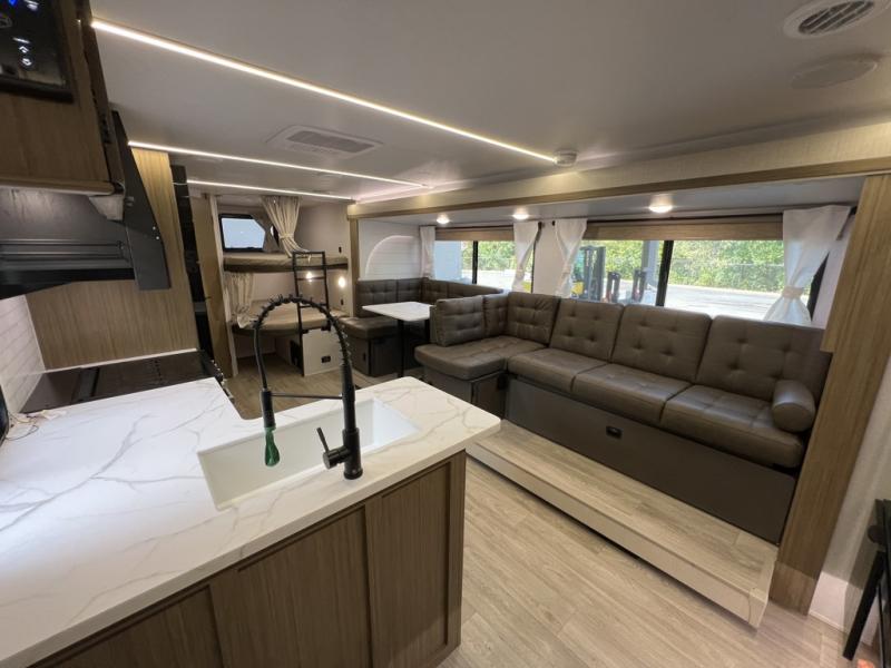 If you need a trailer that will enhance your family getaways, this Wildwood X-Lite travel trailer is it! Because of the double-size bunks in the back and the custom king bed with Versa-Tilt in the front private bedroom, your family can stretch out and sleep comfortably, and the Versa Lounge, which is made up of a U-shaped dinette and sofa, can also transform into extra sleeping space if needed. The whole family will enjoy how accessible the full bathroom is because it contains both an interior and exterior entry door, and the entertainment center with a fireplace is certainly going to enrich your time spent indoors. You will also enjoy the exterior camp kitchen with a griddle for breakfast outdoors!