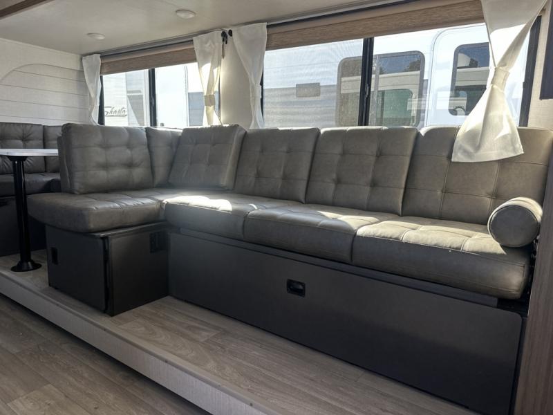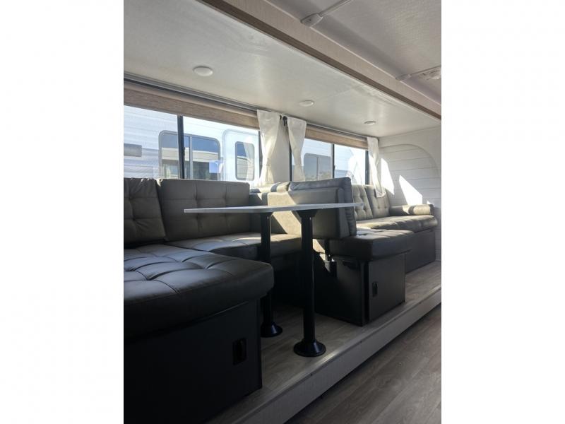 If you need a trailer that will enhance your family getaways, this Wildwood X-Lite travel trailer is it! Because of the double-size bunks in the back and the custom king bed with Versa-Tilt in the front private bedroom, your family can stretch out and sleep comfortably, and the Versa Lounge, which is made up of a U-shaped dinette and sofa, can also transform into extra sleeping space if needed. And your whole crew will love to relax by the fireplace in the evenings. Outside, a full pass-thru storage keeps your things packed away and a 15' patio awning gives you shade!