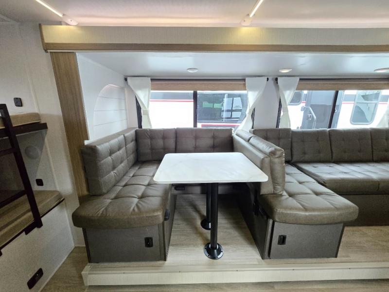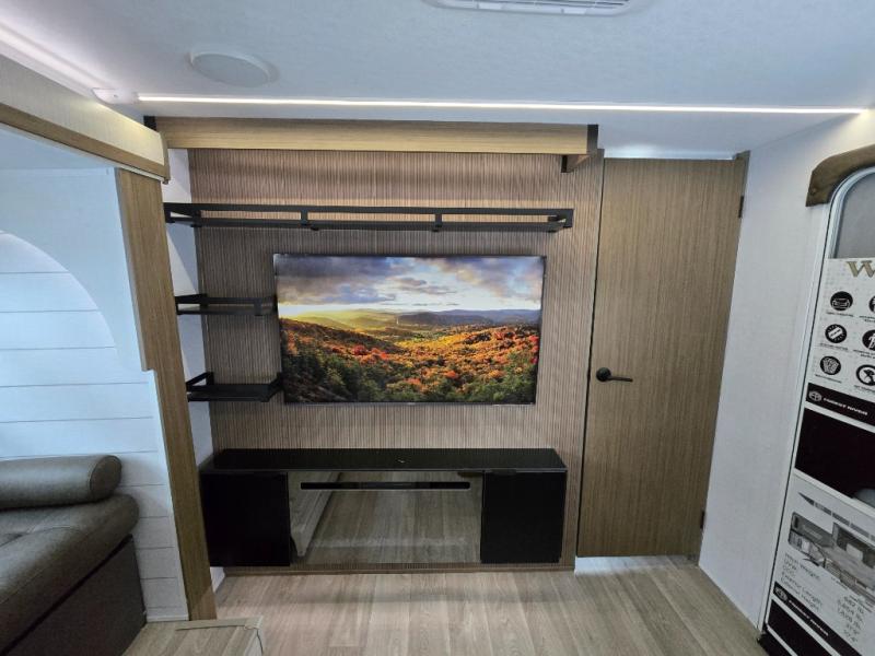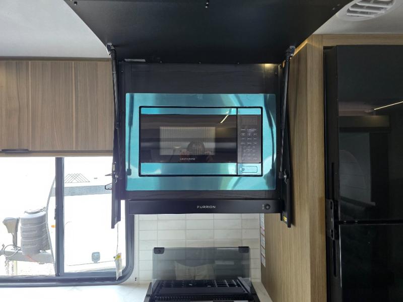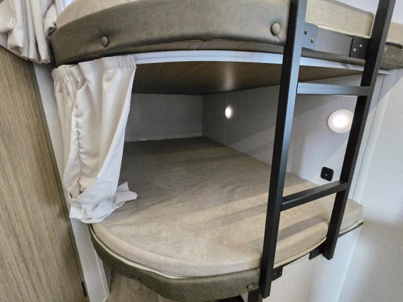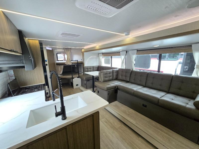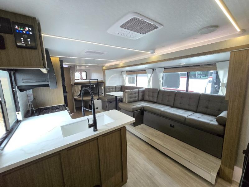 If you need a trailer that will enhance your family getaways, this Wildwood X-Lite Platinum travel trailer is it! Because of the double-size bunks in the back and the custom king bed with Versa-Tilt in the front private bedroom, your family can stretch out and sleep comfortably, and the Versa Lounge, which is made up of a U-shaped dinette and sofa, can also transform into extra sleeping space if needed. The whole family will enjoy how accessible the full bathroom is because it contains both an interior and exterior entry door, and the entertainment center with a fireplace is certainly going to enrich your time spent indoors. Enjoy breakfast outdoors with the outside camp kitchen too!