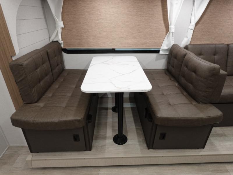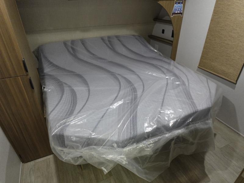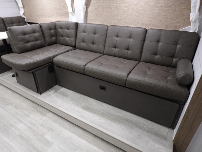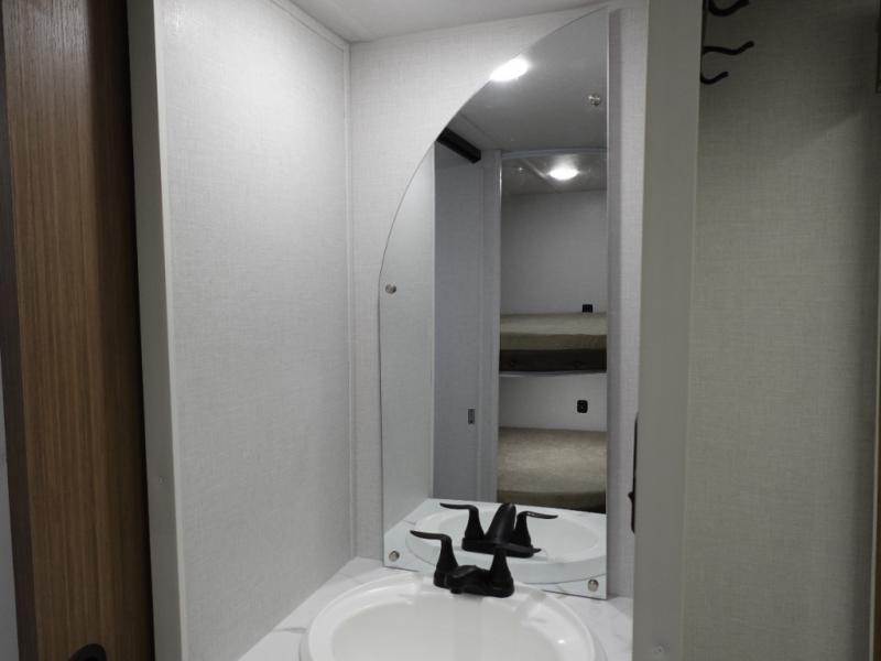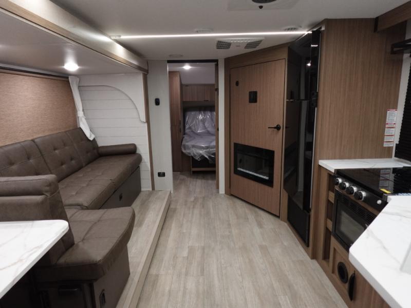 You're sure to make camping memories in this spacious travel trailer! You can easily sleep eight people each night thanks to the double-size bunks, the custom king bed with Versa Tilt in the front bedroom plus the Versa-Lounge within the large slide out! The full kitchen will let you make meals each day, and you'll appreciate the hidden pantry with shelves behind the fireplace. There is also a booth dinette where you can dine together or play a game of cards after dinner is cleaned up, or you may just find yourselves outdoors under the 16' awning. And don't overlook the full bath, complete with a tub/shower that will make bath time easier if you have little ones.