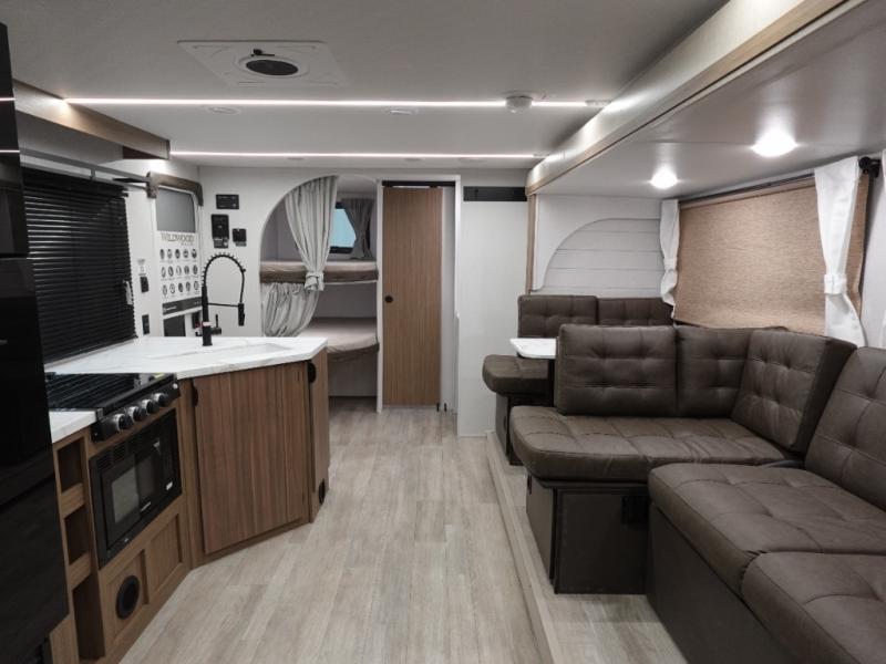 The Wildwood X-Lite travel trailers are packed with hassle-free camping amenities! The enclosed Accessibelly will help protect against the elements and debris during transport, and the exterior retro/metal redesign is sure to be eye-catching! There are stylish roller shades inside, along with updated backsplash, elegant curtain rods and curtains, plus many more interior comforts! Choose a Wildwood X-Lite travel trailer today for quality and value!