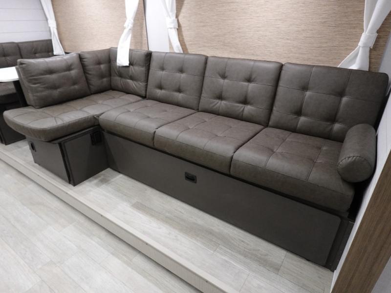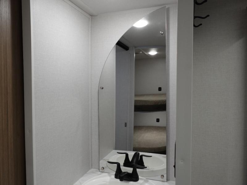 You're sure to make camping memories in this spacious travel trailer! You can easily sleep eight people each night thanks to the double-size bunks, the custom king bed with Versa Tilt in the front bedroom plus the Versa-Lounge within the large slide out! The full kitchen will let you make meals each day, and you'll appreciate the hidden pantry with shelves behind the fireplace. There is also a booth dinette where you can dine together or play a game of cards after dinner is cleaned up, or you may just find yourselves outdoors under the 16' awning. And don't overlook the full bath, complete with a tub/shower that will make bath time easier if you have little ones.