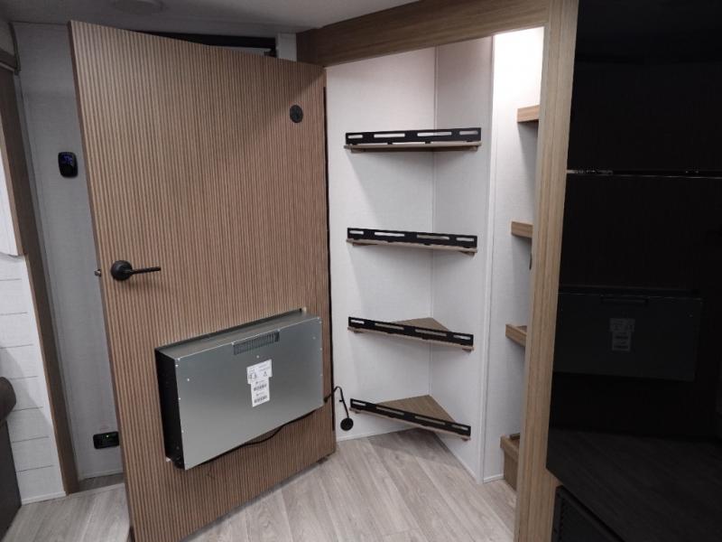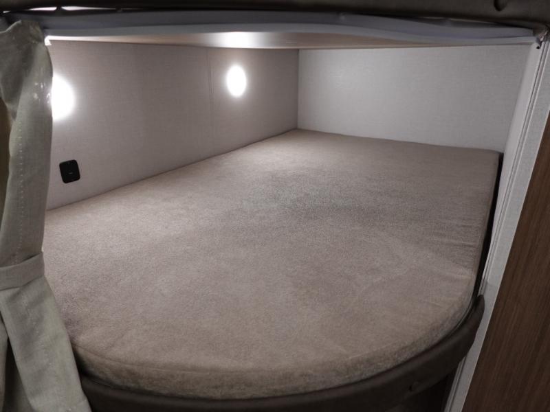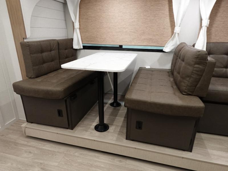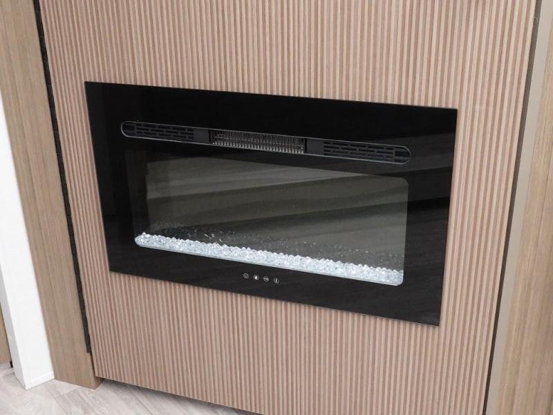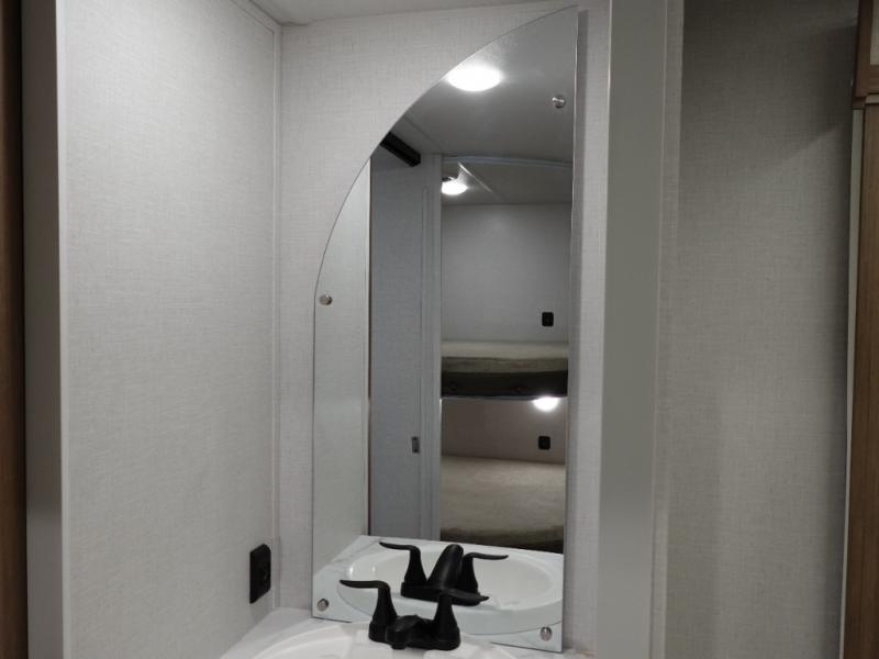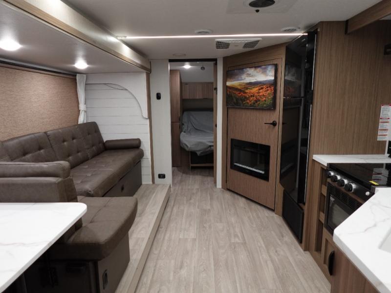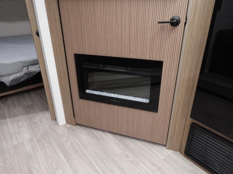 You're sure to make camping memories in this spacious travel trailer! You can easily sleep eight people each night thanks to the double-size bunks, the custom king bed with Versa Tilt in the front bedroom plus the Versa-Lounge within the large slide out! The full kitchen will let you make meals each day, and you'll appreciate the hidden pantry with shelves behind the fireplace. There is also a booth dinette where you can dine together or play a game of cards after dinner is cleaned up, or you may just find yourselves outdoors under the 16' awning. And don't overlook the full bath, complete with a tub/shower that will make bath time easier if you have little ones.