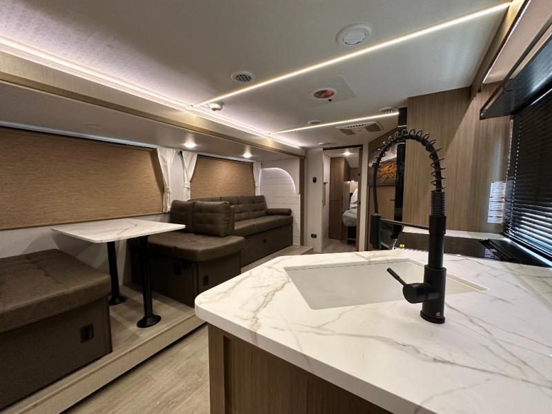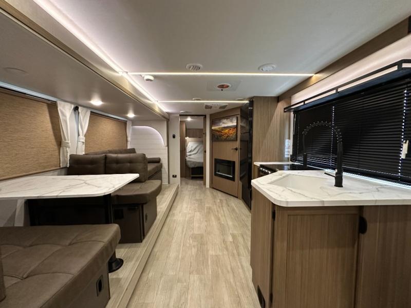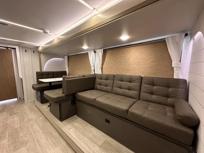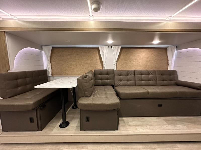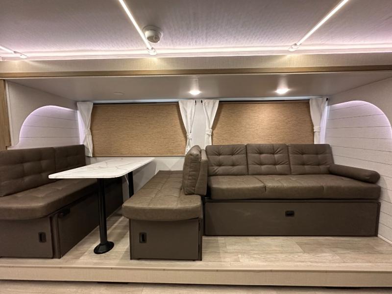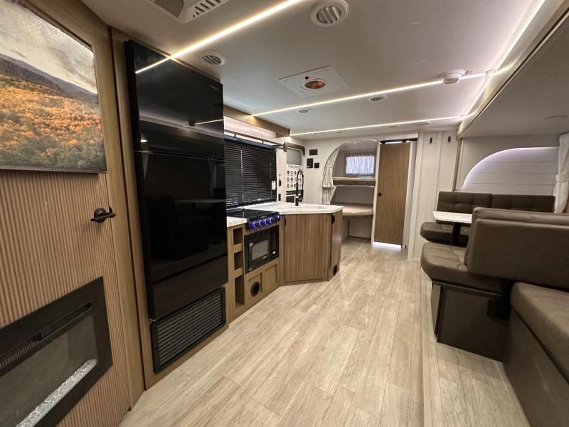 You're sure to make camping memories in this spacious travel trailer! You can easily sleep eight people each night thanks to the double-size bunks, the custom king bed with Versa Tilt in the front bedroom plus the Versa-Lounge within the large slide out! The full kitchen will let you make meals each day, and you'll appreciate the hidden pantry with shelves behind the fireplace. There is also a booth dinette where you can dine together or play a game of cards after dinner is cleaned up, or you may just find yourselves outdoors under the 16' awning. And don't overlook the full bath, complete with a tub/shower that will make bath time easier if you have little ones.