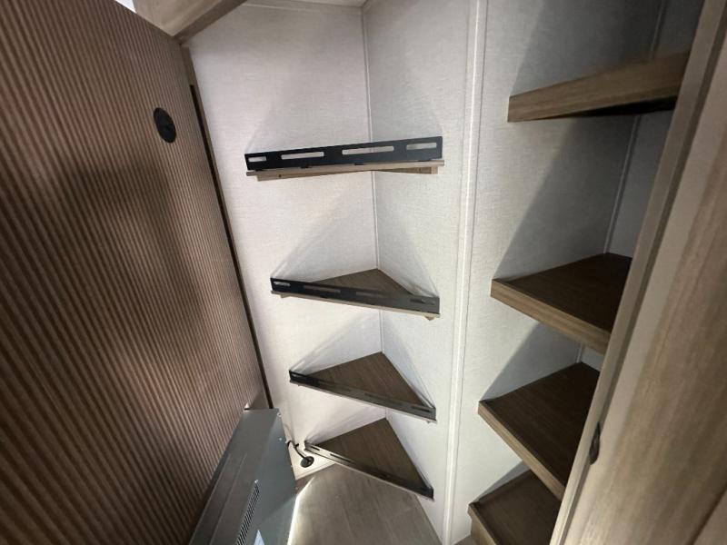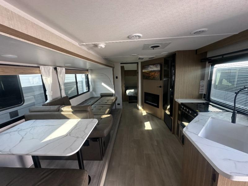 You're sure to make camping memories in this spacious travel trailer! You can easily sleep eight people each night thanks to the double-size bunks, the custom king bed with Versa Tilt in the front bedroom plus the Versa-Lounge within the large slide out! The full kitchen will let you make meals each day, and you'll appreciate the hidden pantry with shelves behind the fireplace. There is also a booth dinette where you can dine together or play a game of cards after dinner is cleaned up, or you may just find yourselves outdoors under the 16' awning. And don't overlook the full bath, complete with a tub/shower that will make bath time easier if you have little ones.