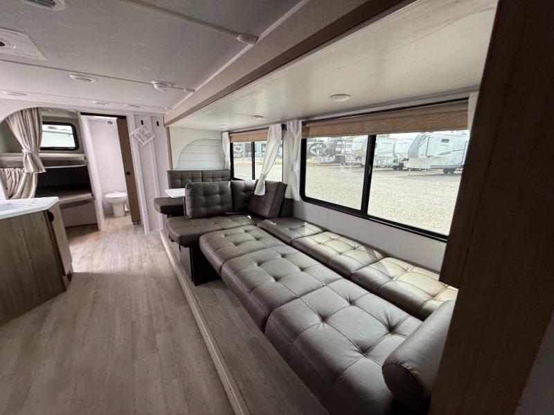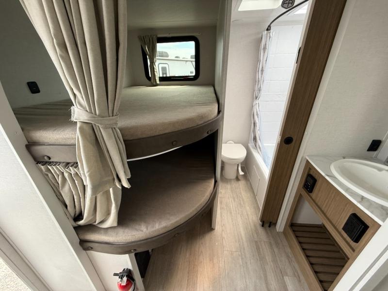 You're sure to make camping memories in this spacious travel trailer! You can easily sleep eight people each night thanks to the double-size bunks, the custom king bed with Versa Tilt in the front bedroom plus the Versa-Lounge within the large slide out! The full kitchen will let you make meals each day, and you'll appreciate the hidden pantry with shelves behind the fireplace. There is also a booth dinette where you can dine together or play a game of cards after dinner is cleaned up, or you may just find yourselves outdoors under the 16' awning. And don't overlook the full bath, complete with a tub/shower that will make bath time easier if you have little ones.