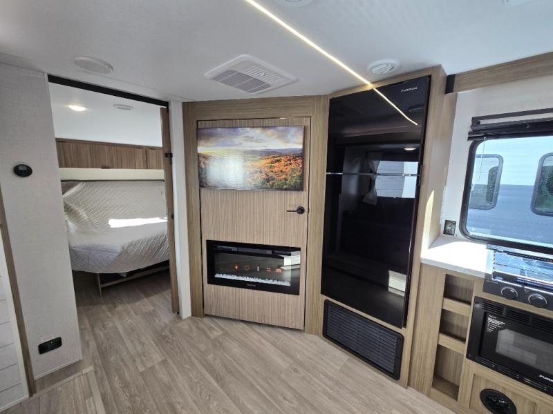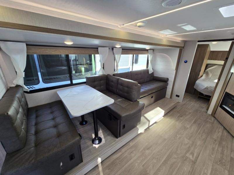 You're sure to make camping memories in this spacious travel trailer! You can easily sleep eight people each night thanks to the double-size bunks, the custom king bed with Versa Tilt in the front bedroom plus the Versa-Lounge within the large slide out! The full kitchen will let you make meals each day, and you'll appreciate the hidden pantry with shelves behind the fireplace. There is also a booth dinette where you can dine together or play a game of cards after dinner is cleaned up, or you may just find yourselves outdoors under the 16' awning. And don't overlook the full bath, complete with a tub/shower that will make bath time easier if you have little ones.