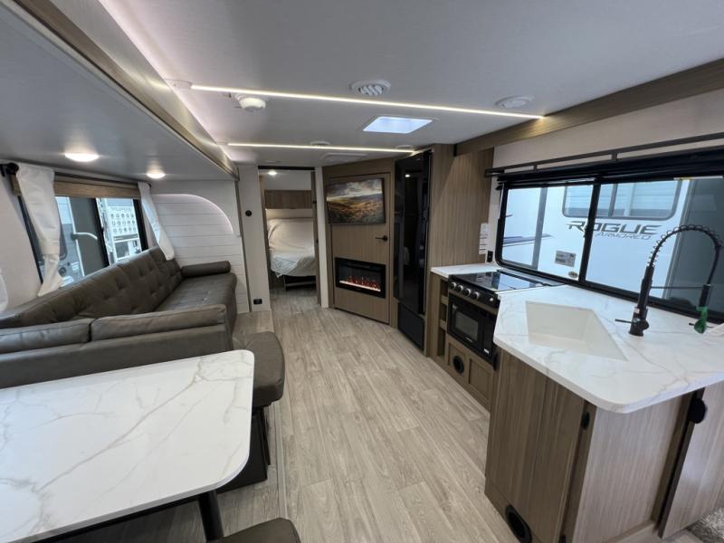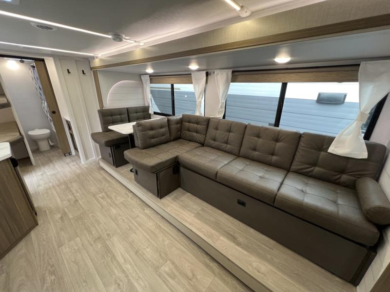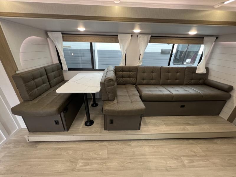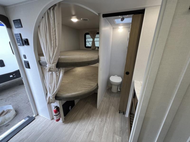 You're sure to make camping memories in this spacious travel trailer! You can easily sleep eight people each night thanks to the double-size bunks, the custom king bed with Versa Tilt in the front bedroom plus the Versa-Lounge within the large slide out! The full kitchen will let you make meals each day, and you'll appreciate the hidden pantry with shelves behind the fireplace. There is also a booth dinette where you can dine together or play a game of cards after dinner is cleaned up, or you may just find yourselves outdoors under the 16' awning. And don't overlook the full bath, complete with a tub/shower that will make bath time easier if you have little ones.