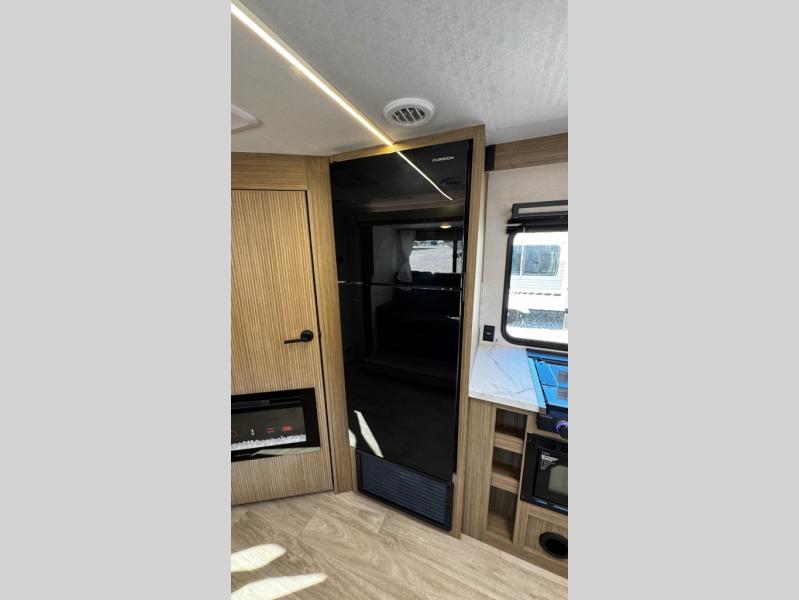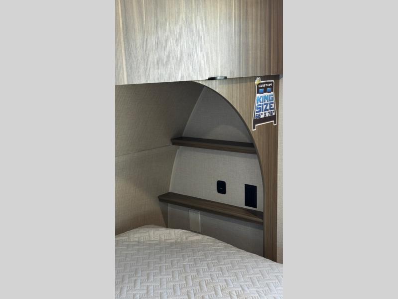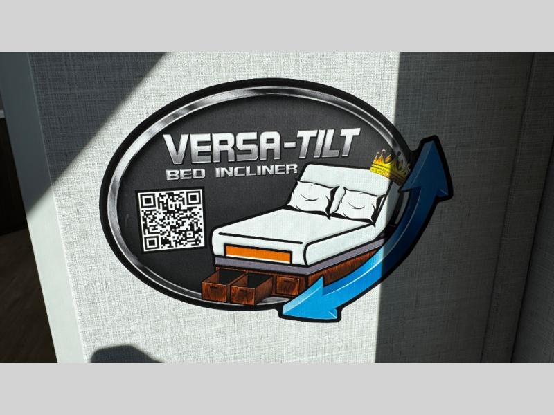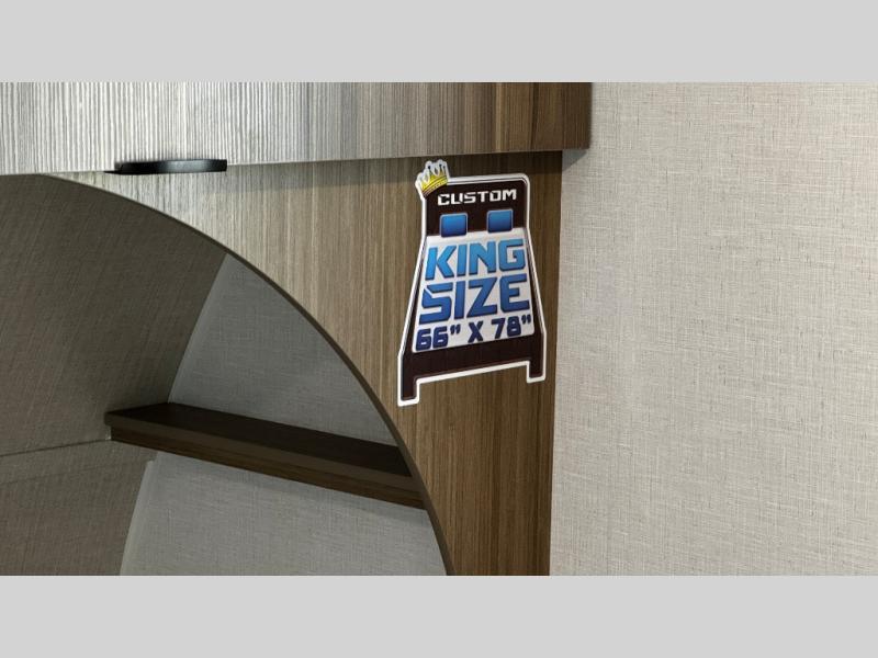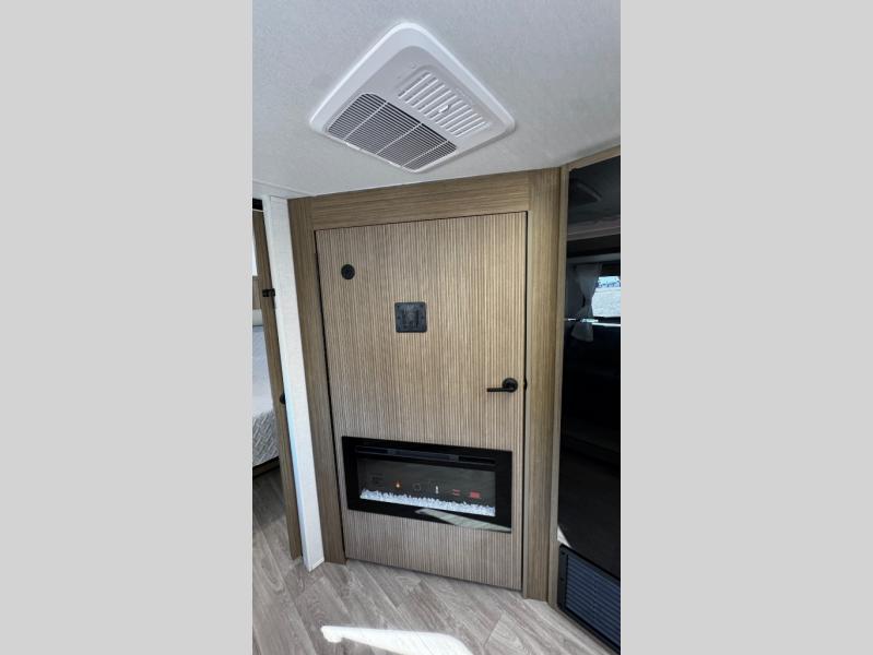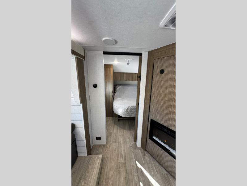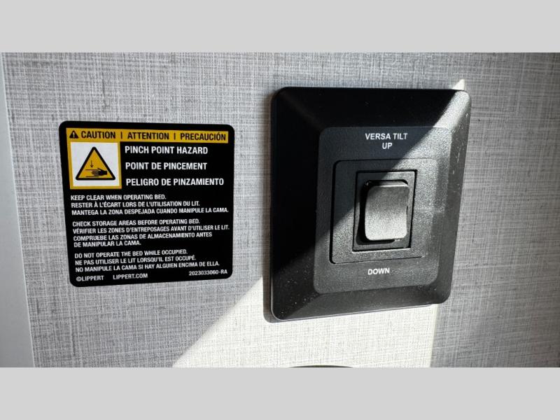 You're sure to make camping memories in this spacious travel trailer! You can easily sleep eight people each night thanks to the double-size bunks, the custom king bed with Versa Tilt in the front bedroom plus the Versa-Lounge within the large slide out! The full kitchen will let you make meals each day, and you'll appreciate the hidden pantry with shelves behind the fireplace. There is also a booth dinette where you can dine together or play a game of cards after dinner is cleaned up, or you may just find yourselves outdoors under the 16' awning. And don't overlook the full bath, complete with a tub/shower that will make bath time easier if you have little ones.