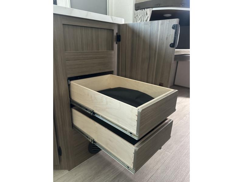 You're sure to make camping memories in this spacious travel trailer! You can easily sleep eight people each night thanks to the double-size bunks, the custom king bed with Versa Tilt in the front bedroom plus the Versa-Lounge within the large slide out! The full kitchen will let you make meals each day, and you'll appreciate the hidden pantry with shelves behind the fireplace. There is also a booth dinette where you can dine together or play a game of cards after dinner is cleaned up, or you may just find yourselves outdoors under the 16' awning. And don't overlook the full bath, complete with a tub/shower that will make bath time easier if you have little ones.
