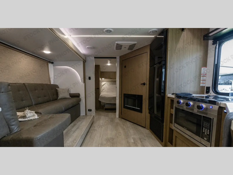 You're sure to make camping memories in this spacious travel trailer! You can easily sleep eight people each night thanks to the double-size bunks, the custom king bed with Versa Tilt in the front bedroom plus the Versa-Lounge within the large slide out! The full kitchen will let you make meals each day, and you'll appreciate the hidden pantry with shelves behind the fireplace. There is also a booth dinette where you can dine together or play a game of cards after dinner is cleaned up, or you may just find yourselves outdoors under the 16' awning. And don't overlook the full bath, complete with a tub/shower that will make bath time easier if you have little ones.