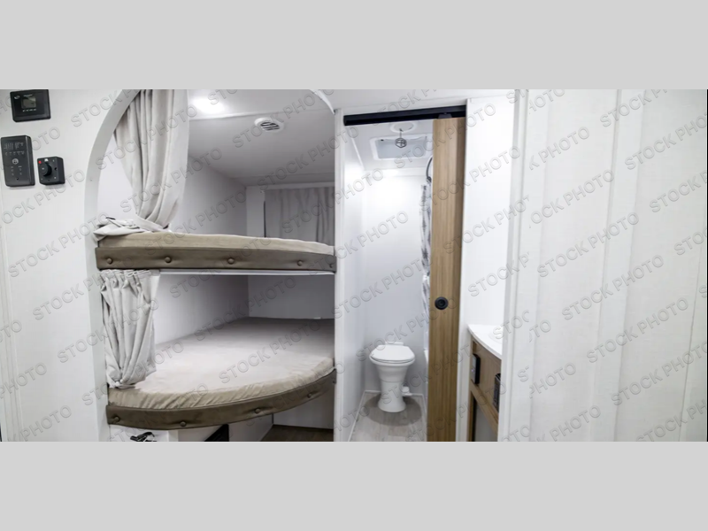 You're sure to make camping memories in this spacious travel trailer! You can easily sleep eight people each night thanks to the double-size bunks, the custom king bed with Versa Tilt in the front bedroom plus the Versa-Lounge within the large slide out! The full kitchen will let you make meals each day, and you'll appreciate the hidden pantry with shelves behind the fireplace. There is also a booth dinette where you can dine together or play a game of cards after dinner is cleaned up, or you may just find yourselves outdoors under the 16' awning. And don't overlook the private bath with a shower and toilet, and the sink just outside the room, allowing to people to freshen up at once!