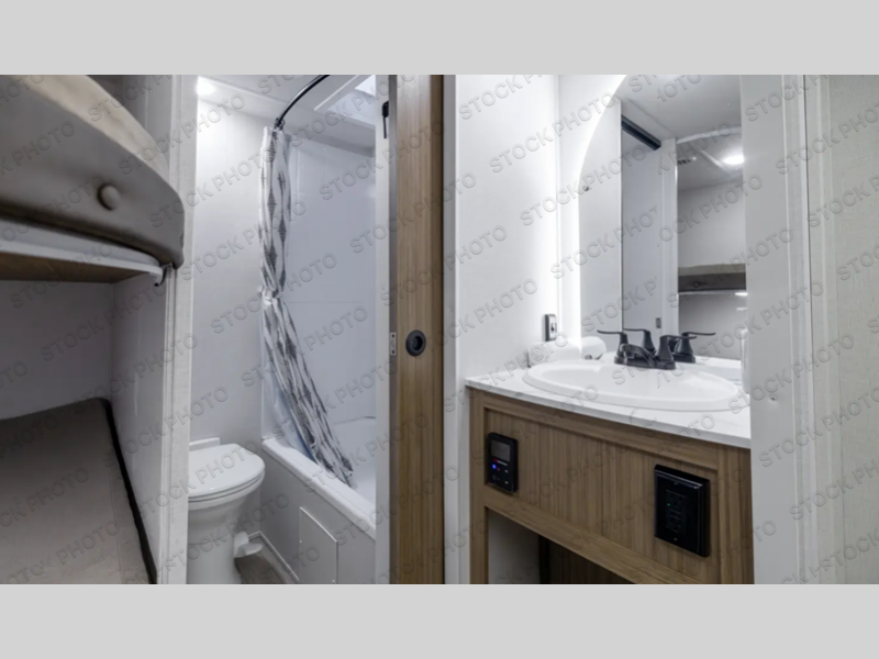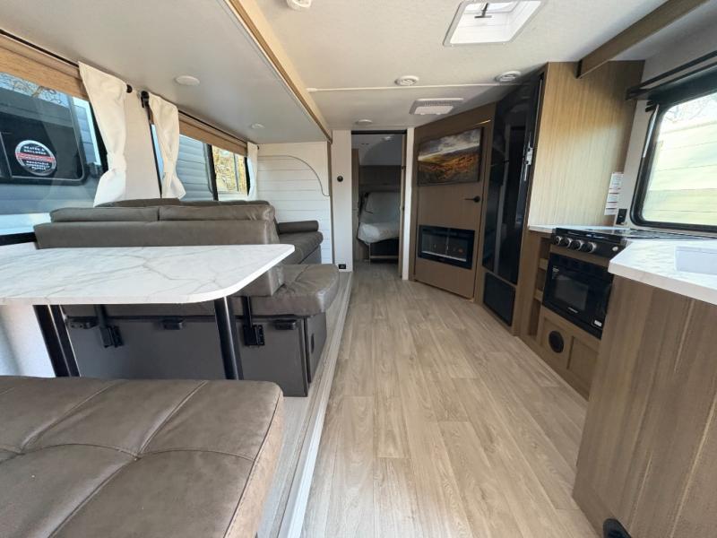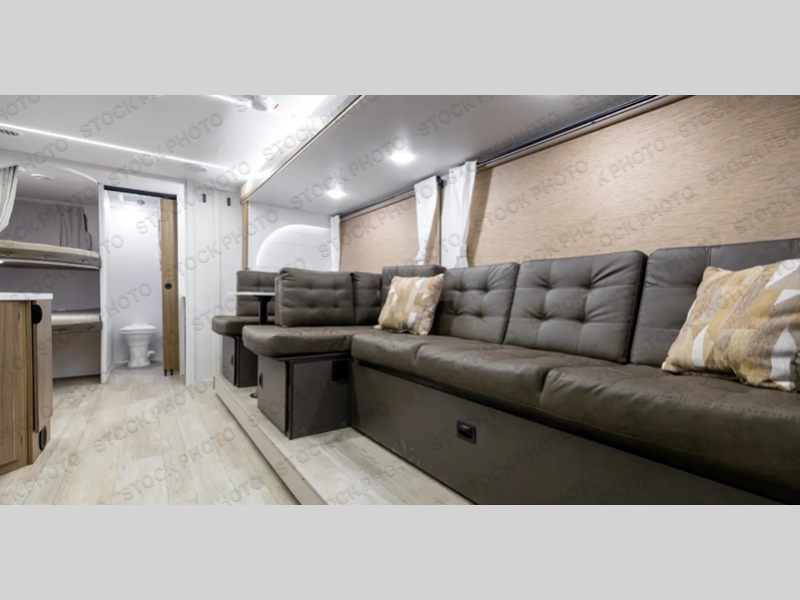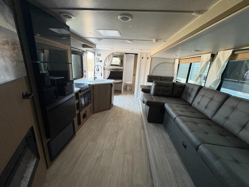 You're sure to make camping memories in this spacious travel trailer! You can easily sleep eight people each night thanks to the double-size bunks, the custom king bed with Versa Tilt in the front bedroom plus the Versa-Lounge within the large slide out! The full kitchen will let you make meals each day, and you'll appreciate the hidden pantry with shelves behind the fireplace. There is also a booth dinette where you can dine together or play a game of cards after dinner is cleaned up, or you may just find yourselves outdoors under the 16' awning. And don't overlook the private bath with a shower and toilet, and the sink just outside the room, allowing to people to freshen up at once!