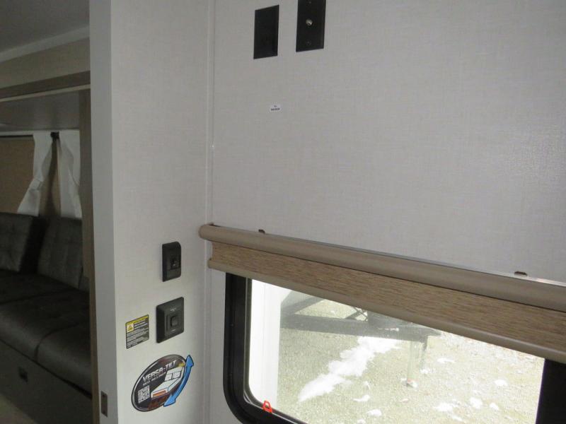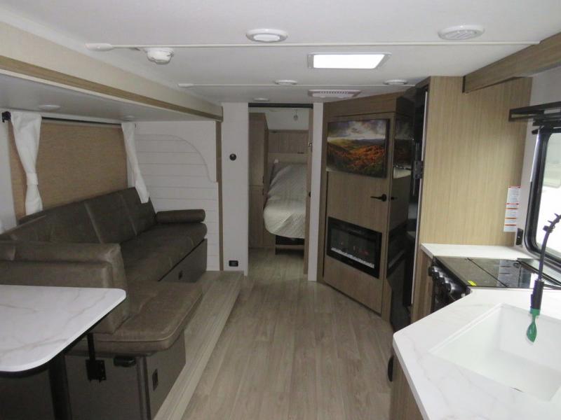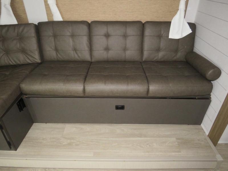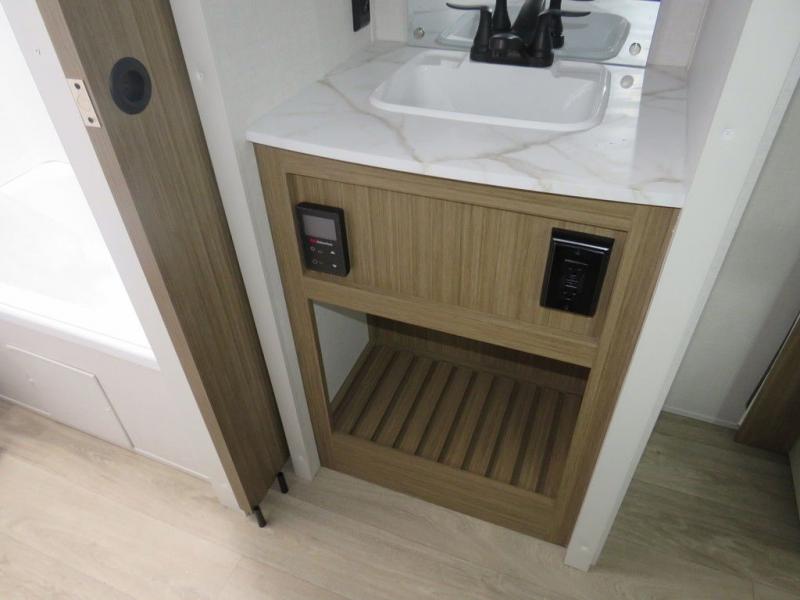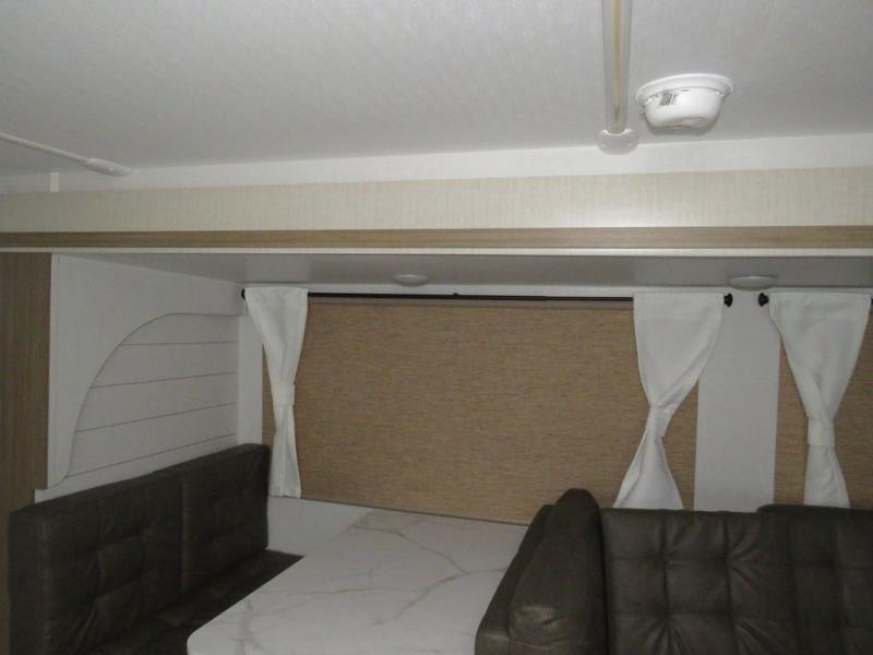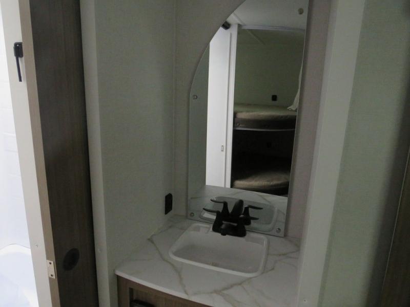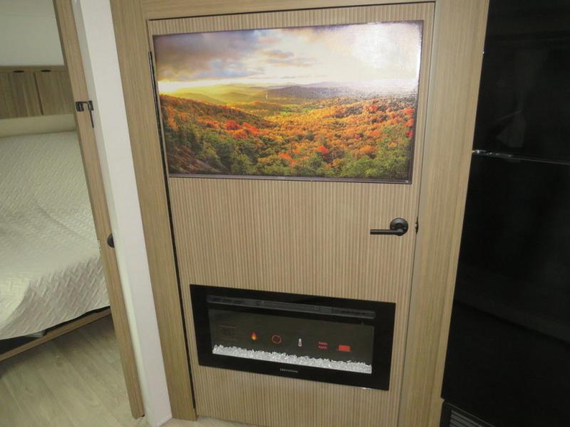 You're sure to make camping memories in this spacious travel trailer! You can easily sleep eight people each night thanks to the double-size bunks, the custom king bed with Versa Tilt in the front bedroom plus the Versa-Lounge within the large slide out! The full kitchen will let you make meals each day, and you'll appreciate the hidden pantry with shelves behind the fireplace. There is also a booth dinette where you can dine together or play a game of cards after dinner is cleaned up, or you may just find yourselves outdoors under the 16' awning. And don't overlook the private bath with a shower and toilet, and the sink just outside the room, allowing to people to freshen up at once!