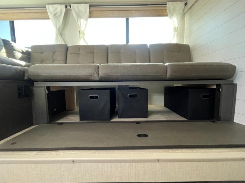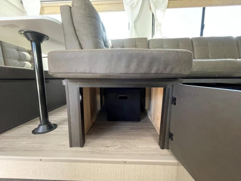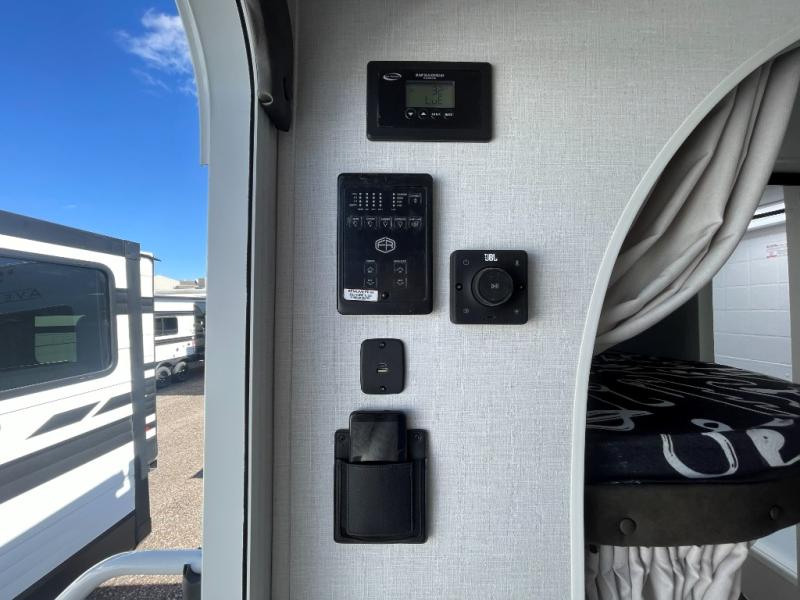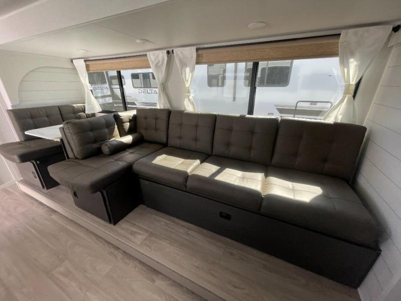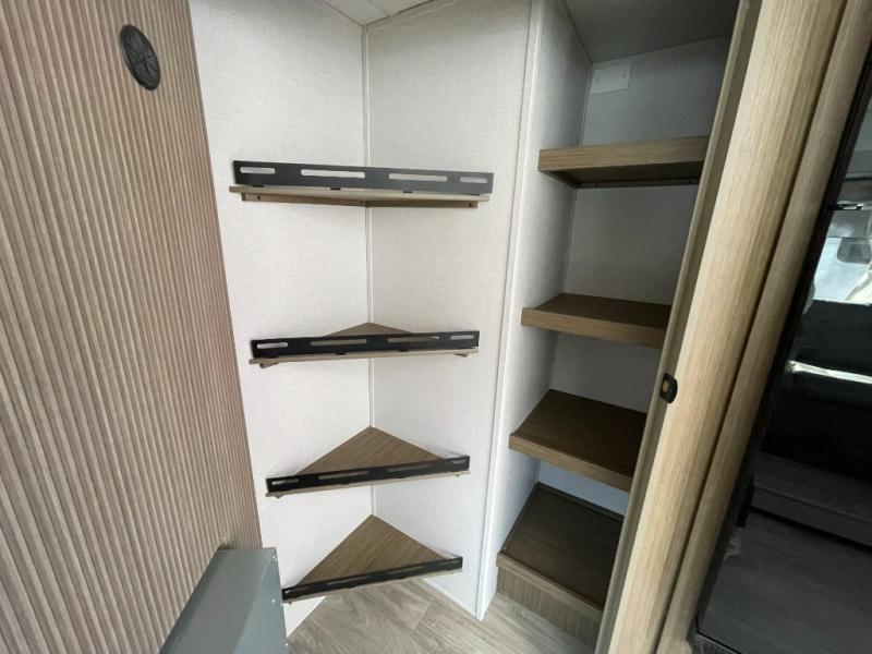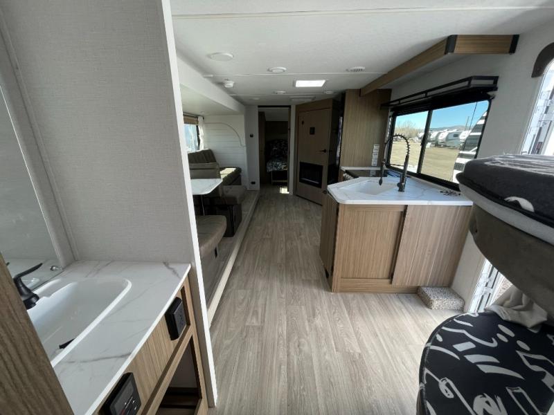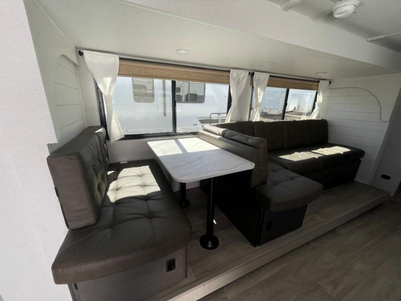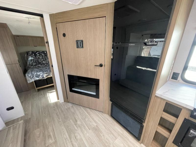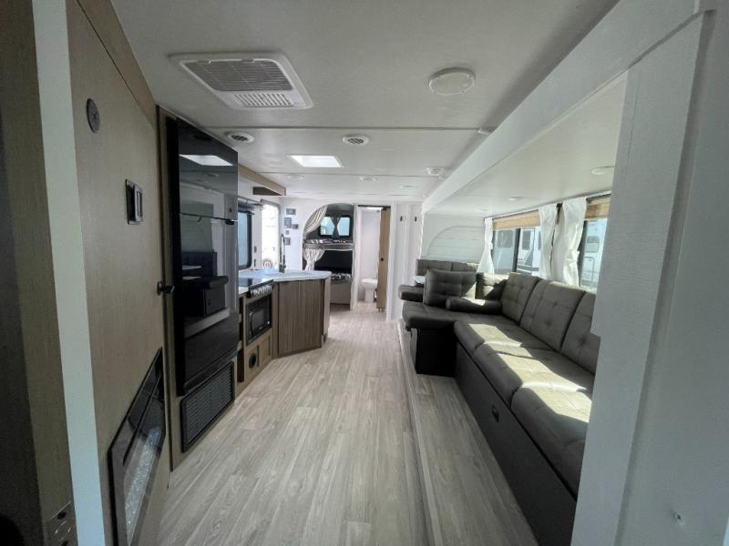 You're sure to make camping memories in this spacious travel trailer! You can easily sleep eight people each night thanks to the double-size bunks, the custom king bed with Versa Tilt in the front bedroom plus the Versa-Lounge within the large slide out! The full kitchen will let you make meals each day, and you'll appreciate the hidden pantry with shelves behind the fireplace. There is also a booth dinette where you can dine together or play a game of cards after dinner is cleaned up, or you may just find yourselves outdoors under the 16' awning. And don't overlook the private bath with a shower and toilet, and the sink just outside the room, allowing to people to freshen up at once!