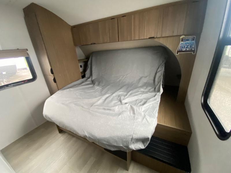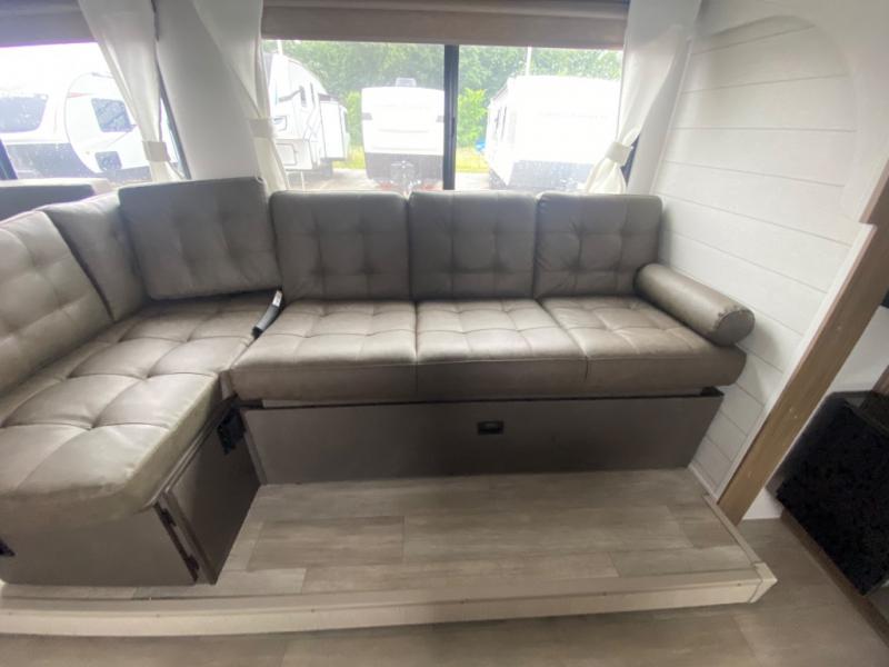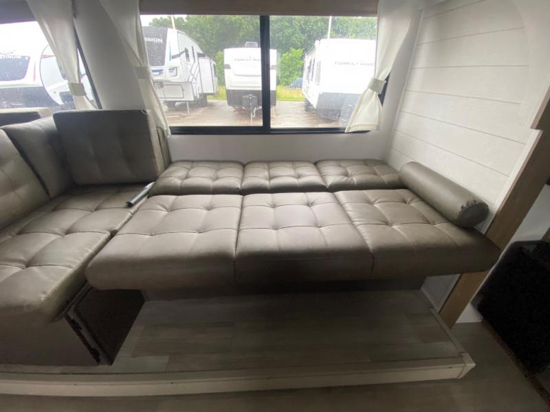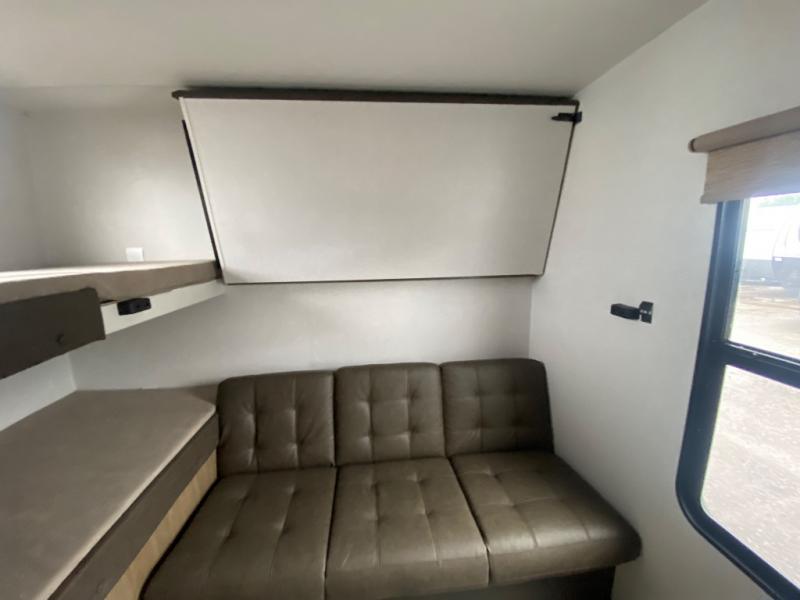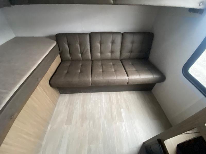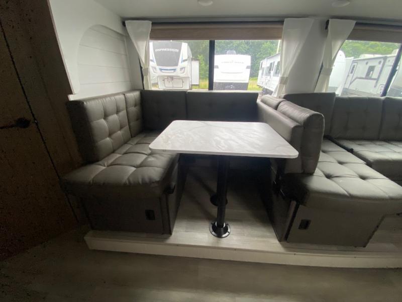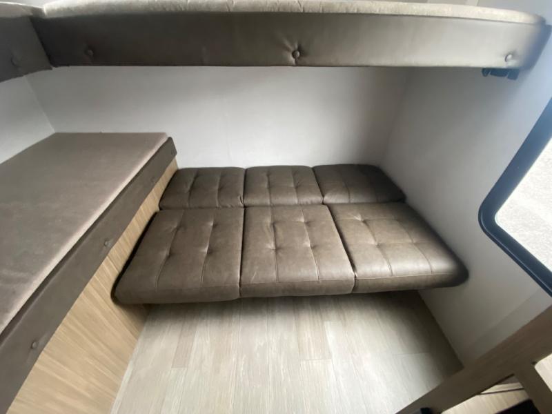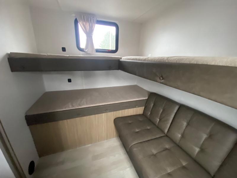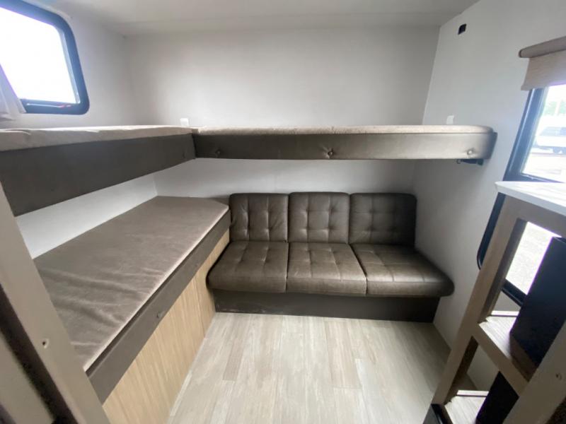 If you like to travel with a large crew, choose this Wildwood X-Lite travel trailer! This trailer has two private sleeping spaces with a private bedroom up front and a private bunkhouse in the back. Not only does the bunkhouse have three bunk beds, but it also has a closet for storage and a jiffy sofa for lounging. In the main living area, there is a large slide that holds the U-shaped dinette and sofa. These pieces of furniture are a part of the Versa Lounge, and you can customize them to function as you need them to. The panoramic windows surround the dinette and sofa so that you can take in the scenic views while you relax. You even have an outdoor camp kitchen to make it more convenient.