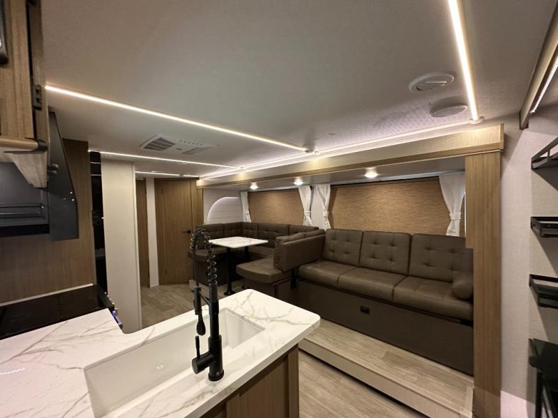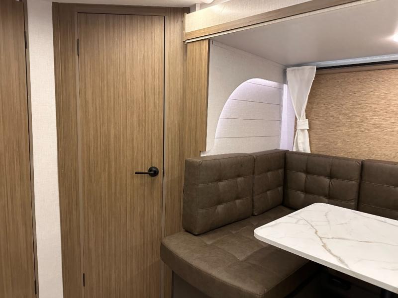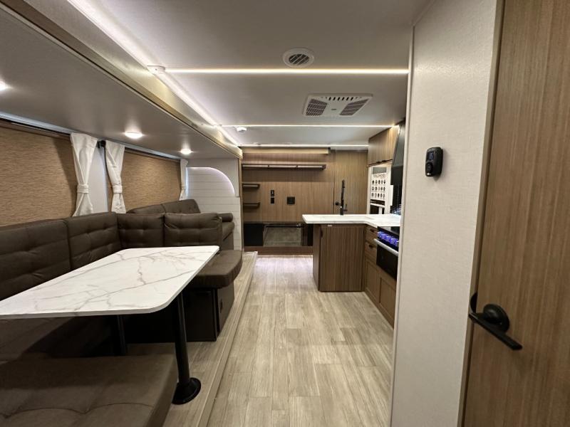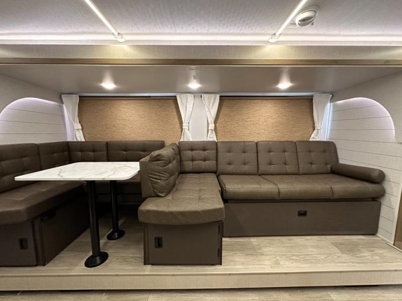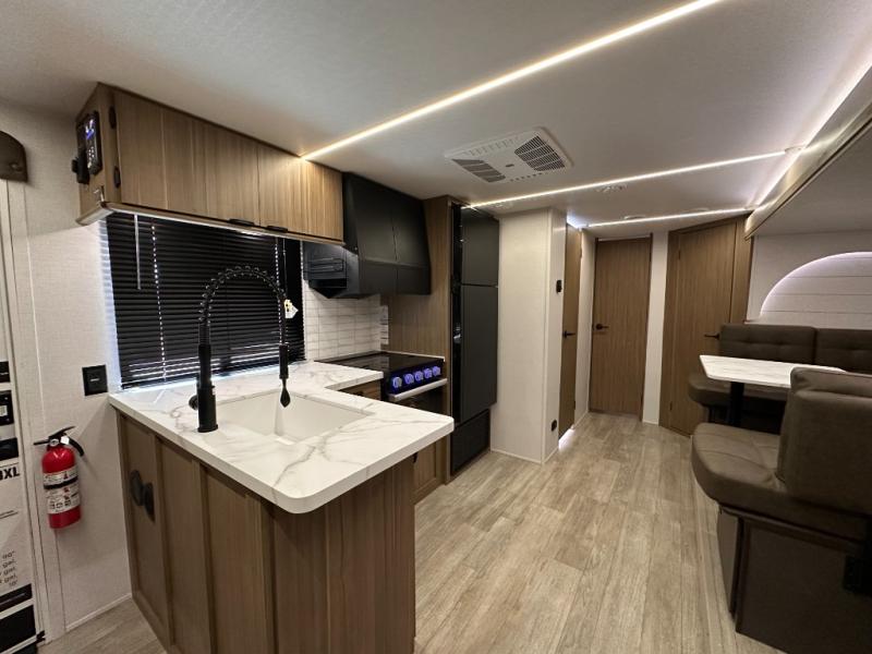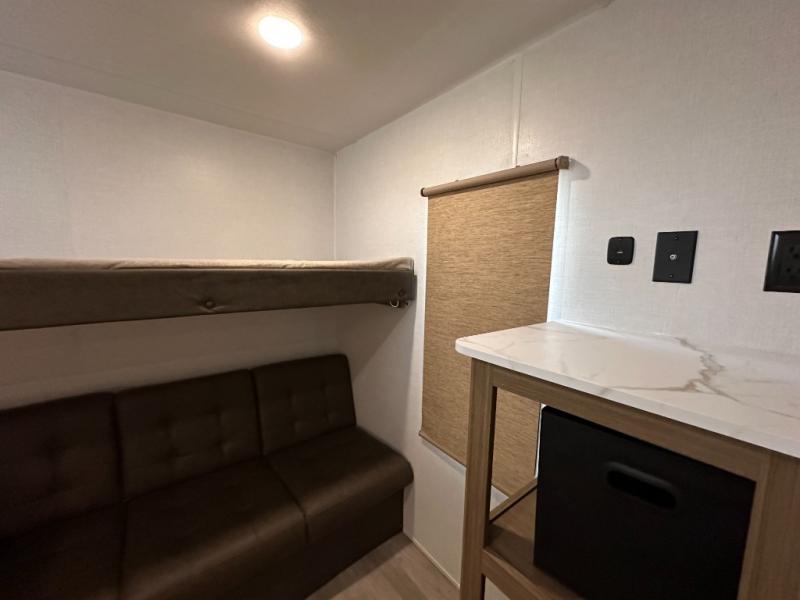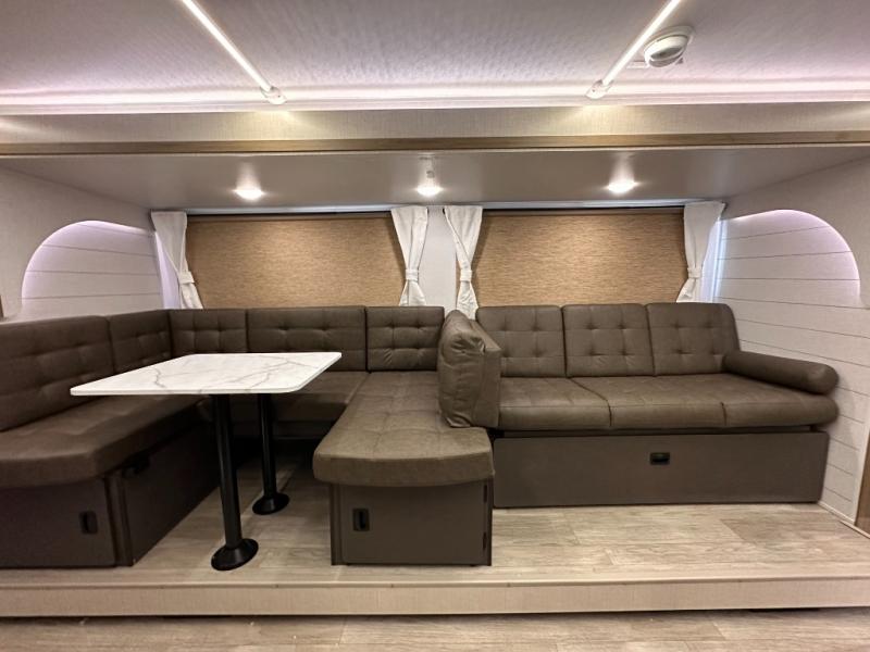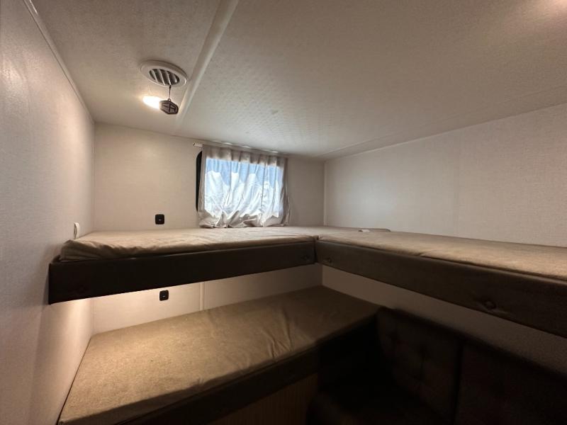 If you like to travel with a large crew, choose this Wildwood X-Lite travel trailer! This trailer has two private sleeping spaces with a private bedroom up front and a private bunkhouse in the back. Not only does the bunkhouse have three bunk beds, but it also has a closet for storage and a jiffy sofa for lounging. In the main living area, there is a large slide that holds the U-shaped dinette and sofa. These pieces of furniture are a part of the Versa Lounge, and you can customize them to function as you need them to. The panoramic windows surround the dinette and sofa so that you can take in the scenic views while you relax. You even have an outdoor camp kitchen to make it more convenient.