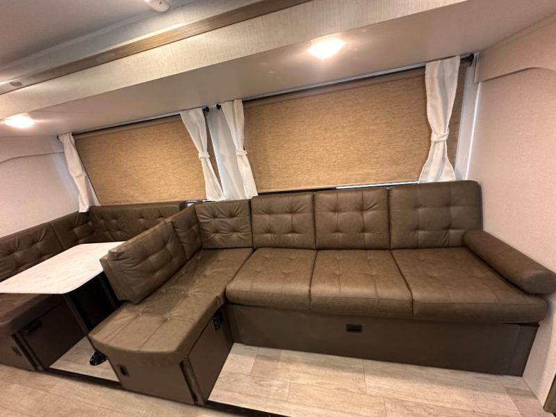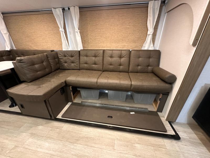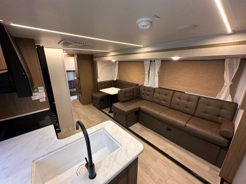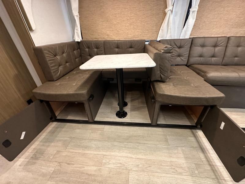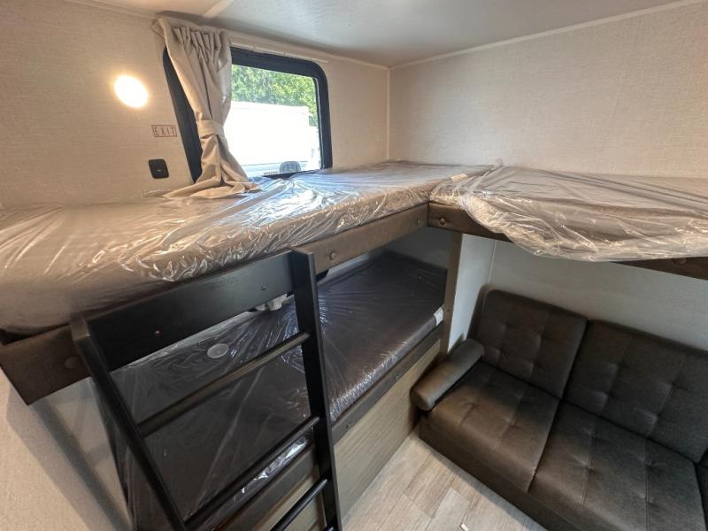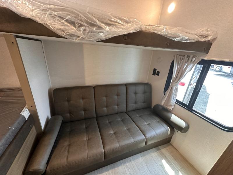 If you like to travel with a large crew, choose this Wildwood X-Lite travel trailer! This trailer has two private sleeping spaces with a private bedroom up front and a private bunkhouse in the back. Not only does the bunkhouse have bunk beds, but it also has a wardrobe for storage and a jiffy sofa for lounging. In the main living area, there is a large slide that holds the U-shaped dinette and Versa lounge, and these pieces of furniture can both be transformed into beds for additional sleeping space. The panoramic windows surround the dinette and sofa so that you can take in the scenic views while you relax. You will also love the exterior camp kitchen on this model!