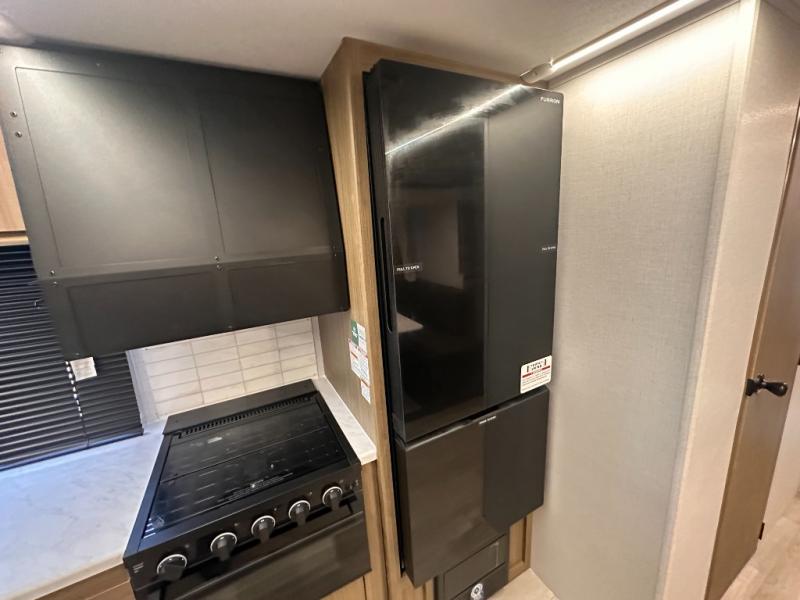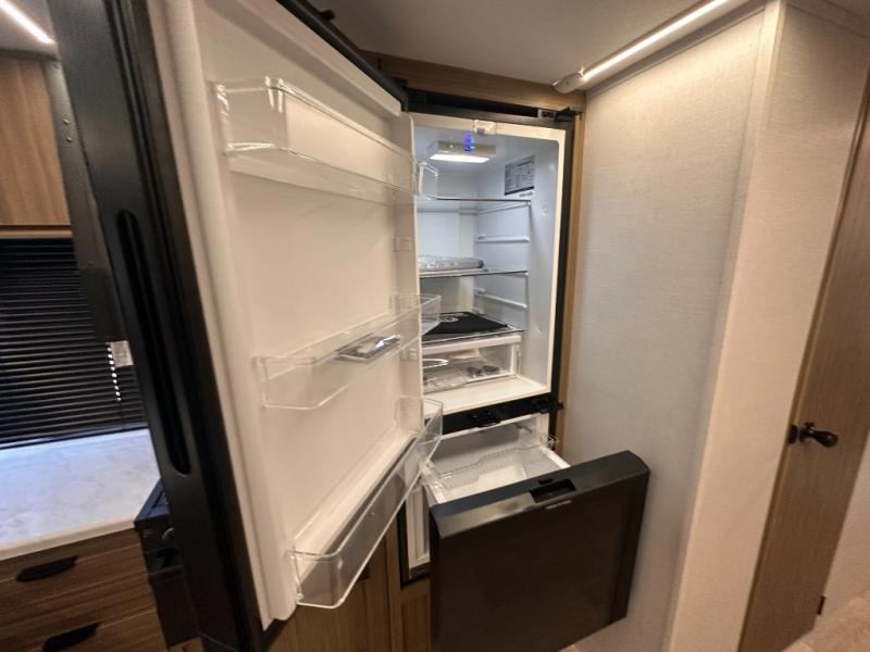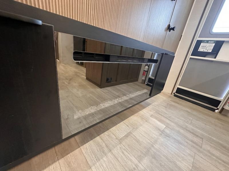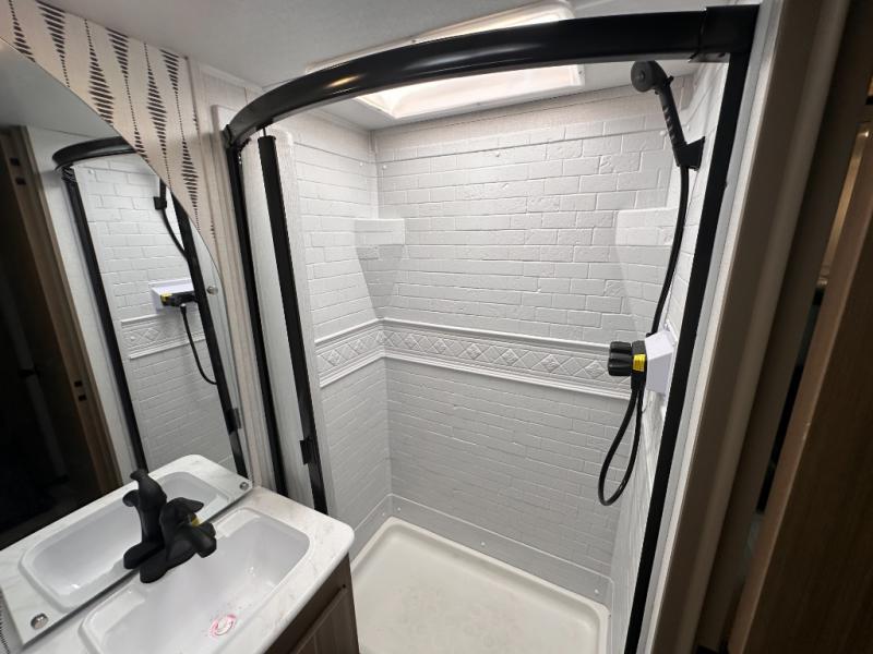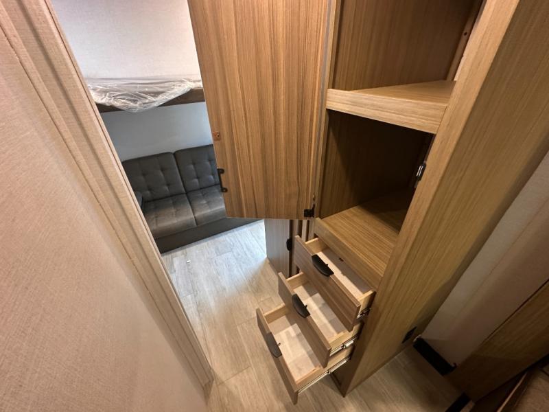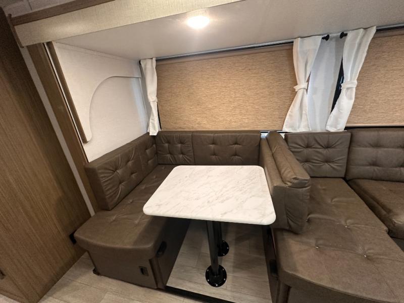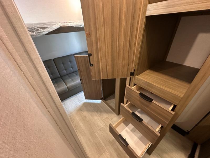 If you like to travel with a large crew, choose this Wildwood X-Lite travel trailer! This trailer has two private sleeping spaces with a private bedroom up front and a private bunkhouse in the back. Not only does the bunkhouse have bunk beds, but it also has a wardrobe for storage and a jiffy sofa for lounging. In the main living area, there is a large slide that holds the U-shaped dinette and Versa lounge, and these pieces of furniture can both be transformed into beds for additional sleeping space. The panoramic windows surround the dinette and sofa so that you can take in the scenic views while you relax. You will also love the exterior camp kitchen on this model!