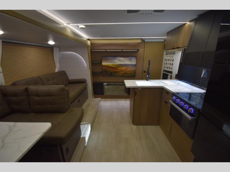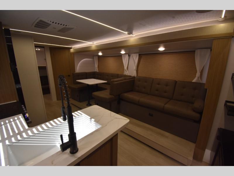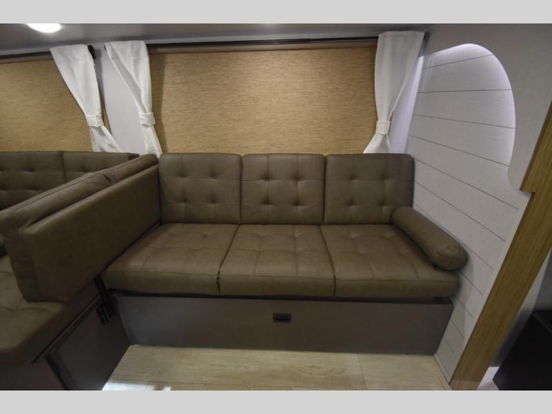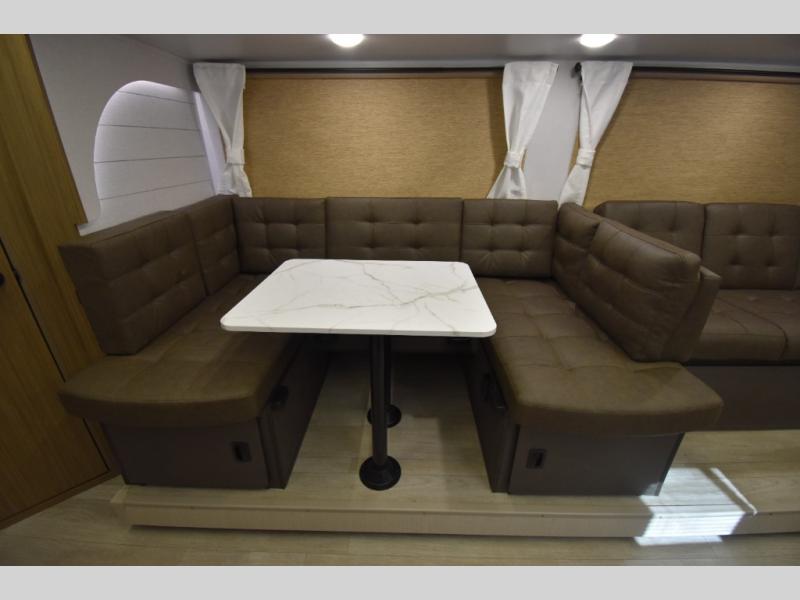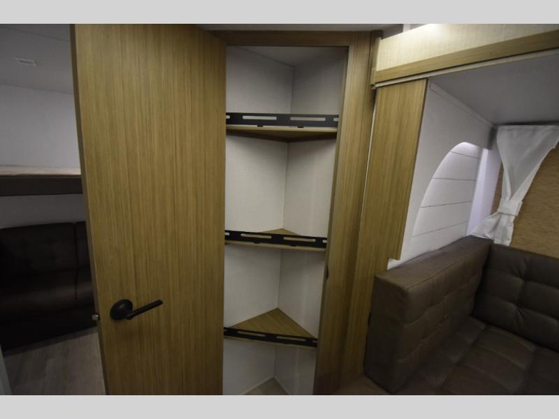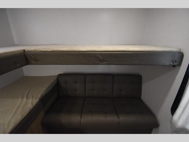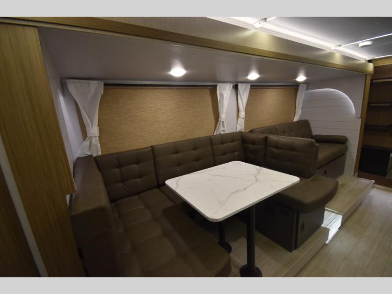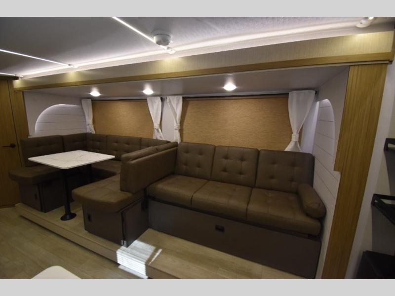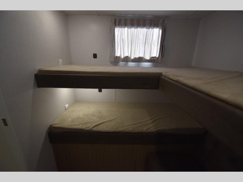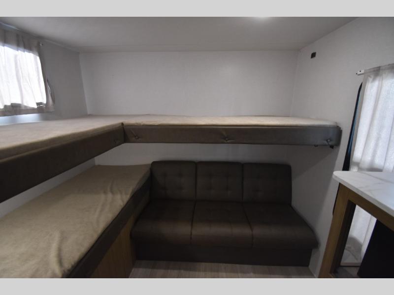 If you like to travel with a large crew, choose this Wildwood X-Lite travel trailer! This trailer has two private sleeping spaces with a private bedroom up front and a private bunkhouse in the back. Not only does the bunkhouse have three bunk beds, but it also has a closet for storage and a jiffy sofa for lounging. In the main living area, there is a large slide that holds the U-shaped dinette and sofa. These pieces of furniture are a part of the Versa Lounge, and you can customize them to function as you need them to. The panoramic windows surround the dinette and sofa so that you can take in the scenic views while you relax. You even have an outdoor camp kitchen to make it more convenient.