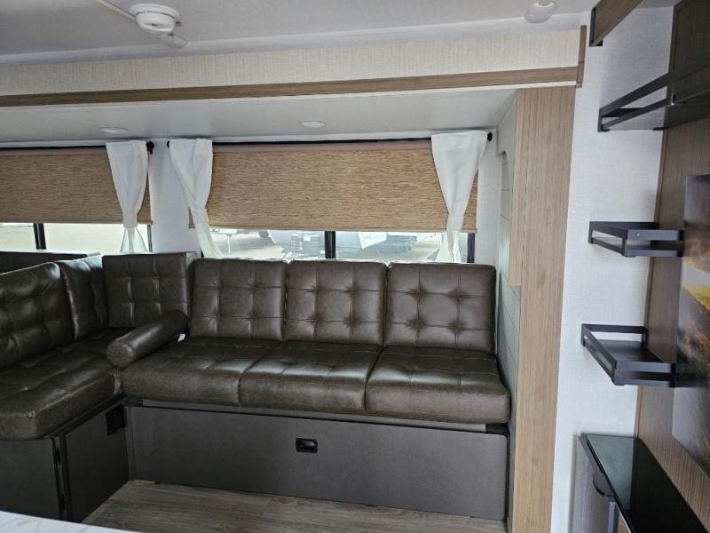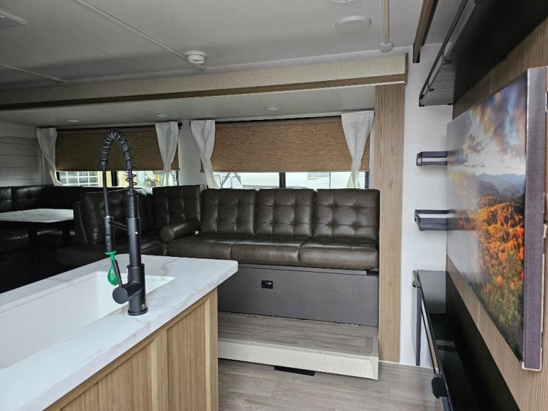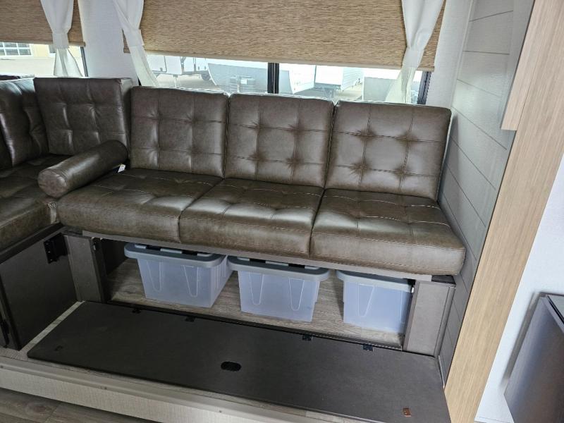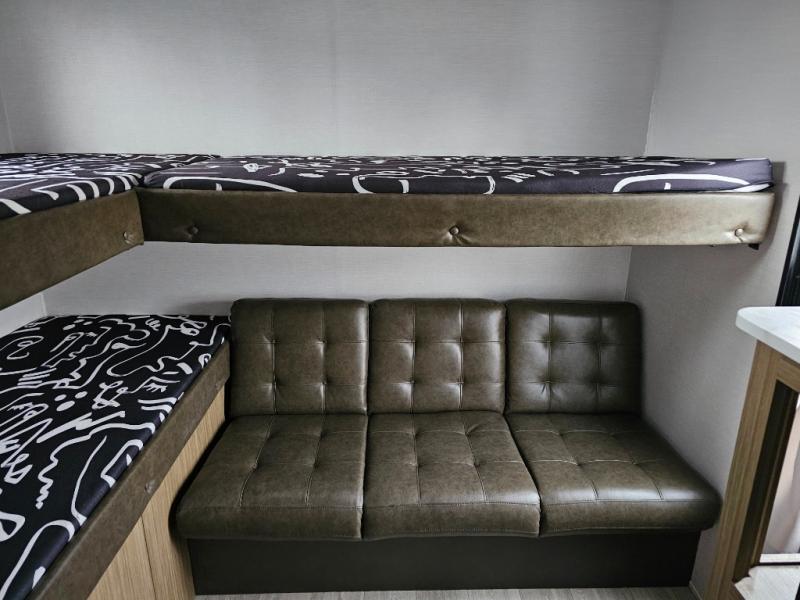 If you like to travel with a large crew, choose this Wildwood X-Lite travel trailer! This trailer has two private sleeping spaces with a private bedroom up front and a private bunkhouse in the back. Not only does the bunkhouse have bunk beds, but it also has a wardrobe for storage and a jiffy sofa for lounging. In the main living area, there is a large slide that holds the U-shaped dinette and Versa lounge, and these pieces of furniture can both be transformed into beds for additional sleeping space. The panoramic windows surround the dinette and sofa so that you can take in the scenic views while you relax. You will also love the exterior camp kitchen on this model!