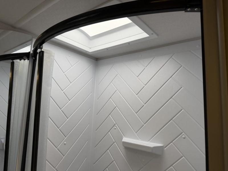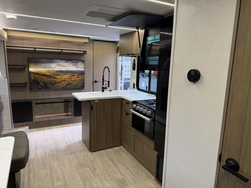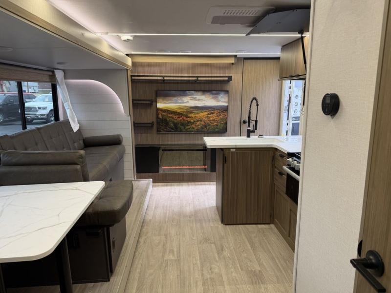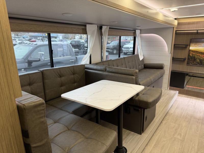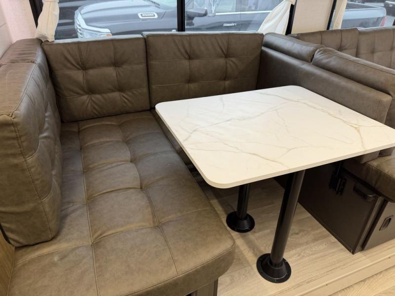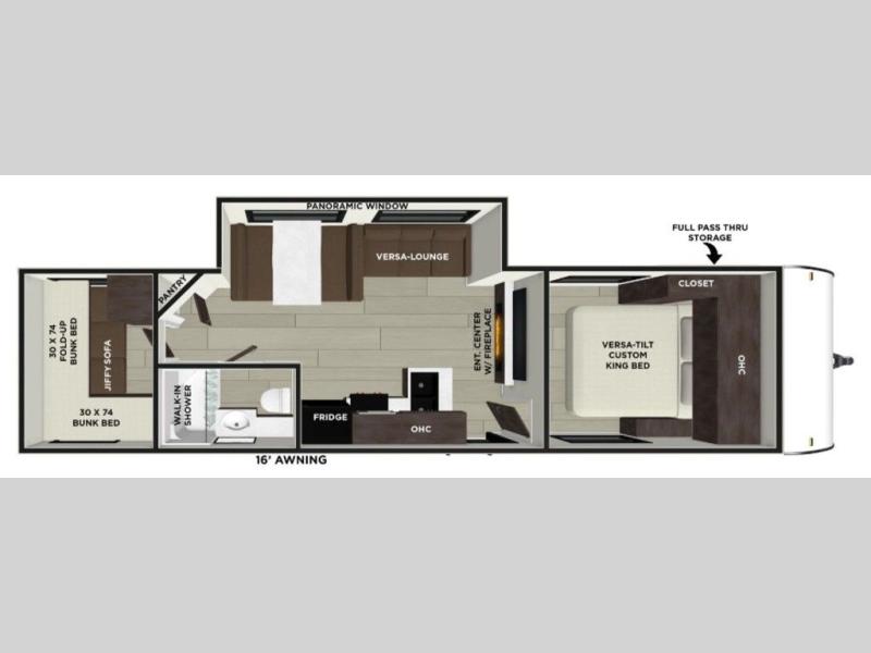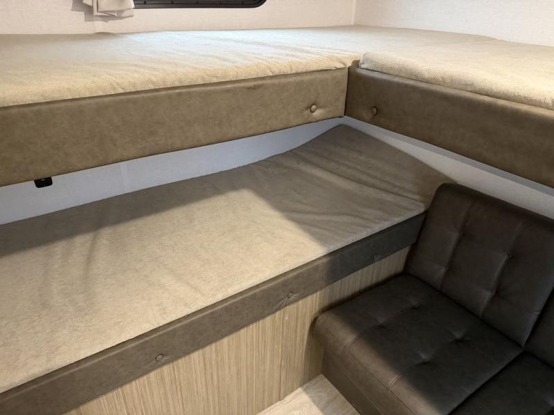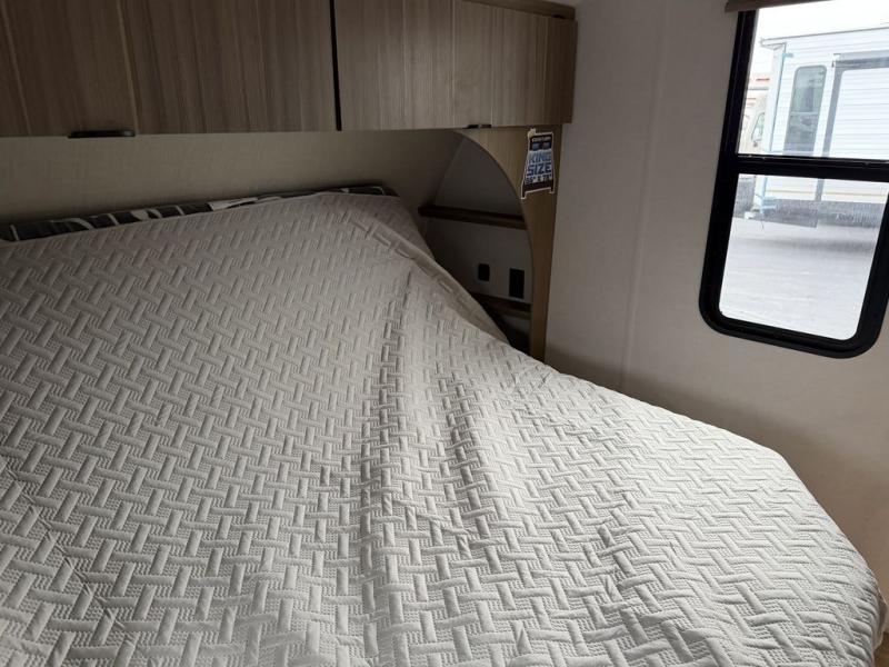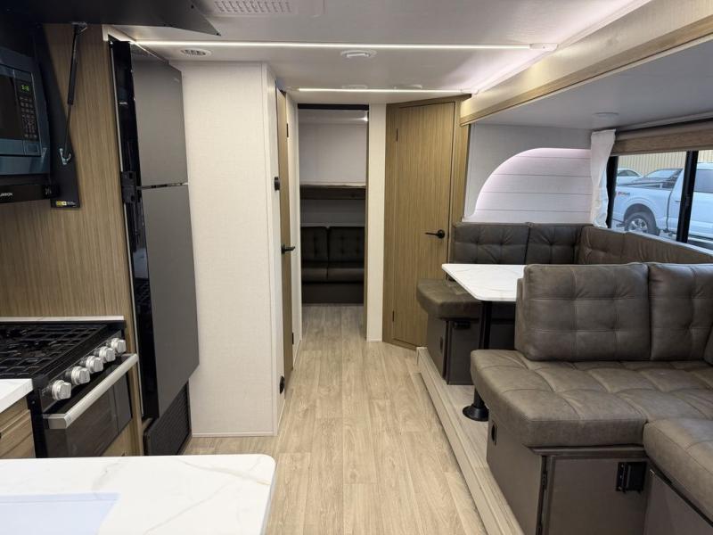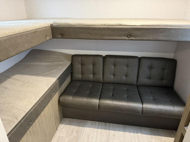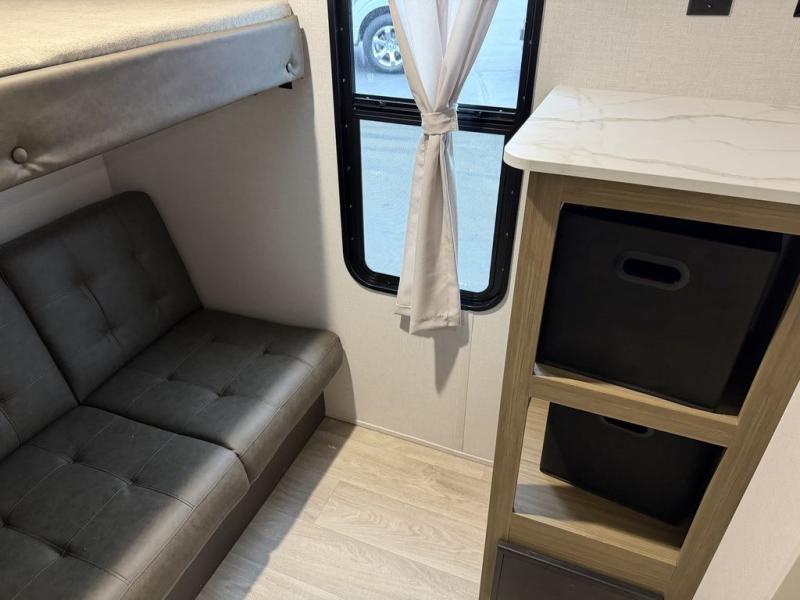 If you like to travel with a large crew, choose this Wildwood X-Lite travel trailer! This trailer has two private sleeping spaces with a private bedroom up front and a private bunkhouse in the back. Not only does the bunkhouse have three bunk beds, but it also has a closet for storage and a jiffy sofa for lounging. In the main living area, there is a large slide that holds the booth dinette and sofa. These pieces of furniture are a part of the Versa Lounge, and you can customize them to function as you need them to. The panoramic windows surround the dinette and sofa so that you can take in the scenic views while you relax.