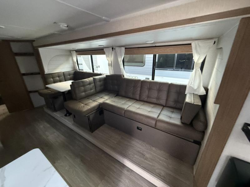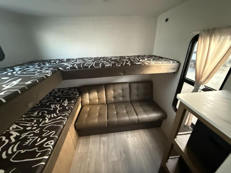 If you like to travel with a large crew, choose this Wildwood X-Lite travel trailer! This trailer has two private sleeping spaces with a private bedroom up front and a private bunkhouse in the back. Not only does the bunkhouse have three bunk beds, but it also has a closet for storage and a jiffy sofa for lounging. In the main living area, there is a large slide that holds the booth dinette and sofa. These pieces of furniture are a part of the Versa Lounge, and you can customize them to function as you need them to. The panoramic windows surround the dinette and sofa so that you can take in the scenic views while you relax.