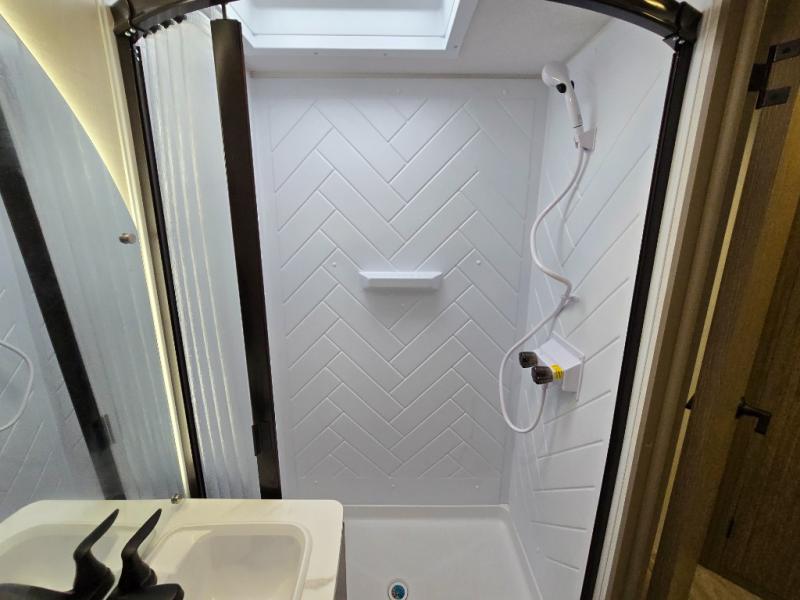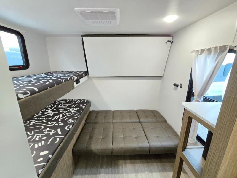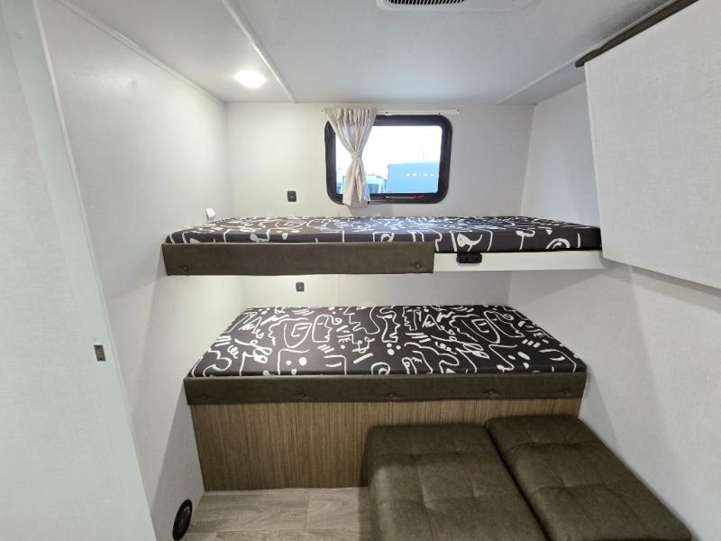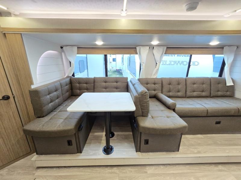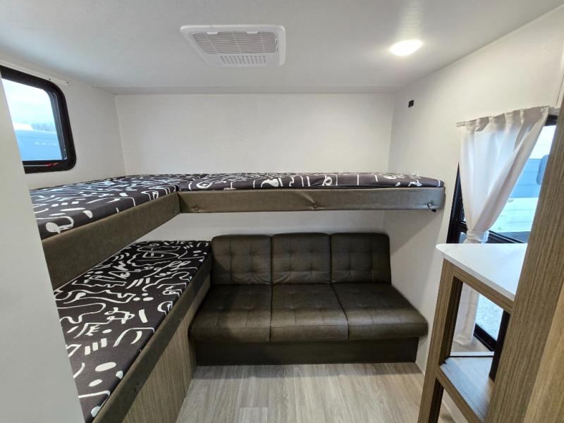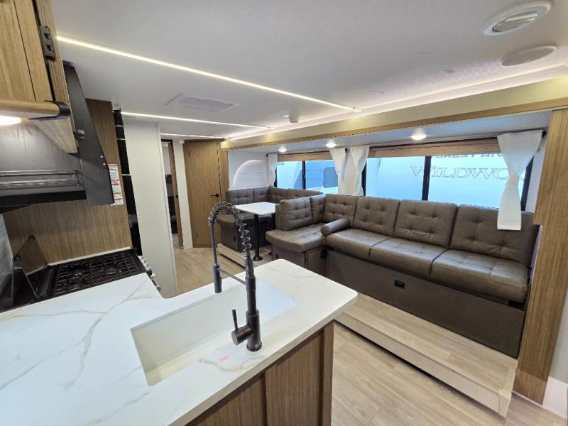 If you like to travel with a large crew, choose this Wildwood X-Lite travel trailer! This trailer has two private sleeping spaces with a private bedroom up front and a private bunkhouse in the back. Not only does the bunkhouse have three bunk beds, but it also has a closet for storage and a jiffy sofa for lounging. In the main living area, there is a large slide that holds the booth dinette and sofa. These pieces of furniture are a part of the Versa Lounge, and you can customize them to function as you need them to. The panoramic windows surround the dinette and sofa so that you can take in the scenic views while you relax.