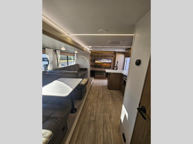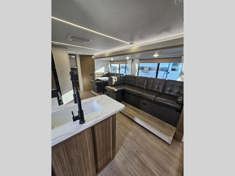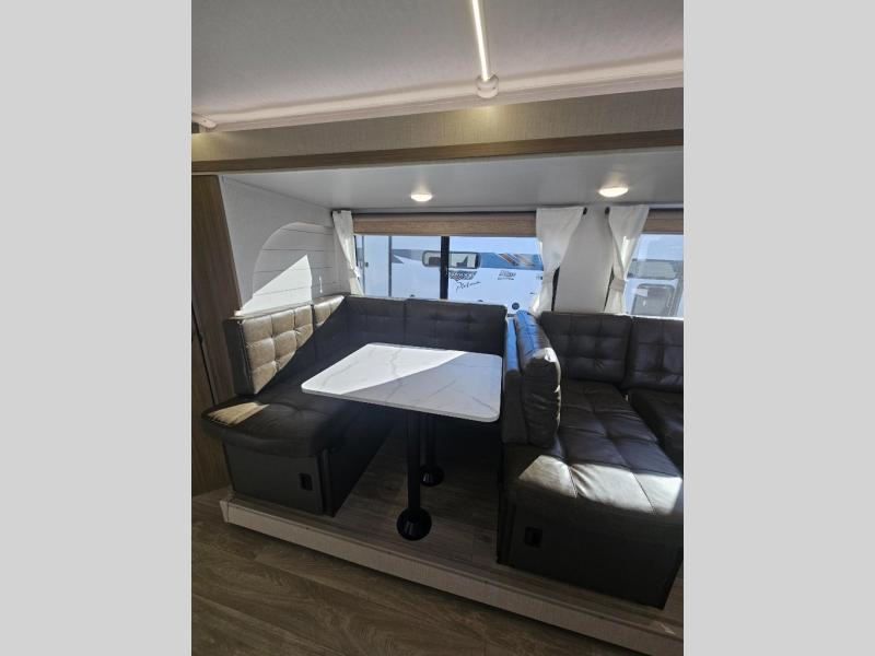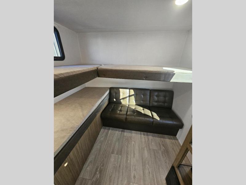 If you like to travel with a large crew, choose this Wildwood X-Lite travel trailer! This trailer has two private sleeping spaces with a private bedroom up front and a private bunkhouse in the back. Not only does the bunkhouse have three bunk beds, but it also has a closet for storage and a jiffy sofa for lounging. In the main living area, there is a large slide that holds the U-shaped dinette and sofa. These pieces of furniture are a part of the Versa Lounge, and you can customize them to function as you need them to. The panoramic windows surround the dinette and sofa so that you can take in the scenic views while you relax. You even have an outdoor camp kitchen to make it more convenient.