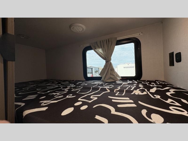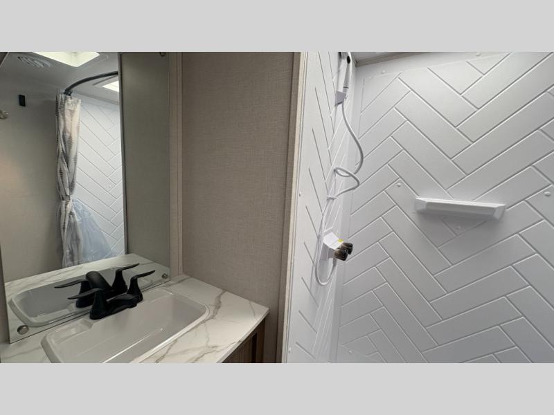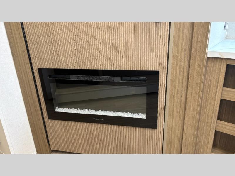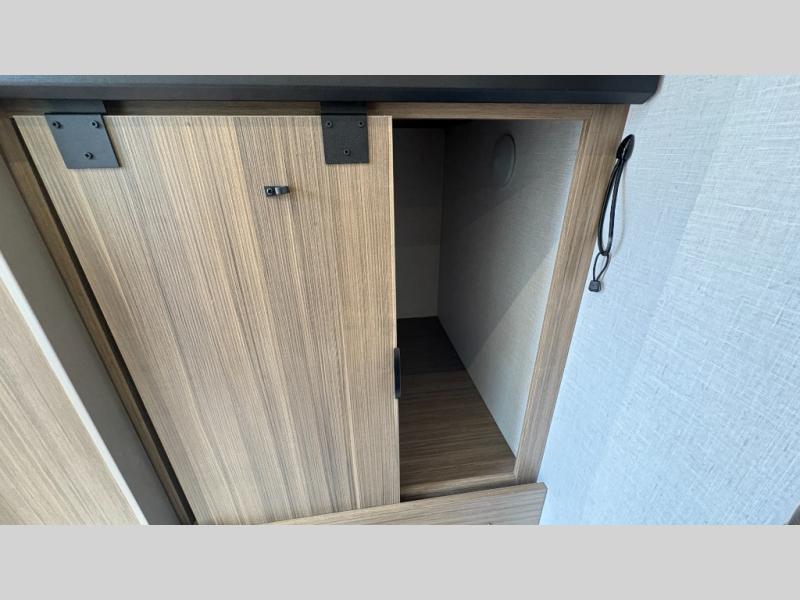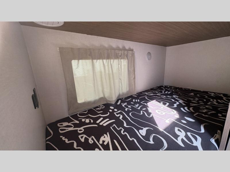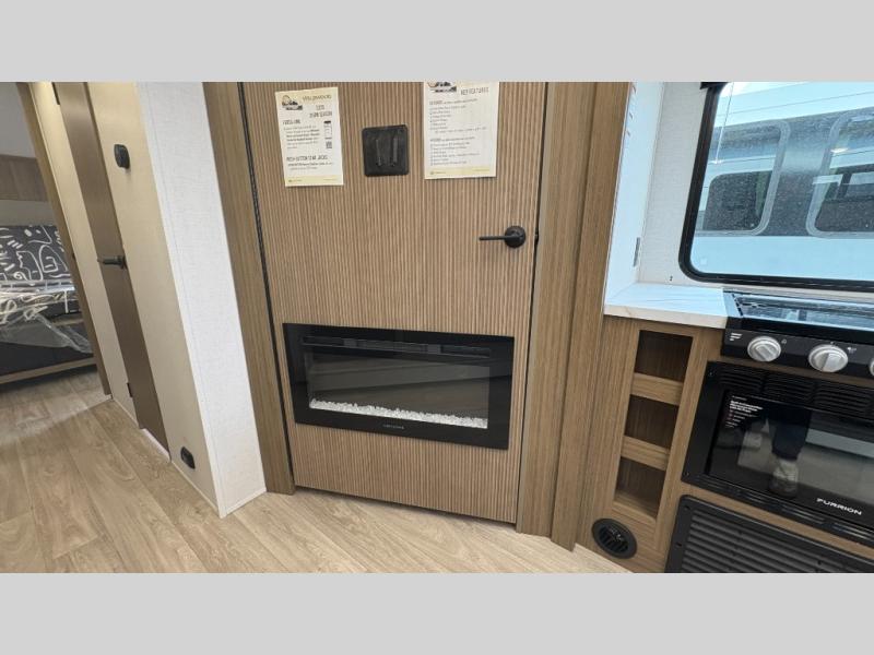 Your guests or older kids will love camping in this spacious travel trailer thanks to the rear bunk beds, each with their own private door! The front bedroom includes a Versa-Tilt custom king bed, a closet and overhead shelf for storage, and any other guests can sleep on the booth dinette and Versa-Lounge within the large slide out. The combined kitchen and living area also includes all the appliances to make meals each day, a booth dinette, and an entertainment center with a fireplace and hidden pantry. And don't overlook the full bath with a walk-in shower to easily clean up each day!
