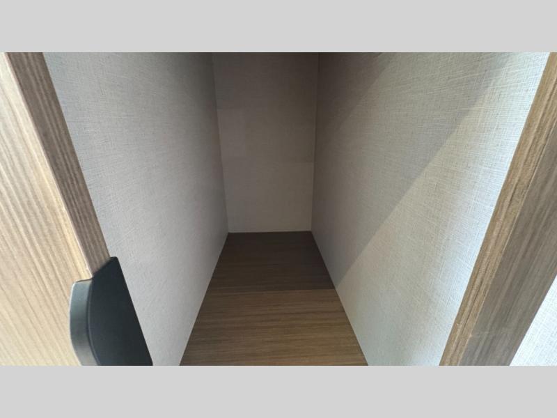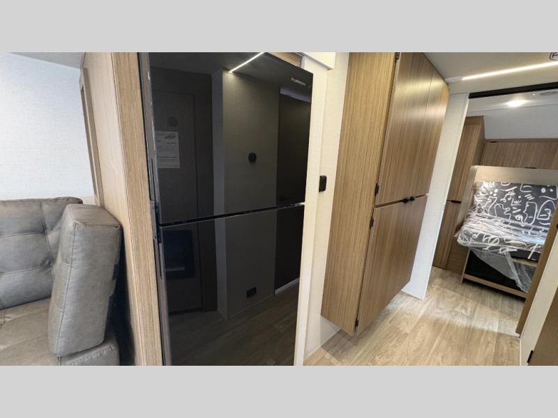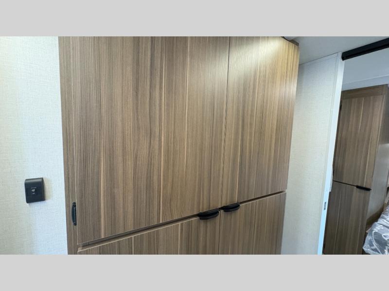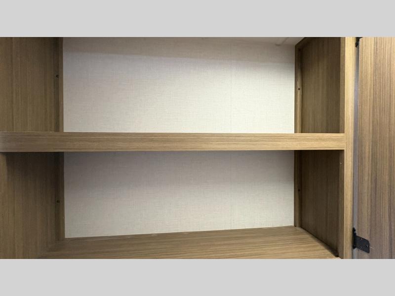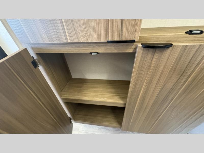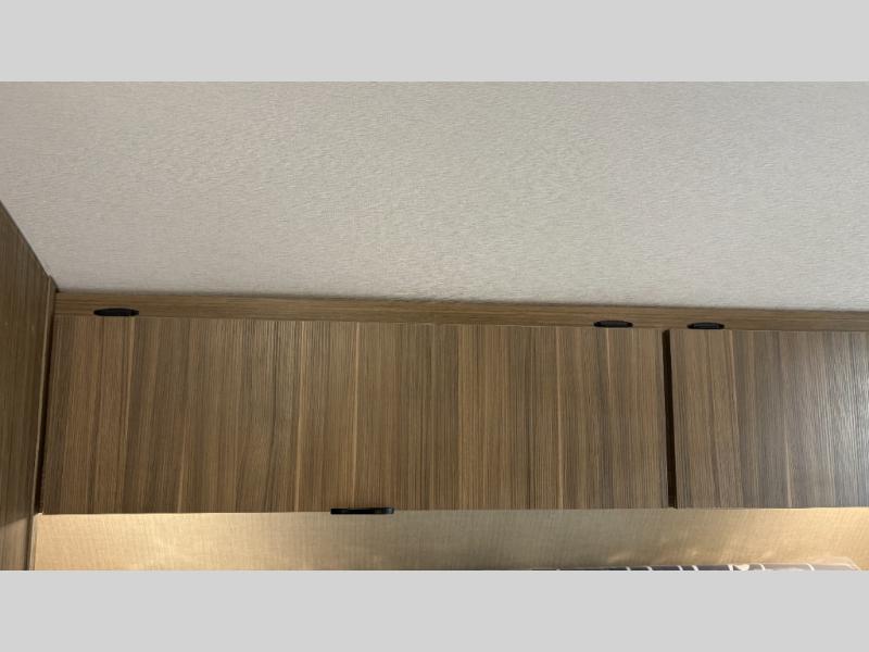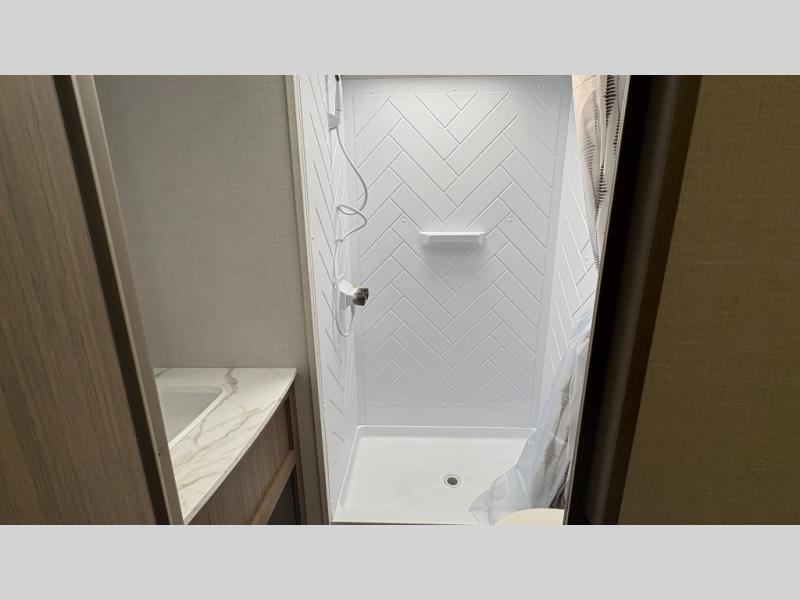 Your guests or older kids will love camping in this spacious travel trailer thanks to the rear bunk beds, each with their own private door! The front bedroom includes a Versa-Tilt custom king bed, a closet and overhead shelf for storage, and any other guests can sleep on the booth dinette and Versa-Lounge within the large slide out. The combined kitchen and living area also includes all the appliances to make meals each day, a booth dinette, and an entertainment center with a fireplace and hidden pantry. And don't overlook the full bath with a walk-in shower to easily clean up each day!