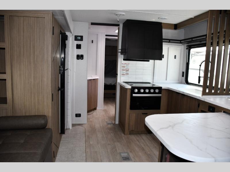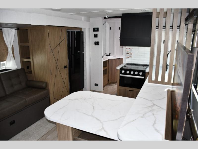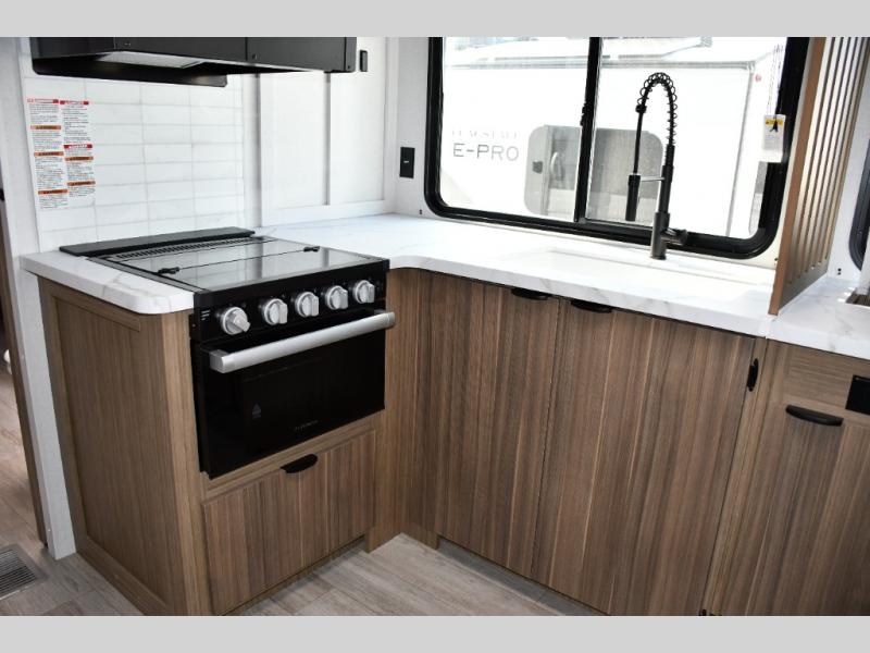 Includes a 3-burner cooktop, oven, microwave, deep sink with high-rise faucet, and an 11 cu. ft. 12V refrigerator so you can stock up and stay out longer -