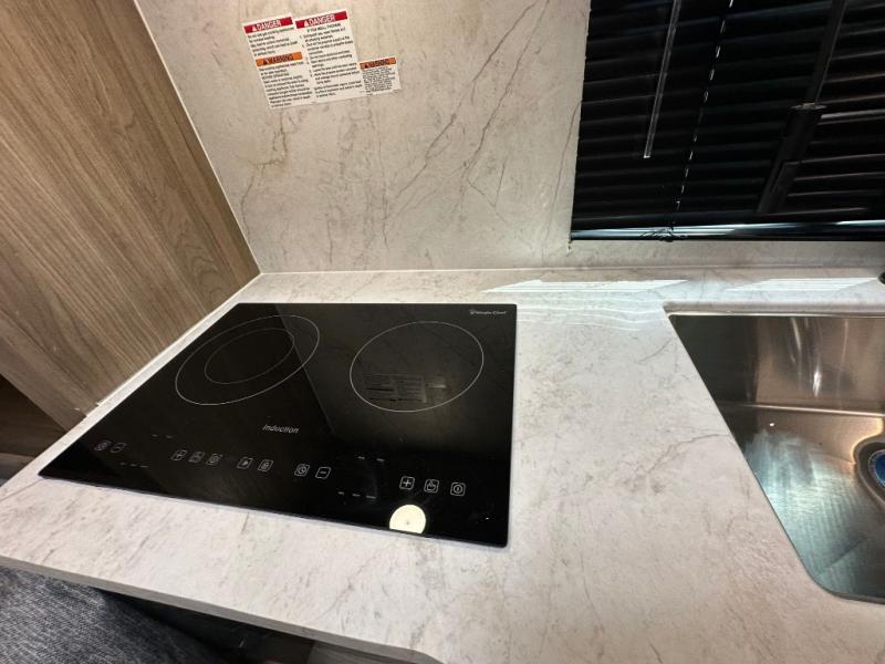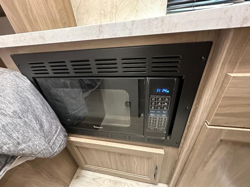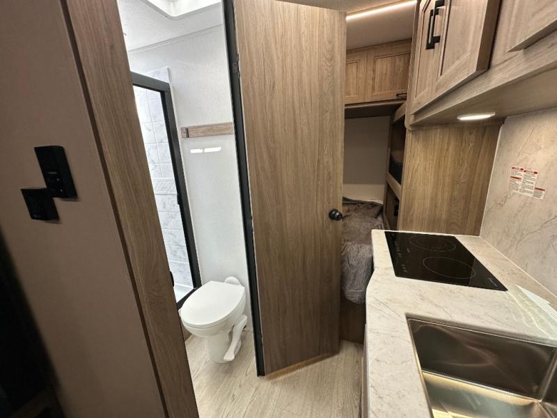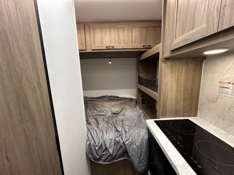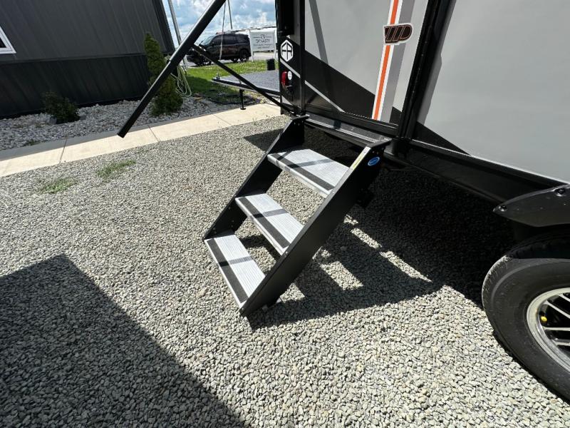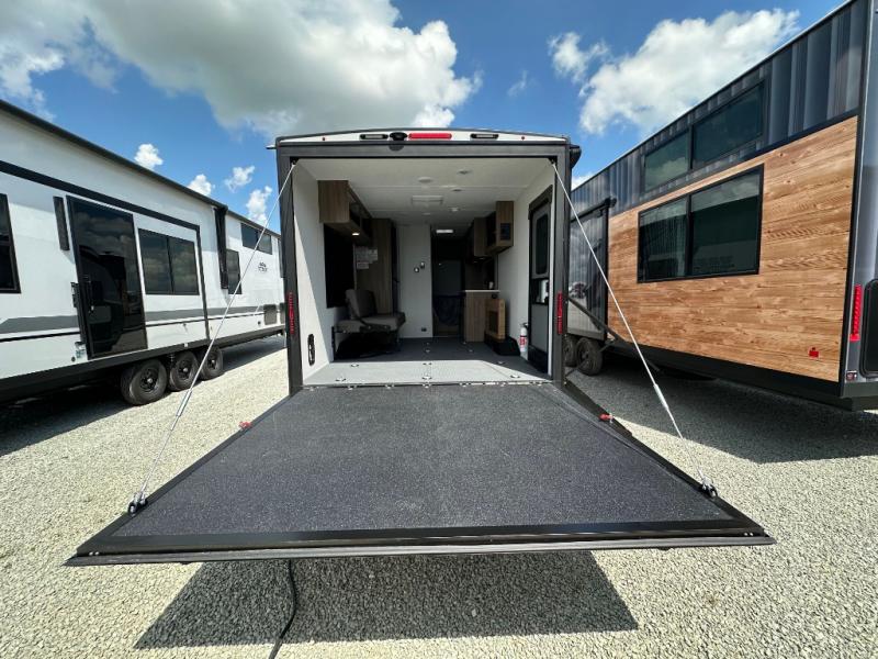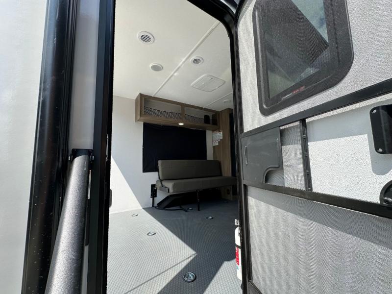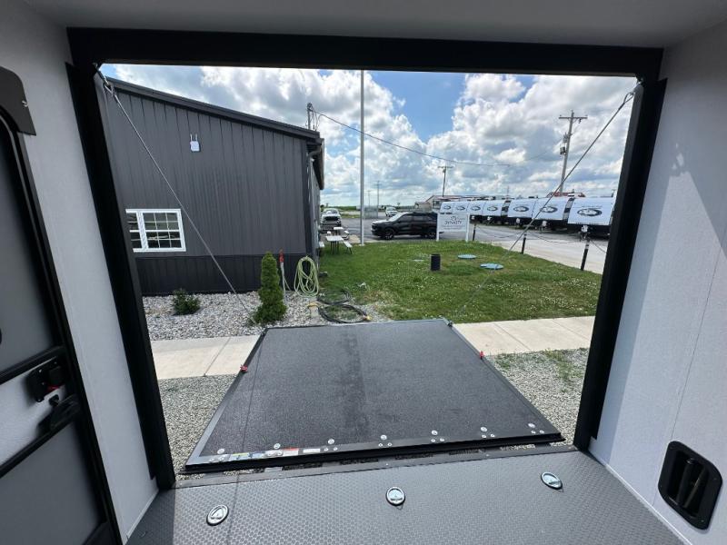 If you're looking for a more compact toy hauler, this one is perfect for three adventure-seeking campers. There is 11' 7" total garage space for your toys plus a ramp door for easy unloading. You can relax on the rollover sofa with a free-standing table once the toys are out of the way, and the 12V refrigerator is close by so you can grab a cold drink. The two burner cooktop and microwave oven will let you make meals each day, and the private bath lets you clean up without having to use the camp's facilities. After dinner, head outdoors to relax under the 12' power awning with an LED light strip!