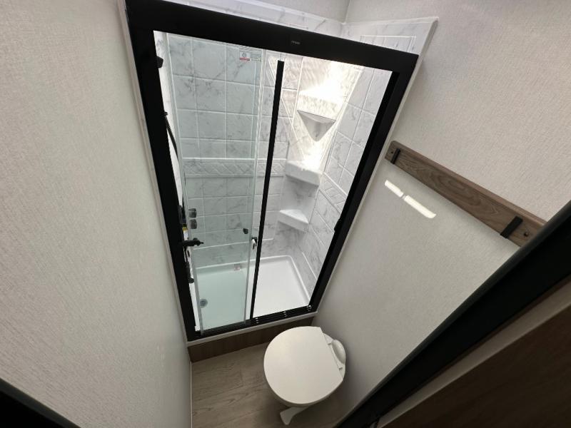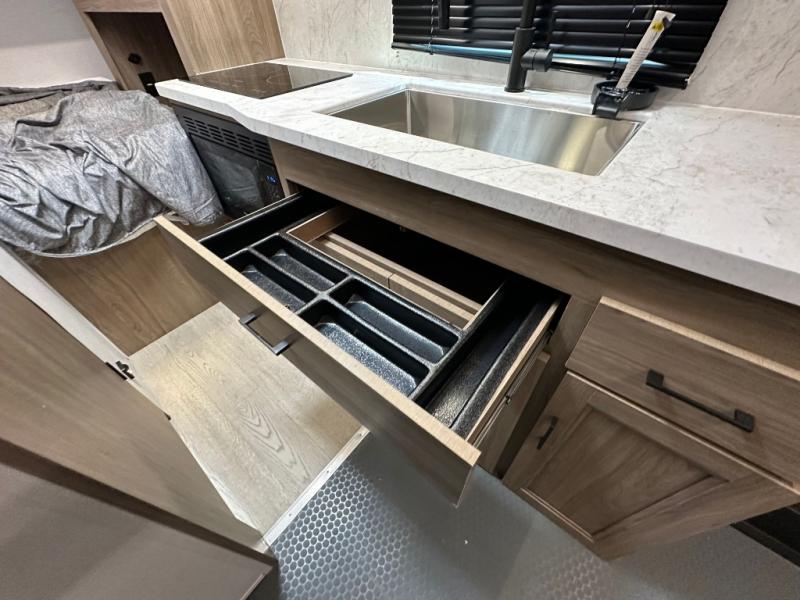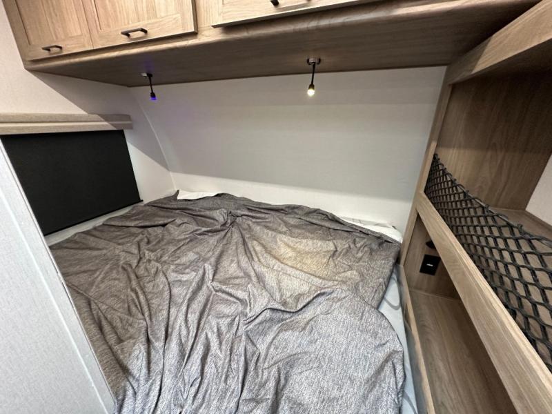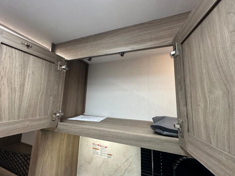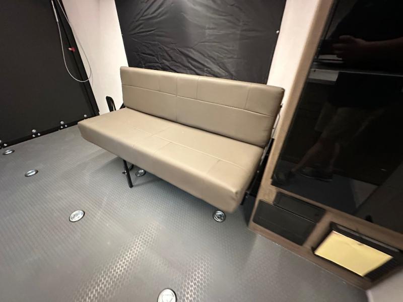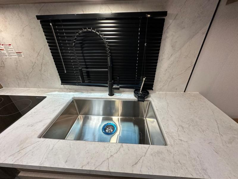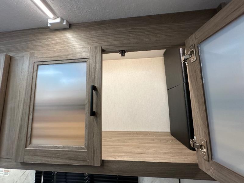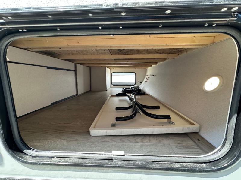 If you're looking for a more compact toy hauler, this one is perfect for three adventure-seeking campers. There is 11' 7" total garage space for your toys plus a ramp door for easy unloading. You can relax on the rollover sofa with a free-standing table once the toys are out of the way, and the 12V refrigerator is close by so you can grab a cold drink. The two burner cooktop and microwave oven will let you make meals each day, and the private bath lets you clean up without having to use the camp's facilities. After dinner, head outdoors to relax under the 12' power awning with an LED light strip!
